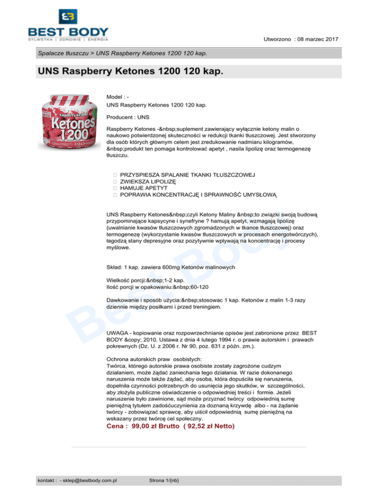 Utworzono : 08 marzec 2017 Spalacze tłuszczu > UNS Raspberry Ketones 1200 120 kap. UNS Raspberry Ketones 1200 120 kap. Model : UNS Raspberry Ketones 1200 120 kap. Producent : UNS Raspberry Ketones - suplement zawierający wyłącznie ketony malin o naukowo potwierdzonej skuteczności w redukcji tkanki tłuszczowej. Jest stworzony dla osób których głównym celem jest zredukowanie nadmiaru kilogramów, produkt ten pomaga kontrolować apetyt , nasila lipolizę oraz termogenezę tłuszczu. � PRZYSPIESZA SPALANIE TKANKI TŁUSZCZOWEJ � ZWIEKSZA LIPOLIZĘ � HAMUJE APETYT � POPRAWIA KONCENTRACJĘ I SPRAWNOŚĆ UMYSŁOWĄ y d UNS Raspberry Ketones czyli Ketony Maliny to związki swoją budową przypominające kapsycyne i synefryne ? hamują apetyt, wzmagają lipolizę (uwalnianie kwasów tłuszczowych zgromadzonych w tkance tłuszczowej) oraz termogenezę (wykorzystanie kwasów tłuszczowych w procesach energotwórczych), łagodzą stany depresyjne oraz pozytywnie wpływają na koncentrację i procesy myślowe. t s e B o B Skład: 1 kap. zawiera 600mg Ketonów malinowych Wielkość porcji: 1-2 kap. Ilość porcji w opakowaniu: 60-120 Dawkowanie i sposób użycia: stosowac 1 kap. Ketonów z malin 1-3 razy dziennie między posiłkami i przed treningiem. UWAGA - kopiowanie oraz rozpowrzechnianie opisów jest zabronione przez BEST BODY © 2010. Ustawa z dnia 4 lutego 1994 r. o prawie autorskim i prawach pokrewnych (Dz. U. z 2006 r. Nr 90, poz. 631 z późn. zm.). Ochrona autorskich praw osobistych: Twórca, którego autorskie prawa osobiste zostały zagrożone cudzym działaniem, może żądać zaniechania tego działania. W razie dokonanego naruszenia może także żądać, aby osoba, która dopuściła się naruszenia, dopełniła czynności potrzebnych do usunięcia jego skutków, w szczególności, aby złożyła publiczne oświadczenie o odpowiedniej treści i formie. Jeżeli naruszenie było zawinione, sąd może przyznać twórcy odpowiednią sumę pieniężną tytułem zadośćuczynienia za doznaną krzywdę albo - na żądanie twórcy - zobowiązać sprawcę, aby uiścił odpowiednią sumę pieniężną na wskazany przez twórcę cel społeczny. Cena : 99,00 zł Brutto ( 92,52 zł Netto) kontakt : - [email protected] Strona 1/{nb} Utworzono : 08 marzec 2017 Spalacze tłuszczu > UNS Raspberry Ketones 1200 120 kap. UNS Raspberry Ketones 1200 120 kap. Dostępność: Produkt dostępny w naszym sklepie od 29 maj 2013 t s e B kontakt : - [email protected] Strona 2/{nb} o B y d