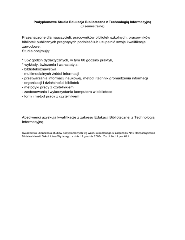 Podyplomowe Studia Edukacja Biblioteczna z Technologią Informacyjną (3 semestralne) Przeznaczone dla nauczycieli, pracowników bibliotek szkolnych, pracowników bibliotek publicznych pragnących podnieść lub uzupełnić swoje kwalifikacje zawodowe. Studia obejmują: * 352 godzin dydaktycznych, w tym 60 godziny praktyk, * wykłady, ćwiczenia i warsztaty z: - bibliotekoznawstwa - multimedialnych źródeł informacji - przetwarzania informacji naukowej, metod i technik gromadzenia informacji - organizacji i działalności bibliotek - metodyki pracy z czytelnikiem - zastosowania i wykorzystania komputera w bibliotece - form i metod pracy z czytelnikiem Absolwenci uzyskują kwalifikacje z zakresu Edukacji Bibliotecznej z Technologią Informacyjną. Świadectwo ukończenia studiów podyplomowych wg wzoru określonego w załączniku Nr.9 Rozporządzenia Ministra Nauki i Szkolnictwa Wyższego z dnia 19 grudnia 2008r. /Dz.U. Nr.11 poz.61 /.