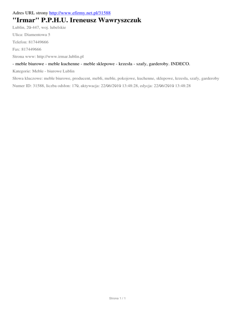 Adres URL strony http://www.efirmy.net.pl/31588 "Irmar" P.P.H.U. Ireneusz Wawryszczuk Lublin, 20-447, woj. lubelskie Ulica: Diamentowa 5 Telefon: 817449666 Fax: 817449666 Strona www: http://www.irmar.lublin.pl - meble biurowe - meble kuchenne - meble sklepowe - krzesła - szafy, garderoby. INDECO. Kategorie: Meble - biurowe Lublin Słowa kluczowe: meble biurowe, producent, mebli, meble, pokojowe, kuchenne, sklepowe, krzesła, szafy, garderoby Numer ID: 31588, liczba odsłon: 170, aktywacja: 22/06/2010 13:48:28, edycja: 22/06/2010 13:48:28 Strona 1 / 1