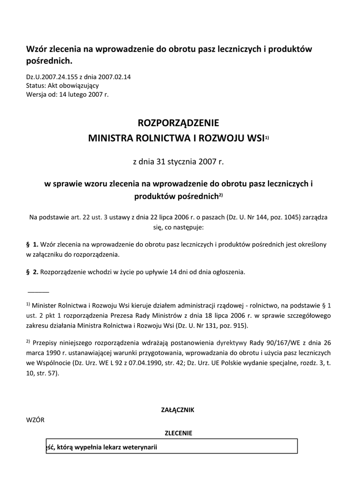 Wzór zlecenia na wprowadzenie do obrotu pasz leczniczych i produktów pośrednich. Dz.U.2007.24.155 z dnia 2007.02.14 Status: Akt obowiązujący Wersja od: 14 lutego 2007 r. ROZPORZĄDZENIE MINISTRA ROLNICTWA I ROZWOJU WSI1) z dnia 31 stycznia 2007 r. w sprawie wzoru zlecenia na wprowadzenie do obrotu pasz leczniczych i produktów pośrednich2) Na podstawie art. 22 ust. 3 ustawy z dnia 22 lipca 2006 r. o paszach (Dz. U. Nr 144, poz. 1045) zarządza się, co następuje: § 1. Wzór zlecenia na wprowadzenie do obrotu pasz leczniczych i produktów pośrednich jest określony w załączniku do rozporządzenia. § 2. Rozporządzenie wchodzi w życie po upływie 14 dni od dnia ogłoszenia. ______ 1) Minister Rolnictwa i Rozwoju Wsi kieruje działem administracji rządowej - rolnictwo, na podstawie § 1 ust. 2 pkt 1 rozporządzenia Prezesa Rady Ministrów z dnia 18 lipca 2006 r. w sprawie szczegółowego zakresu działania Ministra Rolnictwa i Rozwoju Wsi (Dz. U. Nr 131, poz. 915). 2) Przepisy niniejszego rozporządzenia wdrażają postanowienia dyrektywy Rady 90/167/WE z dnia 26 marca 1990 r. ustanawiającej warunki przygotowania, wprowadzania do obrotu i użycia pasz leczniczych we Wspólnocie (Dz. Urz. WE L 92 z 07.04.1990, str. 42; Dz. Urz. UE Polskie wydanie specjalne, rozdz. 3, t. 10, str. 57). ZAŁĄCZNIK WZÓR ZLECENIE A. Część, którą wypełnia lekarz weterynarii 1. Imię i nazwisko lekarza weterynarii wystawiającego zlecenie, adres zakładu 2. Kolejny lecznicznumer ego dla zwierząt oraz numer wpisu na listę lekarzy weterynarii posiadających prawo zlecenia wykonywania zawodu 3. Adres właściwego miejscowo dla danego stada zwierząt powiatowego lekarza 4. Data wetewystawienia rynarii zlecenia 5. Zlecam zastosowanie paszy leczniczej/produktu pośredniego* dla ........................................................................ ...................................................................................................................................................................... .................... (gatunek zwierząt i grupa technologiczna) w ilości ...................................................................................................................................................................... .. kg, (ilość paszy leczniczej/produktu pośredniego* w kg) z zastosowaniem premiksu leczniczego .......................................................................................................................... (nazwa premiksu leczniczego) 7. Średni wiek i średnia waga zwierząt, dla których 6. Liczba zwierząt, dla których jest przeznaczojest przena pasza lecznicza/produkt pośredni* znaczona pasza lecznicza/produkt pośredni* 8. Firma posiadacza zwierzęcia, dla którego jest przeznaczona pasza lecznicza/produkt pośredni *, jego siedziba i adres oraz oznaczenie formy prawnej prowadzonej działalności, a w przypadku osoby fizycznej - imię, nazwisko, miejsce zamieszkania i adres 11. Okres karencji 9. Wskazania lecznicze zastosowania paszy10. leczniczej Czas podawania paszy leczniczej paszy leczniczej 12.** Identyfikacja premiksów leczniczych wchodzących w skład paszy leczniczej/produktu pośredniego*: a) nazwa Lp. b) firma wytwórcy e) firma dostawcy premiksu premiksu leczniczego, c) numer leczniczego, jego siedziba premiksu jego siedziba i adres oraz leczniczego oznaczenie w Urzędowym formy prawnej Wykazie i adres oraz oznaczenie d) ilość premiksu leczniczego formy prawnej prowadzonej premiksu leczniczego, prowadzonej Produktów w paszy numer serii działalności, Leczniczych leczniczej/pro-działalności, i data ważności a w przypadku Dopuszczonych dukcie osoby fizycznej do Obrotu pośrednim* osoby fizycznej a w przypadku - imię, na terytorium - imię, nazwisko, Rzeczypospolitej nazwisko, miejsce Polskiej miejsce zamieszkania zamieszkania i adres i adres 13. Rodzaj paszy w paszy leczniczej/produkcie pośrednim* 14. Procentowy udział paszy leczniczej w dziennej dawce pokarmowej, która odpowiada co najmniej połowie dziennej dawki leczonego zwierzęcia lub, w przypadku przeżuwaczy, zapewniający co najmniej połowę dziennego zapotrzebowania zwierząt na niemineralną mieszankę uzupełniającą 15. Nazwa kokcydiostatyku stosowanego w paszy bytowej 16. Podpis posiadacza zwierzęcia, dla którego jest wystawione zlecenie, potwierdzający nazwę kokcydiostatyku stosowanego w paszy bytowej 17. Wskazania dotyczące stosowania paszy leczniczej: data rozpoczęcia i zakończenia podawania paszy leczniczej, przeciwwskazania, działania uboczne, interakcje z innymi środkami, inne wskazania ...................................................................................................................................................................... ..................... (podpis i pieczęć lekarza weterynarii wystawiającego zlecenie) B. Część, którą wypełnia wytwórca paszy leczniczej/produktu pośredniego * 18. Firma wytwórcy paszy leczniczej/produktu pośredniego* jego siedziba i adres oraz oznaczenie formy prawnej prowadzonej działalności, a w przypadku osoby fizycznej - imię i nazwisko oraz miejsce zamieszkania i adres 19. Data i miejsce wytworzenia paszy 20. Data wydania paszy leczniczej/produktu leczniczej/produktu pośredniego* 21. Okres trwałości paszy leczniczej pośredniego* 22. Imię i nazwisko osoby kierującej procesem produkcji paszy leczniczej/produktu pośredniego* .............................................................................................. 24. Numer partii wytworzonej paszy (podpis, pieczątka i data) leczniczej/produktu pośredniego* 23. Data i numer wydania przez wojewódzkiego leka- pokrywający rza weterynarii decyzji zatwierdzającej zakład do się z numerem pobranej próby wytwarzania pasz leczniczych przeznaczonych do obrotu i produktów pośrednich 25. Potwierdzam wydanie paszy leczniczej/produktu pośredniego* zgodnie ze zleceniem .....................................