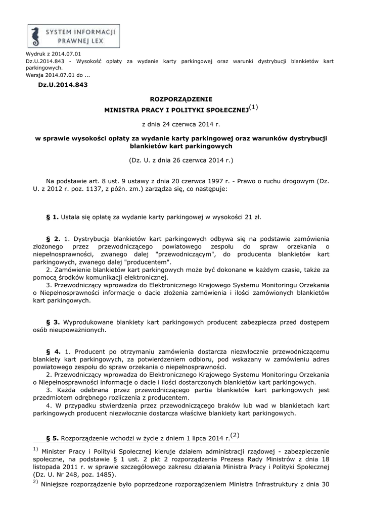 Wydruk z 2014.07.01 Dz.U.2014.843 - Wysokość opłaty za wydanie karty parkingowej oraz warunki dystrybucji blankietów kart parkingowych. Wersja 2014.07.01 do ... Dz.U.2014.843 ROZPORZĄDZENIE (1) MINISTRA PRACY I POLITYKI SPOŁECZNEJ z dnia 24 czerwca 2014 r. w sprawie wysokości opłaty za wydanie karty parkingowej oraz warunków dystrybucji blankietów kart parkingowych (Dz. U. z dnia 26 czerwca 2014 r.) Na podstawie art. 8 ust. 9 ustawy z dnia 20 czerwca 1997 r. - Prawo o ruchu drogowym (Dz. U. z 2012 r. poz. 1137, z późn. zm.) zarządza się, co następuje: § 1. Ustala się opłatę za wydanie karty parkingowej w wysokości 21 zł. § 2. 1. Dystrybucja blankietów kart parkingowych odbywa się na podstawie zamówienia złożonego przez przewodniczącego powiatowego zespołu do spraw orzekania o niepełnosprawności, zwanego dalej "przewodniczącym", do producenta blankietów kart parkingowych, zwanego dalej "producentem". 2. Zamówienie blankietów kart parkingowych może być dokonane w każdym czasie, także za pomocą środków komunikacji elektronicznej. 3. Przewodniczący wprowadza do Elektronicznego Krajowego Systemu Monitoringu Orzekania o Niepełnosprawności informacje o dacie złożenia zamówienia i ilości zamówionych blankietów kart parkingowych. § 3. Wyprodukowane blankiety kart parkingowych producent zabezpiecza przed dostępem osób nieupoważnionych. § 4. 1. Producent po otrzymaniu zamówienia dostarcza niezwłocznie przewodniczącemu blankiety kart parkingowych, za potwierdzeniem odbioru, pod wskazany w zamówieniu adres powiatowego zespołu do spraw orzekania o niepełnosprawności. 2. Przewodniczący wprowadza do Elektronicznego Krajowego Systemu Monitoringu Orzekania o Niepełnosprawności informacje o dacie i ilości dostarczonych blankietów kart parkingowych. 3. Każda odebrana przez przewodniczącego partia blankietów kart parkingowych jest przedmiotem odrębnego rozliczenia z producentem. 4. W przypadku stwierdzenia przez przewodniczącego braków lub wad w blankietach kart parkingowych producent niezwłocznie dostarcza właściwe blankiety kart parkingowych. (2) § 5. Rozporządzenie wchodzi w życie z dniem 1 lipca 2014 r. 1) Minister Pracy i Polityki Społecznej kieruje działem administracji rządowej - zabezpieczenie społeczne, na podstawie § 1 ust. 2 pkt 2 rozporządzenia Prezesa Rady Ministrów z dnia 18 listopada 2011 r. w sprawie szczegółowego zakresu działania Ministra Pracy i Polityki Społecznej (Dz. U. Nr 248, poz. 1485). 2) Niniejsze rozporządzenie było poprzedzone rozporządzeniem Ministra Infrastruktury z dnia 30 marca 2004 r. w sprawie wzorów kart parkingowych dla osób niepełnosprawnych i placówek zajmujących się opieką, rehabilitacją lub edukacją tych osób (Dz. U. Nr 67, poz. 616), które traci moc z dniem wejścia w życie niniejszego rozporządzenia, w związku z wejściem w życie ustawy z dnia 23 października 2013 r. o zmianie ustawy - Prawo o ruchu drogowym oraz niektórych innych ustaw (Dz. U. poz. 1446 oraz z 2014 r. poz. 486).