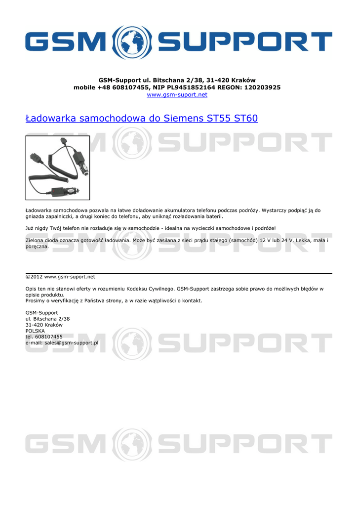 GSM-Support ul. Bitschana 2/38, 31-420 Kraków mobile +48 608107455, NIP PL9451852164 REGON: 120203925 www.gsm-suport.net Ładowarka samochodowa do Siemens ST55 ST60 Ładowarka samochodowa pozwala na łatwe doładowanie akumulatora telefonu podczas podróży. Wystarczy podpiąć ją do gniazda zapalniczki, a drugi koniec do telefonu, aby uniknąć rozładowania baterii. Już nigdy Twój telefon nie rozładuje się w samochodzie - idealna na wycieczki samochodowe i podróże! Zielona dioda oznacza gotowość ładowania. Może być zasilana z sieci prądu stałego (samochód) 12 V lub 24 V. Lekka, mała i poręczna. ©2012 www.gsm-suport.net Opis ten nie stanowi oferty w rozumieniu Kodeksu Cywilnego. GSM-Support zastrzega sobie prawo do możliwych błędów w opisie produktu. Prosimy o weryfikację z Państwa strony, a w razie wątpliwości o kontakt. GSM-Support ul. Bitschana 2/38 31-420 Kraków POLSKA tel. 608107455 e-mail: [email protected] Powered by TCPDF (www.tcpdf.org)