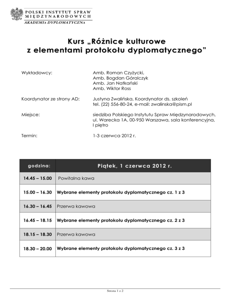 AKADEMI A DYPLOMATYCZN A Kurs „Różnice kulturowe z elementami protokołu dyplomatycznego” Wykładowcy: Amb. Roman Czyżycki, Amb. Bogdan Góralczyk Amb. Jan Natkański Amb. Wiktor Ross Koordynator ze strony AD: Justyna Zwalińska, Koordynator ds. szkoleń tel. (22) 556-80-24, e-mail: [email protected] Miejsce: siedziba Polskiego Instytutu Spraw Międzynarodowych, ul. Warecka 1A, 00-950 Warszawa, sala konferencyjna, I piętro Termin: 1-3 czerwca 2012 r. Piątek, 1 czerwca 2012 r. godzina: 14.45 – 15.00 Powitalna kawa 15.00 – 16.30 Wybrane elementy protokołu dyplomatycznego cz. 1 z 3 16.30 – 16.45 Przerwa kawowa 16.45 – 18.15 Wybrane elementy protokołu dyplomatycznego cz. 2 z 3 18.15 – 18.30 Przerwa kawowa 18.30 – 20.00 Wybrane elementy protokołu dyplomatycznego cz. 3 z 3 Strona 1 z 2 Sobota, 2 czerwca 2012 r. godzina: 8.45 – 9.00 Poranna kawa 9.00 – 10.30 Bliski Wschód cz. 1 z 2 10.30 – 10.45 Przerwa kawowa 10.45 – 12.15 Bliski Wschód cz. 2 z 2 12.15 – 12.30 Przerwa kawowa 12.30 – 14.00 Ameryka Łacińska 14.00 – 14.45 Lunch 14.45 – 16.15 Rosja i obszar postsowiecki cz. 1 z 2 16.15 – 16.30 Przerwa kawowa 16.30 – 18.00 Rosja i obszar postsowiecki cz. 2 z 2 Niedziela, 3 czerwca 2012 r. godzina: 8.30 – 8.45 Poranna kawa 8.45 – 10.15 Azja ze szczególnym uwzględnieniem Chin cz. 1 z 2 10.15 – 10.30 Przerwa kawowa 10.30 – 12.00 Azja ze szczególnym uwzględnieniem Chin cz. 2 z 2 Strona 2 z 2