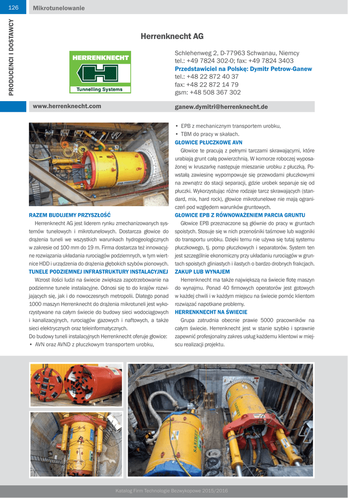 Mikrotunelowanie PRODUCENCI I DOSTAWCY 126 Herrenknecht AG Schlehenweg 2, D-77963 Schwanau, Niemcy tel.: +49 7824 302-0; fax: +49 7824 3403 Przedstawiciel na Polskę: Dymitr Petrow-Ganew tel.: +48 22 872 40 37 fax: +48 22 872 14 79 gsm: +48 508 367 302 www.herrenknecht.com [email protected] RAZEM BUDUJEMY PRZYSZŁOŚĆ Herrenknecht AG jest liderem rynku zmechanizowanych systemów tunelowych i mikrotunelowych. Dostarcza głowice do drążenia tuneli we wszystkich warunkach hydrogeologicznych w zakresie od 100 mm do 19 m. Firma dostarcza też innowacyjne rozwiązania układania rurociągów podziemnych, w tym wiertnice HDD i urządzenia do drążenia głębokich szybów pionowych. TUNELE PODZIEMNEJ INFRASTRUKTURY INSTALACYJNEJ Wzrost ilości ludzi na świecie zwiększa zapotrzebowanie na podziemne tunele instalacyjne. Odnosi się to do krajów rozwijających się, jak i do nowoczesnych metropolii. Dlatego ponad 1000 maszyn Herrenknecht do drążenia mikrotuneli jest wykorzystywane na całym świecie do budowy sieci wodociągowych i kanalizacyjnych, rurociągów gazowych i naftowych, a także sieci elektrycznych oraz teleinformatycznych. Do budowy tuneli instalacyjnych Herrenknecht oferuje głowice: • AVN oraz AVND z płuczkowym transportem urobku, • EPB z mechanicznym transportem urobku, • TBM do pracy w skałach. GŁOWICE PŁUCZKOWE AVN Głowice te pracują z pełnymi tarczami skrawającymi, które urabiają grunt całą powierzchnią. W komorze roboczej wyposażonej w kruszarkę następuje mieszanie urobku z płuczką. Powstałą zawiesinę wypompowuje się przewodami płuczkowymi na zewnątrz do stacji separacji, gdzie urobek separuje się od płuczki. Wykorzystując różne rodzaje tarcz skrawających (standard, mix, hard rock), głowice mikrotunelowe nie mają ograniczeń pod względem warunków gruntowych. GŁOWICE EPB Z RÓWNOWAŻENIEM PARCIA GRUNTU Głowice EPB przeznaczone są głównie do pracy w gruntach spoistych. Stosuje się w nich przenośniki taśmowe lub wagoniki do transportu urobku. Dzięki temu nie używa się tutaj systemu płuczkowego, tj. pomp płuczkowych i separatorów. System ten jest szczególnie ekonomiczny przy układaniu rurociągów w gruntach spoistych gliniastych i ilastych o bardzo drobnych frakcjach. ZAKUP LUB WYNAJEM Herrenknecht ma także największą na świecie flotę maszyn do wynajmu. Ponad 40 firmowych operatorów jest gotowych w każdej chwili i w każdym miejscu na świecie pomóc klientom rozwiązać napotkane problemy. HERRENKNECHT NA ŚWIECIE Grupa zatrudnia obecnie prawie 5000 pracowników na całym świecie. Herrenknecht jest w stanie szybko i sprawnie zapewnić profesjonalny zakres usług każdemu klientowi w miejscu realizacji projektu. Katalog Firm Technologie Bezwykopowe 2015/2016 Horyzontalne przewierty kierunkowe HDD Schlehenweg 2, D-77963 Schwanau, Niemcy tel.: +49 7824 302-0; fax: +49 7824 3403 Przedstawiciel na Polskę: Dymitr Petrow-Ganew tel.: +48 22 872 40 37 fax: +48 22 872 14 79 gsm: +48 508 367 302 www.herrenknecht.com [email protected] obrotowym od 60 kNm do 148 kNm. Urządzenia produkowane są w następujących wersjach: • na naczepach, • na gąsienicach, • wiertnice ramowe, • wiertnice modułowe. O FIRMIE Firma Herrenknecht AG, będąca technologicznym liderem na rynku zmechanizowanych systemów tunelowych, oferuje ekonomiczny, szybki i bezpieczny sposób instalacji infrastruktury metodą horyzontalnego przewiertu sterowanego (HDD) pod wszelkiego rodzaju przeszkodami, takimi jak: góry, rzeki, drogi, tory kolejowe czy też obszary chronione. Herrenknecht zapewnia innowacyjne rozwiązania techniczne do wykonywania horyzontalnych przewiertów sterowanych (HDD) oraz drążenia pochyłych wierceń kierunkowych (SDD). Ciekawym i sprawdzonym rozwiązaniem oferowanym przez firmę jest technologia „Direct Pipe”, stanowiąca połączenie metody HDD z mikrotunelowaniem. Najnowszą oferowaną obecnie technologią jest Pipe Express. W ofercie firmy znajdują się wiertnice HDD wielkości Maxi i Mega o sile uciągu od 1000 kN do 6000 kN i momencie Wszystkie urządzenia są dostosowane do indywidualnych uwag i wymagań klientów. Oferta firmy obejmuje najwyższej jakości urządzenia dodatkowe HDD, takie jak pompy płuczkowe wysokiego ciśnienia, mieszalniki płuczki, separatory oraz urządzenia „Pipe Thruster”, wspomagające wiertnicę dodatkową siłą pchania/uciągu w przedziale od 300 do 750 ton. Na całym świecie przy budowie sieci wodociągowych i kanalizacyjnych, rurociągów gazowych oraz naftowych, a także sieci elektrycznych, internetowych czy telefonicznych pracuje ponad 150 wiertnic HDD firmy Herrenknecht. Za pomocą wiertnic Herrenknecht zostało bezpiecznie zainstalowanych tysiące kilometrów rurociągów różnych średnic i przeznaczenia na całym świecie. HERRENKNECHT NA ŚWIECIE Obecnie firma zatrudnia blisko 5000 pracowników na całym świecie. Wraz z 78 spółkami zależnymi i stowarzyszonymi jest w stanie szybko i sprawnie zapewnić profesjonalny zakres usług każdemu klientowi w miejscu realizacji projektu. Katalog Firm Technologie Bezwykopowe 2015/2016 PRODUCENCI I DOSTAWCY Herrenknecht AG 133 Tunele / Maszyny, urządzenia PRODUCENCI I DOSTAWCY 110 Herrenknecht AG Schlehenweg 2, D-77963 Schwanau, Niemcy tel.: +49 7824 302-0; fax: +49 7824 3403 Przedstawiciel na Polskę: Dymitr Petrow-Ganew tel.: +48 22 872 40 37 fax: +48 22 872 14 79 gsm: +48 508 367 302 www.herrenknecht.com [email protected] Herrenknecht zapewnia innowacyjne rozwiązania techniczne do drążenia głębokich szybów pionowych i pochyłych. Ponadto produkuje najnowocześniejsze platformy wiertnicze do wykonywania wierceń na głębokość do 8000 m oraz urządzenia do poszukiwania źródeł energii geotermalnej. Firma Herrenknecht AG, będąca technologicznym liderem na rynku zmechanizowanych systemów tunelowych, jako jedyna na świecie dostarcza najnowocześniejsze głowice do drążenia tuneli, przeznaczone do pracy w
