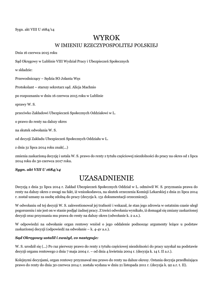Sygn. akt VIII U 1684/14 WYROK W IMIENIU RZECZYPOSPOLITEJ POLSKIEJ Dnia 16 czerwca 2015 roku Sąd Okręgowy w Lublinie VIII Wydział Pracy i Ubezpieczeń Społecznych w składzie: Przewodniczący – Sędzia SO Jolanta Węs Protokolant – starszy sekretarz sąd. Alicja Machnio po rozpoznaniu w dniu 16 czerwca 2015 roku w Lublinie sprawy W. S. przeciwko Zakładowi Ubezpieczeń Społecznych Oddziałowi w L. o prawo do renty na dalszy okres na skutek odwołania W. S. od decyzji Zakładu Ubezpieczeń Społecznych Oddziału w L. z dnia 31 lipca 2014 roku znak(...) zmienia zaskarżoną decyzję i ustala W. S. prawo do renty z tytułu częściowej niezdolności do pracy na okres od 1 lipca 2014 roku do 30 czerwca 2017 roku. Sygn. akt VIII U 1684/14 UZASADNIENIE Decyzją z dnia 31 lipca 2014 r. Zakład Ubezpieczeń Społecznych Oddział w L. odmówił W. S. przyznania prawa do renty na dalszy okres z uwagi na fakt, iż wnioskodawca, na skutek orzeczenia Komisji Lekarskiej z dnia 21 lipca 2014 r. został uznany za osobę zdolną do pracy (decyzja k. 131 dokumentacji orzeczniczej). W odwołaniu od tej decyzji W. S. zakwestionował jej trafność i wskazał, że stan jego zdrowia w ostatnim czasie uległ pogorszeniu i nie jest on w stanie podjąć żadnej pracy. Z treści odwołania wynikało, iż domagał się zmiany zaskarżonej decyzji oraz przyznania mu prawa do renty na dalszy okres (odwołanie k. 2 a.s.). W odpowiedzi na odwołanie organ rentowy wniósł o jego oddalenie podnosząc argumenty leżące u podstaw zaskarżonej decyzji (odpowiedź na odwołanie – k. 4-4v a.s.). Sąd Okręgowy ustalił i zważył, co następuje: W. S. urodził się (...) Po raz pierwszy prawo do renty z tytułu częściowej niezdolności do pracy uzyskał na podstawie decyzji organu rentowego z dnia 7 maja 2004 r. – od dnia 4 kwietnia 2004 r. (decyzja k. 14 t. II a.r.). Kolejnymi decyzjami, organ rentowy przyznawał mu prawo do renty na dalsze okresy. Ostania decyzja przedłużająca prawo do renty do dnia 30 czerwca 2014 r. została wydana w dniu 21 listopada 2011 r. (decyzja k. 92 a.r. t. II). Badający W. S. w dniu 10 czerwca 2014 r. Lekarz Orzecznik ZUS rozpoznał: chorobę niedokrwienną serca CCSII, stan po zawale mięśnia serca w 1997 r., stan po nieskutecznej rekanalizacji PTW w 2003 r. (zamknięcie w proksymalnym odcinku), zmiany zwyrodnieniowe kręgosłupa L-S z zespołem bólowo – korzeniowym oraz przerost prostaty (dokumentacja lekarska) i stwierdził, że odwołujący się jest nadal częściowo niezdolny do pracy do dnia 30 czerwca 2017 r. (dokumentacja orzecznicza k. 121). Na skutek zgłoszenia zarzutu wadliwości orzeczenia przez Naczelnego Lekarza ZUS sprawa została skierowana do Komisji Lekarskiej. Komisja, po przeprowadzeniu badania odwołującego się w dniu 21 lipca 2014 r. rozpoznała: stabilną dusznicę bolesną CCS I/II, chorobę niedokrwienną serca 1-naczyniową po nieskutecznej próbie rekanalizacji RCA w 2003 r., stan po przebytym zawale mięśnia serca w 1997 r., nadciśnienie tętnicze, dyslipidemię, dnę moczanową, przerost gruczołu krokowego, zmiany zwyrodnieniowe kręgosłupa z okresową niewydolnością bólową (dokumentacja lekarska) i stwierdziła, że skarżący nie jest osobą niezdolną do pracy (dokumentacja orzecznicza k. 129). Powyższe orzeczenie stało się podstawą wydania zaskarżonej w przedmiotowej sprawie decyzji (decyzja – dokumentacja orzecznicza k. 131). W przedmiotowej sprawie kwestią sporną było ustalenie, czy wnioskodawca jest nadal niezdolny do pracy. Z uwagi na to, iż ustalenie tego faktu wymagało wiadomości specjalnych, Sąd orzekający dopuścił dowód z opinii biegłych lekarzy z zakresu kardiologii, neurologii, urologii i pulmonologii (k. 6-6v a.s.). W opinii z dnia 15 września 2014 r. biegli: neurolog dr A. S., kardiolog dr J. M. (1), urolog dr W. L., pulmonolog dr J. M. (2) rozpoznali u badanego: chorobę niedokrwienną serca jednonaczyniową, przebyty zawał mięśnia sercowego w 1997 r., nieskuteczną rekanalizację prawej tętnicy wieńcowej w odcinku proksymalnym (przebyty zwał mięśnia serca), pojedyncze zwłóknienia płuca lewego, łagodny przerost gruczołu krokowego z pęcherzem nadreaktywnym neurogennym, zmiany zwyrodnieniowe kręgosłupa z protruzją dysków na trzech poziomach, zespół bólowy kręgosłupa LS w wywiadzie i nie stwierdzili niezdolności do pracy. W uzasadnieniu biegli wskazali, że choroba niedokrwienna serca ma stabilny przebieg, nie ma od dwóch lat konieczności wykonywania inwazyjnych badań i zabiegów na naczyniach wieńcowych. Zmiany w płucach nie wymagają aktualnie leczenia, winny być jedynie kontrolowane w badaniu rtg klatki piersiowej raz na dwa lata, bądź też w sytuacji zaostrzenia dolegliwości. Schorzenia urologiczne oraz neurologiczne również nie powodują niezdolności do pracy; układ nerwowy nie wykazuje cech uszkodzenia czy też objawów ubytkowych (opinia k. 18 a.s.). Do powyższej opinii biegłych wnioskodawca złożył zastrzeżenia wskazując, iż biegli nie wyjaśnili w opinii, na czym po 10 latach polega poprawa stanu jego zdrowia. Wniósł o dopuszczenie dowodu z opinii innego zespołu biegłych sądowych (zastrzeżenia do opinii k. 30 a.s.). Postanowieniem z dnia 3 listopada 2014 r. Sąd Okręgowy dopuścił dowód z opinii innego zespołu biegłych sądowych – kardiologa, neurologa i pulmonologa (k. 32-33 a.s.). W opinii z dnia 16 grudnia 2014 r. biegli: specjalista chorób płuc dr M. S., neurolog dr P. W., kardiolog dr M. O. rozpoznali u skarżącego: chorobę wieńcową jednonaczyniową – okluzję prawej tętnicy wieńcowej w odcinku początkowym, nieskuteczną próbę udrożnienie prawej tętnicy wieńcowej w 2003 r., przebyty zawał serca w 1997 r., nadciśnienie tętnicze, zaburzenia gospodarki lipidowej, zespół bólowo – korzeniowy kręgosłupa lędźwiowo – krzyżowego na podłożu zmian zwyrodnieniowo – wytwórczych i dyskopatycznych, stan po 