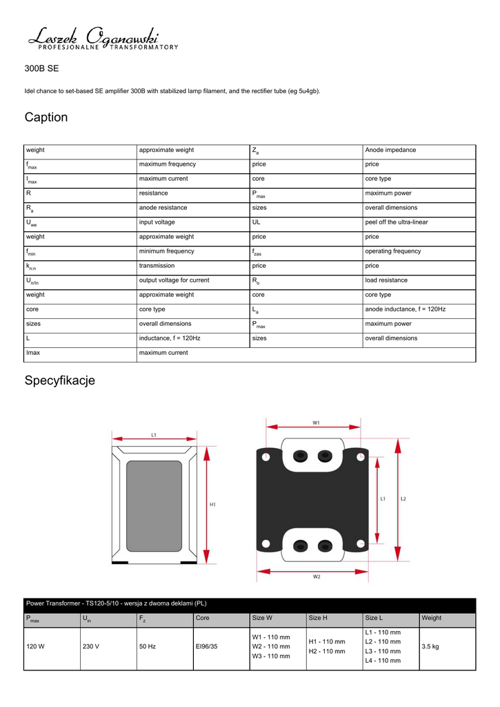 300B SE Idel chance to set-based SE amplifier 300B with stabilized lamp filament, and the rectifier tube (eg 5u4gb). Caption weight approximate weight Za Anode impedance fmax maximum frequency price price Imax maximum current core core type R resistance Pmax maximum power Ra anode resistance sizes overall dimensions Uwe input voltage UL peel off the ultra-linear weight approximate weight price price fmin minimum frequency fzas operating frequency kn:n transmission price price Un/In output voltage for current Ro load resistance weight approximate weight core core type core core type La anode inductance, f = 120Hz sizes overall dimensions Pmax maximum power L inductance, f = 120Hz sizes overall dimensions Imax maximum current Specyfikacje Power Transformer - TS120-5/10 - wersja z dwoma deklami (PL) Pmax 120 W Uin 230 V Fz 50 Hz Core Size W Size H Size L Weight EI96/35 W1 - 110 mm W2 - 110 mm W3 - 110 mm H1 - 110 mm H2 - 110 mm L1 - 110 mm L2 - 110 mm L3 - 110 mm L4 - 110 mm 3.5 kg Ua1 Ua2 Ua3 Ua4 Ua5 Ua6 Ua7 Ua8 400-380-0-380-400/0.2A 6.3V/1A 8V/2A 5V/3A - - - - Osłona Count - 2 Power Transformer - TS120-5/10 - wersja z dwoma deklami (DE) Pmax Uin Fz Core Size W Size H Size L Weight H1 - 110 mm H2 - 110 mm L1 - 110 mm L2 - 110 mm L3 - 110 mm L4 - 110 mm 3.5 kg 120 W 230 V 50 Hz EI96/35 W1 - 110 mm W2 - 110 mm W3 - 110 mm Ua1 Ua2 Ua3 Ua4 Ua5 Ua6 Ua7 Ua8 400-380-0-380-400/0.2A 6.3V/1A 8V/2A 5V/3A - - - - Osłona Count - 2 Choke - D8-1 - wersja z dwoma deklami L 8H R 80 Ω Imax 0.15mA mA Core Size W Size H Size L Weight Count EI66/32 W1 - 110 mm W2 - 110 mm W3 - 110 mm H1 - 110 mm H2 - 110 mm L1 - 110 mm L2 - 110 mm L3 - 110 mm L4 - 110 mm 1.2 kG 2