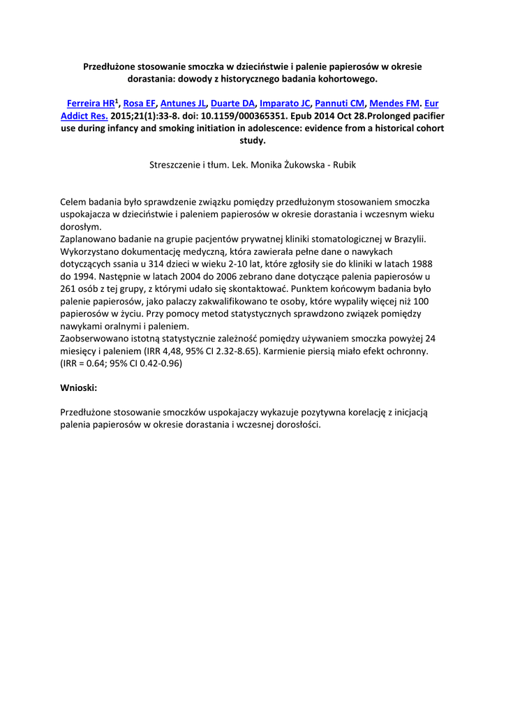 Przedłużone stosowanie smoczka w dzieciństwie i palenie papierosów w okresie dorastania: dowody z historycznego badania kohortowego. Ferreira HR1, Rosa EF, Antunes JL, Duarte DA, Imparato JC, Pannuti CM, Mendes FM. Eur Addict Res. 2015;21(1):33-8. doi: 10.1159/000365351. Epub 2014 Oct 28.Prolonged pacifier use during infancy and smoking initiation in adolescence: evidence from a historical cohort study. Streszczenie i tłum. Lek. Monika Żukowska - Rubik Celem badania było sprawdzenie związku pomiędzy przedłużonym stosowaniem smoczka uspokajacza w dzieciństwie i paleniem papierosów w okresie dorastania i wczesnym wieku dorosłym. Zaplanowano badanie na grupie pacjentów prywatnej kliniki stomatologicznej w Brazylii. Wykorzystano dokumentację medyczną, która zawierała pełne dane o nawykach dotyczących ssania u 314 dzieci w wieku 2-10 lat, które zgłosiły sie do kliniki w latach 1988 do 1994. Następnie w latach 2004 do 2006 zebrano dane dotyczące palenia papierosów u 261 osób z tej grupy, z którymi udało się skontaktować. Punktem końcowym badania było palenie papierosów, jako palaczy zakwalifikowano te osoby, które wypaliły więcej niż 100 papierosów w życiu. Przy pomocy metod statystycznych sprawdzono związek pomiędzy nawykami oralnymi i paleniem. Zaobserwowano istotną statystycznie zależność pomiędzy używaniem smoczka powyżej 24 miesięcy i paleniem (IRR 4,48, 95% CI 2.32-8.65). Karmienie piersią miało efekt ochronny. (IRR = 0.64; 95% CI 0.42-0.96) Wnioski: Przedłużone stosowanie smoczków uspokajaczy wykazuje pozytywna korelację z inicjacją palenia papierosów w okresie dorastania i wczesnej dorosłości.
