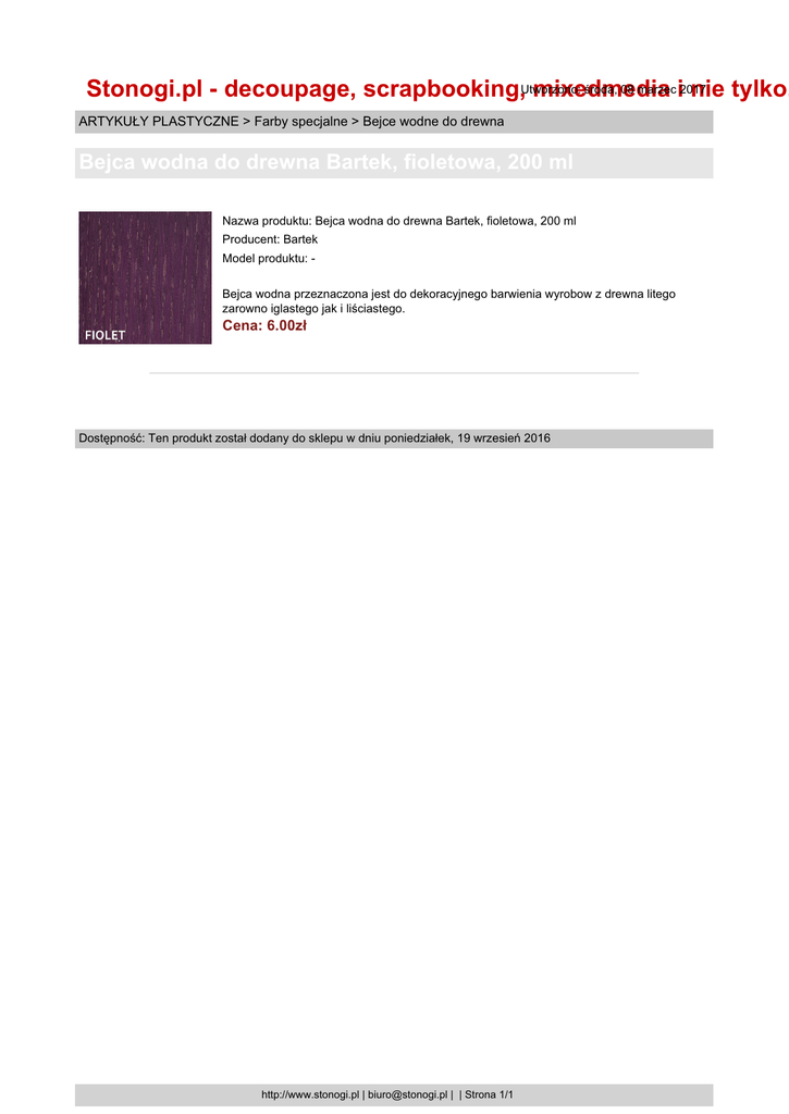 środa, 08 marzec i2017 Stonogi.pl - decoupage, scrapbooking,Utworzono: mixedmedia nie tylko. ARTYKUŁY PLASTYCZNE > Farby specjalne > Bejce wodne do drewna Bejca wodna do drewna Bartek, fioletowa, 200 ml Nazwa produktu: Bejca wodna do drewna Bartek, fioletowa, 200 ml Producent: Bartek Model produktu: Bejca wodna przeznaczona jest do dekoracyjnego barwienia wyrobow z drewna litego zarowno iglastego jak i liściastego. Cena: 6.00zł Dostępność: Ten produkt został dodany do sklepu w dniu poniedziałek, 19 wrzesień 2016 http://www.stonogi.pl | [email protected] | | Strona 1/1