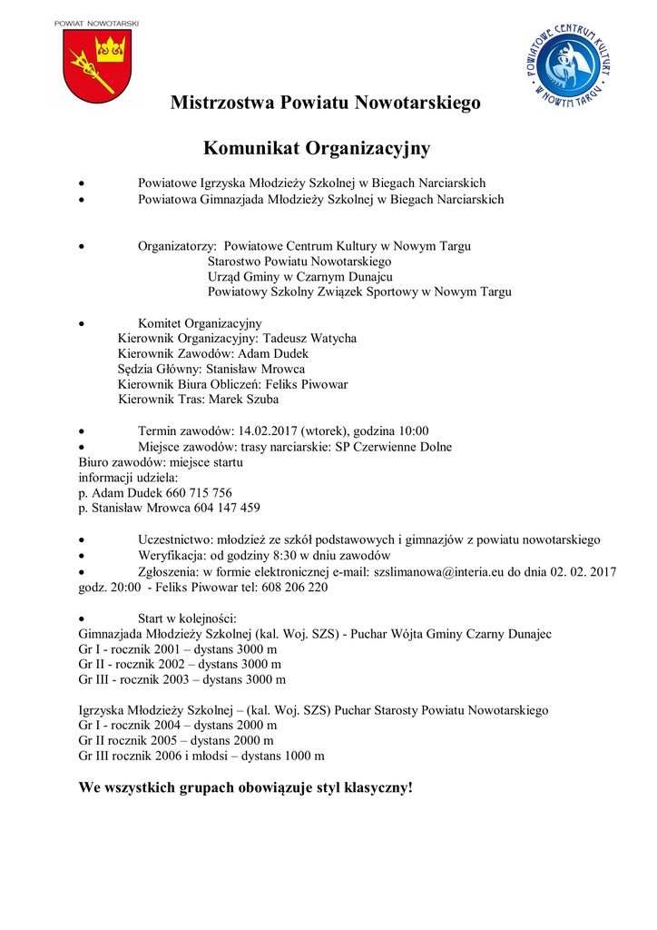 Mistrzostwa Powiatu Nowotarskiego Komunikat Organizacyjny Powiatowe Igrzyska Młodzieży Szkolnej w Biegach Narciarskich Powiatowa Gimnazjada Młodzieży Szkolnej w Biegach Narciarskich Organizatorzy: Powiatowe Centrum Kultury w Nowym Targu Starostwo Powiatu Nowotarskiego Urząd Gminy w Czarnym Dunajcu Powiatowy Szkolny Związek Sportowy w Nowym Targu Komitet Organizacyjny Kierownik Organizacyjny: Tadeusz Watycha Kierownik Zawodów: Adam Dudek Sędzia Główny: Stanisław Mrowca Kierownik Biura Obliczeń: Feliks Piwowar Kierownik Tras: Marek Szuba Termin zawodów: 14.02.2017 (wtorek), godzina 10:00 Miejsce zawodów: trasy narciarskie: SP Czerwienne Dolne Biuro zawodów: miejsce startu informacji udziela: p. Adam Dudek 660 715 756 p. Stanisław Mrowca 604 147 459 Uczestnictwo: młodzież ze szkół podstawowych i gimnazjów z powiatu nowotarskiego Weryfikacja: od godziny 8:30 w dniu zawodów Zgłoszenia: w formie elektronicznej e-mail: [email protected] do dnia 02. 02. 2017 godz. 20:00 - Feliks Piwowar tel: 608 206 220 Start w kolejności: Gimnazjada Młodzieży Szkolnej (kal. Woj. SZS) - Puchar Wójta Gminy Czarny Dunajec Gr I - rocznik 2001 – dystans 3000 m Gr II - rocznik 2002 – dystans 3000 m Gr III - rocznik 2003 – dystans 3000 m Igrzyska Młodzieży Szkolnej – (kal. Woj. SZS) Puchar Starosty Powiatu Nowotarskiego Gr I - rocznik 2004 – dystans 2000 m Gr II rocznik 2005 – dystans 2000 m Gr III rocznik 2006 i młodsi – dystans 1000 m We wszystkich grupach obowiązuje styl klasyczny! Nagrody: indywidualnie - I – III miejsce medale I – VI miejsce dyplomy zespołowo I – III miejsce puchary I – VI miejsce dyplomy Punktacja szkół łączna dziewcząt i chłopców wg. klucza: I miejsce -13pkt, II miejsce -11pkt, III miejsce -10pkt, …., XII miejsce -1pkt. Postanowienia końcowe: Zawody zostaną przeprowadzone zgodnie z regulaminem NRS, SZS i programem zawodów. Ostateczna interpretacja regulaminu należy do Jury Zawodów. Organizator zastrzega sobie prawo zmiany miejsca i terminu zawodów, organizator nie ponosi odpowiedzialności za wypadki mogące zaistnieć podczas zawodów. Za niesportowe zachowanie ucznia na zawodach lub jego opiekuna czy rodzica grozi im dyskwalifikacja (szczególnie za tzw. podciąganie na trasie) oraz kary przewidziane w NRS. Uczeń/ szkoła winni być obecnie na uroczystym zakończeniu zawodów, w wypadku ich nieobecności planowana nagroda przepada (nie zostanie wręczona osobom postronnym) Zapraszamy zainteresowane szkoły do wzięcia udziału w zawodach. Prosimy zainteresowane szkoły o kontakt telefoniczny – na wypadek niekorzystnych warunków atmosferycznych. p. Adam Dudek 660 715 756 p. Stanisław Mrowca 604 147 459 Organizator