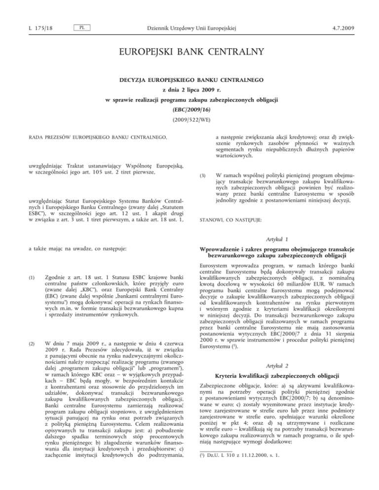 L 175/18 PL Dziennik Urzędowy Unii Europejskiej 4.7.2009 EUROPEJSKI BANK CENTRALNY DECYZJA EUROPEJSKIEGO BANKU CENTRALNEGO z dnia 2 lipca 2009 r. w sprawie realizacji programu zakupu zabezpieczonych obligacji (EBC/2009/16) (2009/522/WE) a następnie zwiększania akcji kredytowej; oraz d) zwięk szenie rynkowych zasobów płynności w ważnych segmentach rynku niepublicznych dłużnych papierów wartościowych. RADA PREZESÓW EUROPEJSKIEGO BANKU CENTRALNEGO, uwzględniając Traktat ustanawiający Wspólnotę Europejską, w szczególności jego art. 105 ust. 2 tiret pierwsze, uwzględniając Statut Europejskiego Systemu Banków Central nych i Europejskiego Banku Centralnego (zwany dalej „Statutem ESBC”), w szczególności jego art. 12 ust. 1 akapit drugi w związku z art. 3 ust. 1 tiret pierwszym, a także art. 18 ust. 1, (3) W ramach wspólnej polityki pieniężnej program obejmu jący transakcje bezwarunkowego zakupu kwalifikowa nych zabezpieczonych obligacji powinien być realizo wany przez banki centralne Eurosystemu w sposób jednolity zgodnie z postanowieniami niniejszej decyzji, STANOWI, CO NASTĘPUJE: Artykuł 1 a także mając na uwadze, co następuje: (1) Zgodnie z art. 18 ust. 1 Statusu ESBC krajowe banki centralne państw członkowskich, które przyjęły euro (zwane dalej „KBC”), oraz Europejski Bank Centralny (EBC) (zwane dalej wspólnie „bankami centralnymi Euro systemu”) mogą dokonywać operacji na rynkach finanso wych m.in. w formie transakcji bezwarunkowego kupna i sprzedaży instrumentów rynkowych. (2) W dniu 7 maja 2009 r., a następnie w dniu 4 czerwca 2009 r. Rada Prezesów zdecydowała, iż w związku z panującymi obecnie na rynku nadzwyczajnymi okolicz nościami należy rozpocząć realizację programu (zwanego dalej „programem zakupu obligacji” lub „programem”), w ramach którego KBC oraz – w wyjątkowych przypad kach – EBC będą mogły, w bezpośrednim kontakcie z kontrahentami oraz stosownie do przydzielonych im udziałów, dokonywać transakcji bezwarunkowego zakupu kwalifikowanych zabezpieczonych obligacji. Banki centralne Eurosystemu zamierzają realizować program zakupu obligacji stopniowo, z uwzględnieniem sytuacji panującej na rynku oraz potrzeb związanych z polityką pieniężną Eurosystemu. Celem realizowania opisywanych tu transakcji zakupu jest: a) pobudzenie dalszego spadku terminowych stóp procentowych rynku pieniężnego; b) złagodzenie warunków finanso wania dla instytucji kredytowych i przedsiębiorstw; c) zachęcenie instytucji kredytowych do podtrzymania, Wprowadzenie i zakres programu obejmującego transakcje bezwarunkowego zakupu zabezpieczonych obligacji Eurosystem wprowadza program, w ramach którego banki centralne Eurosystemu będą dokonywały transakcji zakupu kwalifikowanych zabezpieczonych obligacji, z nominalną kwotą docelową w wysokości 60 miliardów EUR. W ramach programu banki centralne Eurosystemu mogą podejmować decyzje o zakupie kwalifikowanych zabezpieczonych obligacji od kwalifikowanych kontrahentów na rynku pierwotnym i wtórnym zgodnie z kryteriami kwalifikacji określonymi w niniejszej decyzji. Do transakcji bezwarunkowego zakupu zabezpieczonych obligacji realizowanych w ramach programu przez banki centralne Eurosystemu nie mają zastosowania postanowienia wytycznych EBC/2000/7 z dnia 31 sierpnia 2000 r. w sprawie instrumentów i procedur polityki pieniężnej Eurosystemu (1). Artykuł 2 Kryteria kwalifikacji zabezpieczonych obligacji Zabezpieczone obligacje, które: a) są aktywami kwalifikowa nymi na potrzeby operacji polityki pieniężnej zgodnie z postanowieniami wytycznych EBC/2000/7; b) są denomino wane w euro; c) zostały wyemitowane przez instytucje kredy towe zarejestrowane w strefie euro lub przez inne podmioty zarejestrowane w strefie euro, spełniające warunki określone poniżej w pkt 4; oraz d) są utrzymywane i rozliczane w strefie euro – kwalifikują się na potrzeby transakcji bezwarun kowego zakupu realizowanych w ramach programu, o ile speł niają następujące wymogi dodatkowe: (1) Dz.U. L 310 z 11.12.2000, s. 1. 4.7.2009 PL Dziennik Urzędowy Unii Europejskiej L 175/19 1) Obligacje te powinny być: (i) obligacjami zabezpieczonymi wyemitowanymi zgodnie z kryteriami określonymi w art. 22 ust. 4 dyrektywy UCITS (1) (zwanymi dalej „obligacjami zgodnymi z dyrektywą UCITS”); lub (ii) strukturyzowanymi zabezpieczonymi obligacjami, które w samodzielnej ocenie danego banku centralnego Eurosystemu posiadają podobne środki zabezpieczające jak obligacje zgodne z dyrektywą UCITS. 5) Emisje zabezpieczonych obligacji podlegają przepisom regu lującym zabezpieczone obligacje obowiązującym w państwie członkowskim należącym do strefy euro. W przypadku strukturyzowanych zabezpieczonych obligacji prawem właściwym dla dokumentacji zabezpieczonych obligacji jest prawo państwa członkowskiego należącego do strefy euro. 2) Minimalna wielkość każdej emisji zabezpieczonych obligacji wynosi, co do zasady, 500 milionów EUR. W wyjątkowych przypadkach bank centralny Eurosystemu może zdecydować o dokonaniu transakcji bezwarunkowego zakupu zabezpie czonych obligacji, których wielkość emisji była niższa niż 500 milionów EUR, o ile wielkość emisji nie jest niższa niż 100 milionów EUR, a zakup taki jest, wedle samo dzielnej oceny danego banku centralnego Eurosystemu, uzasadniony szczególną sytuacją na rynku lub względami zarządzania ryzykiem. Kwalifikowani kontrahenci 3) Minimalnym ratingiem emisji zabezpieczonych obligacji jest, co do zasady, rating „AA” lub jego odpowiednik, przyznany przez jedną z wiodących agencji ratingowych. 4) Jeżeli emitent zabezpieczonych obligacji jest podmiotem (niebędącym instytucją kredytową) zarejestrowanym w strefie euro, obowiązują następujące warunki: (i) podmiot taki emituje wyłącznie zabezpieczone obligacje; oraz (ii) takie zabezpieczone obligacje są gwarantowane – w sposób, który odpowi