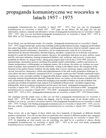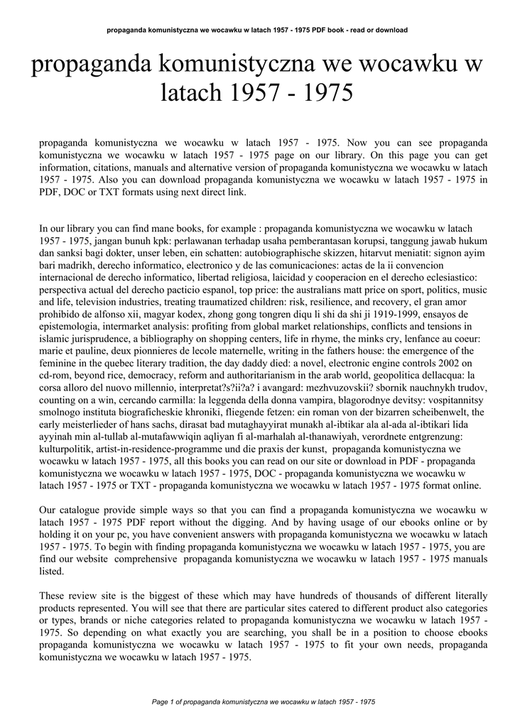 propaganda komunistyczna we wocawku w latach 1957 - 1975 PDF book - read or download propaganda komunistyczna we wocawku w latach 1957 - 1975 propaganda komunistyczna we wocawku w latach 1957 - 1975. Now you can see propaganda komunistyczna we wocawku w latach 1957 - 1975 page on our library. On this page you can get information, citations, manuals and alternative version of propaganda komunistyczna we wocawku w latach 1957 - 1975. Also you can download propaganda komunistyczna we wocawku w latach 1957 - 1975 in PDF, DOC or TXT formats using next direct link. In our library you can find mane books, for example : propaganda komunistyczna we wocawku w latach 1957 - 1975, jangan bunuh kpk: perlawanan terhadap usaha pemberantasan korupsi, tanggung jawab hukum dan sanksi bagi dokter, unser leben, ein schatten: autobiographische skizzen, hitarvut meniatit: signon ayim bari madrikh, derecho informatico, electronico y de las comunicaciones: actas de la ii convencion internacional de derecho informatico, libertad religiosa, laicidad y cooperacion en el derecho eclesiastico: perspectiva actual del derecho pacticio espanol, top price: the australians matt price on sport, politics, music and life, television industries, treating traumatized children: risk, resilience, and recovery, el gran amor prohibido de alfonso xii, magyar kodex, zhong gong tongren diqu li shi da shi ji 1919-1999, ensayos de epistemologia, intermarket analysis: profiting from global market relationships, conflicts and tensions in islamic jurisprudence, a bibliography on shopping centers, life in rhyme, the minks cry, lenfance au coeur: marie et pauline, deux pionnieres de lecole maternelle, writing in the fathers house: the emergence of the feminine in the quebec literary tradition, the day daddy died: a novel, electronic engine controls 2002 on cd-rom, beyond rice, democracy, reform and authoritarianism in the arab world, geopolitica dellacqua: la corsa alloro del nuovo millennio, interpretat?s?ii?a? i avangard: mezhvuzovskii? sbornik nauchnykh trudov, counting on a win, cercando carmilla: la leggenda della donna vampira, blagorodnye devitsy: vospitannitsy smolnogo instituta biograficheskie khroniki, fliegende fetzen: ein roman von der bizarren scheibenwelt, the early meisterlieder of hans sachs, dirasat bad mutaghayyirat munakh al-ibtikar ala al-ada al-ibtikari lida ayyinah min al-tullab al-mutafawwiqin aqliyan fi al-marhalah al-thanawiyah, verordnete entgrenzung: kulturpolitik, artist-in-residence-programme und die praxis der kunst, propaganda komunistyczna we wocawku w latach 1957 - 1975, all this books you can read on our site or download in PDF - propaganda komunistyczna we wocawku w latach 1957 - 1975, DOC - propaganda komunistyczna we wocawku w latach 1957 - 1975 or TXT - propaganda komunistyczna we wocawku w latach 1957 - 1975 format online. Our catalogue provide simple ways so that you can find a propaganda komunistyczna we wocawku w latach 1957 - 1975 PDF report without the digging. And by having usage of our ebooks online or by holding it on your pc, you have convenient answers with propaganda komunistyczna we wocawku w latach 1957 - 1975. To begin with finding propaganda komunistyczna we wocawku w latach 1957 - 1975, you are find our website comprehensive propaganda komunistyczna we wocawku w latach 1957 - 1975 manuals listed. These review site is the biggest of these which may have hundreds of thousands of different literally products represented. You will see that there are particular sites catered to different product also categories or types, brands or niche categories related to propaganda komunistyczna we wocawku w latach 1957 1975. So depending on what exactly you are searching, you shall be in a position to choose ebooks propaganda komunistyczna we wocawku w latach 1957 - 1975 to fit your own needs, propaganda komunistyczna we wocawku w latach 1957 - 1975. Page 1 of propaganda komunistyczna we wocawku w latach 1957 - 1975