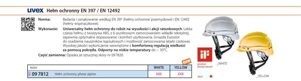Hełm ochronny EN 397 / EN 12492 Norma: Badania i oznakowanie według EN 397 (hełmy ochronne przemysłowe) i EN 12492 (hełmy wspinaczkowe). Wykonanie: Uniwersalny hełm ochronny do robót na wysokości i akcji ratunkowych. Lekka czasza hełmu z tworzywa ABS, z 6-punktowym zamocowaniem wkładki tekstylnej, zapewnia optymalne dopasowanie i komfort użytkowania. Gniazda Euroslot do osadzenia nauszników kapsułowych i możliwość zamocowania latarki czołowej. Wysokiej jakości wykończenie wewnętrzne z komfortową regulacją wielkości za pomocą pokrętła. Odporny na niskie temperatury do − 30°C. Część zamienna: Opaska ze sztucznej skóry nr 097820. 04U kolor 09 7812 Hełm ochronny pheos alpine WHITE YELLOW XXX XXX _WHITE _YELLOW