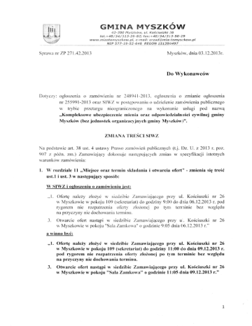 GMINA MYSZKÓW 42-300 Myszków, ul. Kościuszki .16 tel.+48/34/313-26-82; fax:+48/34/31 3-50-29 www.miastoniyszkow.pl, e-mail: urzadiśpmiai tomys.:kow.pl NIP 577-19-52-646 REGON 151398497 Myszków, dnia 03.12.2013r. Sprawa nr Z P 271.42.2013 Do Wykonawców Dotyczy: ogłoszenia o zamówieniu nr 248941-2013. ogłoszenia o zmianie ogłoszenia nr 255991-2013 oraz S I W Z w postępowaniu o udzielenie zamówienia publicznego w trybie przetargu nieograniczonego na wykonanie usługi pod nazwą „Kompleltsowe ubezpieczenie mienia oraz odpowiedzialności cywilnej gminy Myszków (bez jednostek organizacyjnych gminy Myszków)". Z M I A N A T R E Ś C I SIWZ N a podstawie art. 38 ust. 4 ustawy Prawo zamówień publicznych (t.j. I)z. U . z 2013 r. poz. 907 z późn. zm.) Zamawiający dokonuje następujących zmian w specyfikacji istotnych warunków zamówienia: 1. W rozdziale 11 „Miejsce oraz termin składania i otwarcia ofert' - zmienia się treść ust.l i ust. 3 w następujący sposób: W SIWZ i ogłoszeniu o zamówieniu jest: ..1. Ofertę należy złożyć w siedzibie Zamawiającego przy ul. Kościuszki nr 26 w Myszkowie w pokoju 109 (sekretariat) do godziny 9:0() do dnia 06.12.2013 r. pod rygorem nie rozpatrzenia oferty złożonej po tym terminie bez względu na przyczyny nie dochowania terminu. 3. Otwarcie ofert nastąpi w siedzibie Zamawiającego przy u . Kościuszki nr w Myszkowie w pokoju "Sala Zamkowa" o godzinie 9:05 dnia (i6.12.2013 r." 26 a winno być: „1. Ofertę należy złożyć w siedzibie Zamawiającego przy ul. Kościuszki nr 26 w Myszkowie w pokoju 109 (sekretariat) do godziny 11:00 do dnia 09.12.2013 r. pod rygorem nie rozpatrzenia oferty złożonej po tj m terminie bez względu na przyczyny nie dochowania terminu. 3. Otwarcie ofert nastąpi w siedzibie Zamawiającego przy ul. Kościuszki nr 26 w Myszkowie w pokoju "Sala Zamkowa" o godzinie l ł : 0 5 dnia 09.12.2013 r." 1 2. W załączniku nr 1 do SIWZ - „Szczegółowy opis przedmiotu zamówienia" - w segmencie I „Ubezpieczenie mienia od ognia i innycti zdarzeń losowych" pod tabelą opisującą przedmiot ubezpieczenia dodaje się zapis: „Ubezpieczenie poszczególnych składników wskazanych w tabeli „Przedmiot ubezpieczenia" ma nastąinć według wartości księgowej brutto." 3. W załączniku nr 1 do SIWZ - „Szczegółowy opis przedmiotu zamówienia" - w segmencie II w pkt 2 dodaje się następujące zapisy: „Suma ubezpieczenia na koszty naprawy zabezpieczeń od kradzieży „Ogólna z włamaniem wartość w ubezpieczeniu mienia i rabunku: 10 000 zł." środków pieniężnych wszystkich transportów przewidzianych w okresie ubezpieczenia: 4 000 000 zł." 4. W załączniku nr 1 do SIWZ - „Szczegółowy opis przedmiotu zamówienia" - w segmencie III „Ubezpieczenie przedmiotów szklanych od stłuczenia" w pkt 1 dodaje się zapis: „Suma ubezpieczeń 5. W załączniku przedmiotów szklanych, w tym szyb - 10 000 zl." nr 1 do SIWZ - „Szczegółowy opis przedmiotu zamówienia" - w segmencie IV „Ubezpieczenie sprzętu elektronicznego od wszystkich ryzyk" w pkt 1 dodaje się zapis: „Limit na przepięcia 6. W załączniku - 100 000 zł." nr 1 do SIWZ - „Szczegółowy opis przedmiotu zamówienia" - w segmencie IV „Ubezpieczenie sprzętu elektronicznego od wszystkich ryzyk" pod tabelą opisującą przedmiot ubezpieczenia dodaje się zapis: „ Wartości przy przedmiotach ubezpieczenia podanych przy ryzyku ubezpieczenia sprzętu ełektronicznego 7. W załączniku od wszystkich ryzyk są wartościami nr 1 do SIWZ - „Szczegółowy księgowymi brutto." opis przedmiotu zamówienia" - w segmencie V „Ubezpieczenie odpowiedzialności cywilnej" w pkt 1 dodaje się zapis: „Suma gwarancyjna przy ubezpieczeniu odpowiedzialności cywilnej - 400 000 zł, w tym drogi 300 000 zł." 8. W załączniku nr 1 do SIWZ - „Szczegółowy opis przedmiotu zamówienia" - w segmencie V „Ubezpieczenie odpowiedzialności cywilnej" zmienia się zapis w następujący sposób: 2 w SIWZ jest: Wykaz szkodowości na drogach gminnych za 2012r. oraz za trzy kwartały 2013r. Lp. Rok szkody na drogach Kwota w zł wypłaty franszyzy przez u bezpieczającego( U rząd) Kwota w zł wypłaty przez Ubezpieczyciela (PZU) Razem wypłata odszkodowania 1. 2. 2012 2013 (za trzy kwartały) 4 612,00 16 047,36 5 252,50 28 321,93 9 864,50 44 369,29 W związku ze szkodowoscią na drogach gminnych udział Gminy w wypłatach odszkodowań wynosi : -w2012r.-46,75%, - w 2013r. (za trzy kwartały) - 36^7%. a winno być; „ Wykaz szkodowości Lp. 1. 2. 3. 4. Rok szkody na drogach na drogach gminnych za 2010 r. - 2012 r. oraz za trzy kwartały 2013r. Kwota w zł wypłaty franszyzy Kwota w zł wypłaty Razem wypłata przez Ubezpieczyciela przez odszkodowania (PZU) uhezpieczającego(Urząd) 2010 2011 2012 2013 (za trzy kwartały) 12 856,65 3 091,75 4 612,00 35 724,56 14 669,99 5 252,50 48 581,21 17 761,74 9 864,50 16 047,36 28 321,93 44 369,29 W związku ze szkodowoscią na drogach gminnych udział Gminy wynosi: - w 2010 r.-26,46% - w 2011 r.- 17,41% - w 2012 r.-46,75% - w 2013 r. (za trzy kwartały) 9. W załączniku ~ 36,17%." nr 1 do SIWZ - „Szczegółowy opis przedmiotu zamówienia" - w segmencie VI „Szczegółowy opis przedmiotu zamówienia dla ubezpieczenia pojazdów mechanicznych stanowiących własność Gminy M y s z k ó w " w pkt 1 dodaje się następujące zapisy: „Suma ubezpieczenia przy NNW komunikacyjnym: 10 000 zł przy jednym „Suma pojeździe." ubezpieczenia przy pojazdach przeznaczonych do ubezpieczenia Autocasco: 146 450zł." 3 f „Szkodowość za ostanie 3 lata z OC, Autocasco, NNW: - 2()10r. - O - 201 Ir. - O - 2012r. - O - 2013r.(za trzy kwartały) 10. W załączniku - 0." nr 1 do SIWZ - „Szczegółowy opis przedmiotu zamówienia" - w segmencie VI „Szczegółowy opis przedmiotu zamówienia dla ubezpieczenia pojazdów mechanicznycli stanowiących własność Gminy M y s z k ó w " pod tabelą zestaw ienia pojazdów dodaje się n