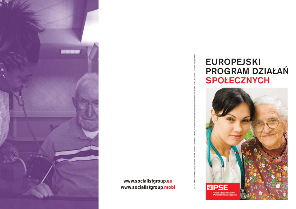 PL © 2009 v1 Printed and published: Anna Colombo, Secretary General, Socialist Group in the European Parliament, rue Wiertz, 1047, Brussels – Graphic design: M2M www.socialistgroup.eu www.socialistgroup.mobi EUROPEJSKI PROGRAM DZIAŁAŃ SPOŁECZNYCH Naszym celem jest Unia Europejska, która troszczy się o człowieka. Unia, która podejmuje zdecydowane działania w sprawach mających znaczenie dla Ciebie. Europejscy socjaldemokraci i socjaliści chcą Unii Europejskiej, która stoi po stronie obywateli w obliczu wyzwań globalnych, kryzysu finansowego i niepewności gospodarczej. Stworzyliśmy nowy europejski program działania w dziedzinie społecznej, który określa jakie działania należy podjąć. Nasz europejski program działania w dziedzinie społecznej: • ureguluje rynki finansowe i tym samym zakończy erę kapitalizmu spekulacyjnego; • zagwarantuje odpowiedni standard życia, w tym minimalne dochody i należyte świadczenia emerytalno-rentowe. Przy pomocy ogólnoeuropejskiego paktu stabilności społecznej, ustanowimy minimalne poziomy zabezpieczenia społecznego; • rozwiąże problem ubóstwa – a przede wszystkim ubóstwa dzieci; • zapewni swobodne przemieszczanie się pracowników pomiędzy krajami Unii i ochronę zatrudnionych, gwarantując równe wynagrodzenie za taką samą pracę oraz pełne poszanowanie zasad zawierania układów zbiorowych i roli związków zawodowych, w tym ich prawa do podejmowania akcji zbiorowych; • zlikwiduje różnice w zarobkach kobiet i mężczyzn poprzez wzmocnienie stosowania przepisów prawa dotyczących równych zarobków kobiet i mężczyzn; • obejmie ochroną prawną wszystkich pracowników niezależnie od ich umów i zapobiegnie nieuzasadnionym zwolnieniom; • przyzna pracownikom większe prawa w zakresie uzyskiwania informacji i zasięgania opinii – za pośrednictwem Europejskich Rad Zakładowych – w sprawie decyzji pracodawców, które mają wpływ na ich zatrudnienie; • zapewni fundusze europejskie pracownikom zwolnionym z powodu restrukturyzacji lub zmiany lokalizacji; • wprowadzi zakaz dyskryminacji we wszystkich dziedzinach, także w dziedzinie równości płci, wzmocni prawa osób niepełnosprawnych oraz zapoczątkuje realizację ogólnoeuropejskiej strategii przeciwdziałania wykluczeniu Romów; • poprawi higienę i bezpieczeństwo pracy, w tym ochronę przed nowymi zagrożeniami, i zagwarantuje wszystkim równy dostęp do opieki zdrowotnej o wysokiej jakościw miejscu pracy; • ułatwi pogodzenie życia zawodowego i rodzinnego, poprawi ochronę kobiet w ciąży i zapewni dostępną, opiekę o wysokiej jakości nad dziećmi – począwszy od wydłużenia urlopu macierzyńskiego i wzmocnienia środków ochrony prawnej przed pracą w godzinach nadliczbowych; • wprowadzi skuteczne i ludzkie rozwiązania polityczne dotyczące migracji i integracji; • zapewni możliwości szkolenia i stałego doskonalenia zawodowego wszystkim grupom wiekowym; • stworzy prawne ramy ochrony usług publicznych w całej Europie, w tym lokalnych usług publicznych oraz usług socjalnych; • skoordynuje polityki podatkowe by pomóc państwom członkowskim w realizacji wspólnych celów społecznych i gospodarczych oraz ich dążeń w zakresie ochrony środowiska naturalnego i energetyki. Będzie bodźcem do przyjęcia paktu zobowiązującego wszystkie państwa członkowskie do stosowania systemu progresywnego opodatkowania, który zmniejszy dysproporcje społeczne. Gdy banki potrzebowały ogromnych środków finansowych, które uratowałyby je przed konsekwencjami ich własnych błędów w zarządzaniu, rządy europejskie szybko środki te znalazły. Europa musi wykazać takie samo zaangażowanie, jeśli chodzi o wsparcie i ochronę osób znajdujących się w gorszym położeniu w naszych społeczeństwach, a także wszystkich obywateli europejskich, których dobrobyt jest zagrożony przez niepowodzenie panującego przez dwadzieścia lat kapitalizmu spekulacyjnego. Następny kandydat na przewodniczącego Komisji Europejskiej uzyska nasze poparcie wyłącznie wówczas, gdy wyraźnie zadeklaruje swoje zaangażowanie w wyżej wymienionych kwestiach. Socjaldemokraci i socjaliści wpływają na zapewnienie obywatelom europejskim lepszego życia w bardziej bezpiecznym, bardziej zintegrowanym i bardziej sprawiedliwym społeczeństwie jako głównego celu nowej, społecznej Europy.