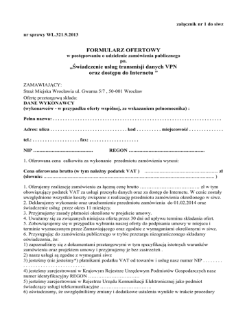 załącznik nr 1 do siwz nr sprawy WL.321.9.2013 FORMULARZ OFERTOWY w postępowaniu o udzielenie zamówienia publicznego pn. „Świadczenie usług transmisji danych VPN oraz dostępu do Internetu ” ZAMAWIAJĄCY: Straż Miejska Wrocławia ul. Gwarna 5/7 , 50-001 Wrocław Ofertę przetargową składa: DANE WYKONAWCY (wykonawców - w przypadku oferty wspólnej, ze wskazaniem pełnomocnika) : Pełna nazwa: . . . . . . . . . . . . . . . . . . . . . . . . . . . . . . . . . . . . . . . . . . . . . . . . . . . . . . . . . . . . . . . . . . . . Adres: ulica . . . . . . . . . . . . . . . . . . . . . . . . . . . . . . . kod . . . . . . . . . . miejscowość . . . . . . . . . . . . . . tel.: . . . . . . . . . . . . . . . . . . . fax: . . . . . . . . . . . . . . . . . . . . NIP …............................................ REGON …......................................................... 1. Oferowana cena całkowita za wykonanie przedmiotu zamówienia wynosi: Cena oferowana brutto (w tym należny podatek VAT ) ........................................................... zł (słownie: ......................................................................................................................................... ) 1. Oferujemy realizację zamówienia za łączną cenę brutto ……………………………… zł w tym obowiązujący podatek VAT za usługi przesyłu danych oraz za dostęp do Internetu. W cenie zostały uwzględnione wszystkie koszty związane z realizację przedmiotu zamówienia określonego w siwz. 2. Deklarujemy wykonanie oraz uruchomienie przedmiotu zamówienia do 01.02.2014 oraz świadczenie usług przez okres 11 miesięcy. 3. Przyjmujemy zasady płatności określone w projekcie umowy. 4. Uważamy się za związanych niniejsza ofertą przez 30 dni od upływu terminu składania ofert. 5. Zobowiązujemy się w przypadku wybrania naszej oferty do podpisania umowy w miejscu i terminie wyznaczonym przez Zamawiającego oraz zgodnie z wymaganiami określonymi w siwz. 6. Przystępując do zamówienia publicznego w trybie przetargu nieograniczonego składamy oświadczenia, że: 1) zapoznaliśmy się z dokumentami przetargowymi w tym specyfikacją istotnych warunków zamówienia oraz projektem umowy i przyjmujemy je bez zastrzeżeń . 2) nasze usługi są zgodne z wymogami siwz 3) jesteśmy (nie jesteśmy*) płatnikami podatku VAT od towarów i usług nasz numer NIP . . . . . . . . ......................... 4) jesteśmy zarejestrowani w Krajowym Rejestrze Urzędowym Podmiotów Gospodarczych nasz numer identyfikacyjny REGON …………………………. 5) jesteśmy zarejestrowani w Rejestrze Urzędu Komunikacji Elektronicznej jako podmiot świadczący usługi telekomunikacyjne …………………………. 6) oświadczamy, że uwzględniliśmy zmiany i dodatkowe ustalenia wynikłe w trakcie procedury przetargowej stanowiące integralną część siwz, wyszczególnione we wszystkich pismach opublikowanych przez Zamawiającego na stronie internetowej z której pobraliśmy siwz /przesłanych przez Zamawiającego*) 7) oświadczamy, że następujące części zamówienia powierzymy do wykonania podwykonawcom w zakresie przedstawionym w poniższej tabeli**): l.p. Wykaz części zamówienia powierzonych podwykonawcy 1 2 3 7. Składamy niniejszą ofertę przetargową we własnym imieniu/jako partner konsorcjum*) zarządzanego przez …………………………………..………....... (nazwa lidera) *) niepotrzebne skreślić **) wypełnić w przypadku powierzenia części zamówienia podwykonawcom 8. Potwierdzamy, iż nie uczestniczymy w jakiejkolwiek innej ofercie dotyczącej tego samego postępowania. 10. Niniejsza oferta przetargowa obejmuje następujące załączniki: (numerowany wykaz załączników wraz z tytułami) …………………………………………………. ……………………………………………........ ............................................................................ ............................................................................ ……………………………………………........ _________________________________ data, imię i nazwisko podpis uprawnionego przedstawiciela Wykonawcy pieczęć firmowa wykonawcy