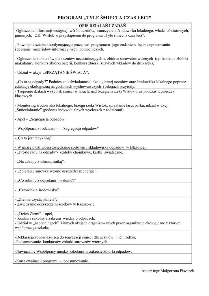 PROGRAM „TYLE ŚMIECI A CZAS LECI” OPIS DZIAŁAŃ I ZADAŃ -Ogłoszenie informacji wstępnej wśród uczniów, nauczycieli, środowiska lokalnego, władz oświatowych, gminnych, ZK Wisłok o przystąpieniu do programu „Tyle śmieci a czas leci”. - Powołanie sztabu koordynującego pracę nad programem- jego zadaniem będzie opracowanie i zebranie materiałów informacyjnych, pomocniczych. - Ogłoszenie konkursów dla uczniów uczestniczących w zbiórce surowców wtórnych (np. konkurs zbiórki makulatury, konkurs zbiórki baterii, konkurs zbiórki zużytych wkładów do drukarek); - Udział w akcji „SPRZĄTANIE ŚWIATA”; -„Co to są odpady?” Podniesienie świadomości ekologicznej uczniów oraz środowiska lokalnego poprzez edukację ekologiczną na godzinach wychowawczych i lekcjach przyrody. - Tropienie dzikich wysypisk śmieci w lasach; nad brzegiem rzeki Wisłok oraz podczas wycieczek klasowych. - Monitoring środowiska lokalnego, brzegu rzeki Wisłok, sprzątanie lasu, parku, udział w akcji „Śmieciobranie” (podczas indywidualnych wycieczek z rodzicami). - Apel – „Segregacja odpadów” - Współpraca z rodzicami – „Segregacja odpadów” -„Co to jest recykling?” - W miarę możliwości zwiedzanie sortowni i składowiska odpadów w Błażowej; - „Proste rady na odpady”- ozdoby choinkowe, kartki świąteczne. - „Na zakupy z własną siatką”. - „Zbierając surowce wtórne oszczędzasz energię”; - „Co robimy z odpadami w domu?” - „Człowiek a środowisko”. - „Ziemia czystą planetą”; - Zwiedzanie oczyszczalni ścieków w Rzeszowie. - „Dzień Ziemi” – apel, - Konkurs szkolny z zakresu wiedzy o odpadach; - Udział w „happeningach” i innych akcjach organizowanych przez organizacje ekologiczne z którymi współpracuje szkoła; -Deklaracja zobowiązująca do segregacji śmieci dla uczniów i ich rodzin; -Podsumowanie konkursów zbiórki surowców wtórnych. -Nawiązanie Współpracy między szkołami w zakresie zbiórki odpadów. -Karta ewaluacji programu – podsumowanie. Autor: mgr Małgorzata Piszczek