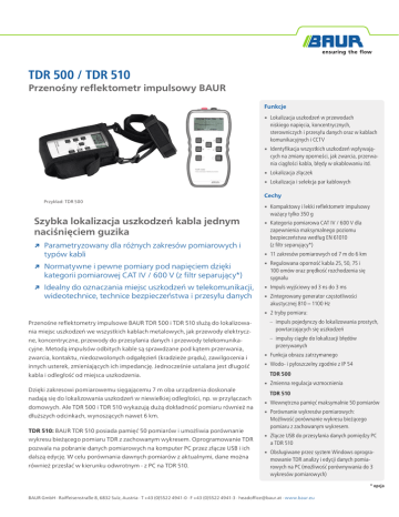 TDR 500 / TDR 510 Przenośny reflektometr impulsowy BAUR Funkcje ▪▪ Lokalizacja uszkodzeń w przewodach niskiego napięcia, koncentrycznych, sterowniczych i przesyłu danych oraz w kablach komunikacyjnych i CCTV ▪▪ Identyfikacja wszystkich uszkodzeń wpływających na zmiany oporności, jak zwarcia, przerwania ciągłości kabla, błędy w okablowaniu itd. ▪▪ Lokalizacja złączek ▪▪ Lokalizacja i selekcja par kablowych Przykład: TDR 500 Szybka lokalizacja uszkodzeń kabla jednym naciśnięciem guzika ↗↗ Parametryzowany dla różnych zakresów pomiarowych i typów kabli Cechy ▪▪ Kompaktowy i lekki reflektometr impulsowy ważący tylko 350 g ▪▪ Kategoria pomiarowa CAT IV / 600 V dla zapewnienia maksymalnego poziomu bezpieczeństwa według EN 61010 (z filtr separujący*) ▪▪ 11 zakresów pomiarowych od 7 m do 6 km ↗↗ Normatywne i pewne pomiary pod napięciem dzięki kategorii pomiarowej CAT IV / 600 V (z filtr separujący*) ▪▪ Regulowana oporność kabla 25, 50, 75 i 100 omów oraz prędkość rozchodzenia się sygnału ↗↗ Idealny do oznaczania miejsc uszkodzeń w telekomunikacji, wideotechnice, technice bezpieczeństwa i przesyłu danych ▪▪ Impuls wyjściowy od 3 ns do 3 ms ▪▪ Zintegrowany generator częstotliwości akustycznej 810 – 1100 Hz ▪▪ 2 tryby pomiaru: Przenośne reflektometry impulsowe BAUR TDR 500 i TDR 510 służą do lokalizowania miejsc uszkodzeń we wszystkich kablach metalowych, jak przewody elektryczne, koncentryczne, przewody do przesyłania danych i przewody telekomunikacyjne. Metodą impulsów odbitych kable są sprawdzane pod kątem przerwania, zwarcia, kontaktu, niedozwolonych odgałęzień (kradzieże prądu), zawilgocenia i innych usterek, zmieniających ich impedancję. Jednocześnie ustalana jest długość kabla i odległość od miejsca uszkodzenia. Dzięki zakresowi pomiarowemu sięgającemu 7 m oba urządzenia doskonale nadają się do lokalizowania uszkodzeń w niewielkiej odległości, np. w przyłączach domowych. Ale TDR 500 i TDR 510 wykazują dużą dokładność pomiaru również na dłuższych odcinkach, wynoszących nawet 6 km. TDR 510: BAUR TDR 510 posiada pamięć 50 pomiarów i umożliwia porównanie wykresu bieżącego pomiaru TDR z zachowanym wykresem. Oprogramowanie TDR pozwala na pobranie danych pomiarowych na komputer PC przez złącze USB i ich dalszą edycję. W celu porównania dawnych pomiarów z aktualnymi, dane można również przesłać w kierunku odwrotnym - z PC na TDR 510. –– impuls pojedynczy do lokalizowania prostych, powtarzających się uszkodzeń –– impulsy ciągłe do lokalizacji błędów przerywanych ▪▪ Funkcja obrazu zatrzymanego ▪▪ Wodo- i pyłoszczelny zgodnie z IP 54 TDR 500 ▪▪ Zmienna regulacja wzmocnienia TDR 510 ▪▪ Wewnętrzna pamięć maksymalnie 50 pomiarów ▪▪ Porównanie wykresów pomiarowych: Możliwość porównanie wykresu bieżącego pomiaru z zachowanym wykresem. ▪▪ Złącze USB do przesyłania danych pomiędzy PC a TDR 510 ▪▪ Obsługiwane przez system Windows oprogramowanie TDR analizy i edycji danych pomiarowych na PC (możliwość porównywania do 3 wykresów pomiarowych) * opcja BAUR GmbH · Raiffeisenstraße 8, 6832 Sulz, Austria · T +43 (0)5522 4941-0 · F +43 (0)5522 4941-3 · [email protected] · www.baur.eu Dane techniczne Lokalizacja uszkodzeń kabla Informacje ogólne Impuls wyjściowy 5 V (w obwodzie otwartym) Akumulator 4 x 1.5 V baterie alkaliczne IEC LR6 Szerokość impulsu wyjściowego 3 ns – 3 ms Automatyczne wyłączenie Impedancja wyjściowa 25, 50 ,75 lub 100 Ω; regulowana Częstotliwość impulsów 2 pomiary/s lub pomiar pojedynczy (nie dotyczy zakresu 3 km/6 km) TDR 500: 1, 2, 3, 5 min. lub dezaktywacja TDR 510: 1, 2, 3 min. lub dezaktywacja Wyświetlacz LCD (128 x 64 pikseli), z podświetleniem tła Temperatura otoczenia (podczas pracy) -10 do +50°C Temperatura przechowywania -20 do +70°C Wymiary (szer. x wys. x głęb.) ok. 165 x 90 x 37 mm Ciężar ok. 350 g (12 oz.) Zabezpieczenie przepięciowe AC 250 V Kategoria pomiarowa (z filtr separujący*) CAT IV / 600 V Napięcie robocze DC lub ACsk. względem masy: 600 V Napięcie udarowe wytrzymywane: 8 000 V Klasa ochrony IP 54 Bezpieczeństwo i kompatybilność elektromagnetyczna Zgodność CE według dyrektywy niskonapięciowej (2014/35/WE) i dyrektywy o kompatybilności elektromagnetycznej (2014/30/WE) Generator częstotliwość akustycznej 810 – 1100 Hz Zakres pomiarowy Metry / stopy: 7 / 23 15 / 49 30 / 98 60 / 197 120 / 394 250 / 820 500 / 1 640 Kilometry / stopy: 1 / 3 280 2 / 6 560 3 / 9 850 6 / 19 000 Wybór zakresu pomiarowego Ręczny Prędkość propagacji Regulowana: –– od 1 do 99% jako współczynnik skracający w procentach prędkości światła –– w m/µs lub stopach/µs (pokazywany jako v/2) Rozdzielczość ok. 1% zakresu pomiarowego Dokładność 1% wybranego zakresu pomiarowego (dla jednorodnej prędkości propagacji) Zarządzanie danymi (TDR 510) Interfejs danych USB 2.0 Pojemność pamięci 50 pomiarów * opcja TDR 510 – przykładowy zrzut ekranowy z programu TDR Karta informacyjna: BAUR GmbH · 896-242-7 · 10.2015 · Prawo do zmian zastrzeżone Zakres dostawy TDR 500 ▪▪ Reflektometr impulsowy BAUR TDR 500 ▪▪ 2 kable połączeniowe, po 0,5 m ▪▪ 2 zaciskami krokodylkowymi ▪▪ Torba z pasek na ramię ▪▪ Instrukcja obsługi Zakres dostawy TDR 510 ▪▪ Reflektometr impulsowy BAUR TDR 510 ▪▪ Oprogramowanie TDR na CD-ROM ▪▪ 2 kable połączeniowe, po 0,5 m ▪▪ 2 zaciskami krokodylkowymi ▪▪ Kabel USB ▪▪ Torba z pasek na ramię ▪▪ Instrukcja obsługi Opcje dla TDR 500/510 Zestaw 1 ▪▪ Filtr separujący SF IV-600 (CAT IV / 600 V), w komplecie: –– Kabel połączeniowy, podłączony na stałe, 0,5 m –– Bezpieczniki do filtra separującego –– Bezpieczniki zamienne –– Zabezpieczone zaciski krokodylkowe (2 szt.), CAT IV / 600 –– Walizka transportowa dla TDR