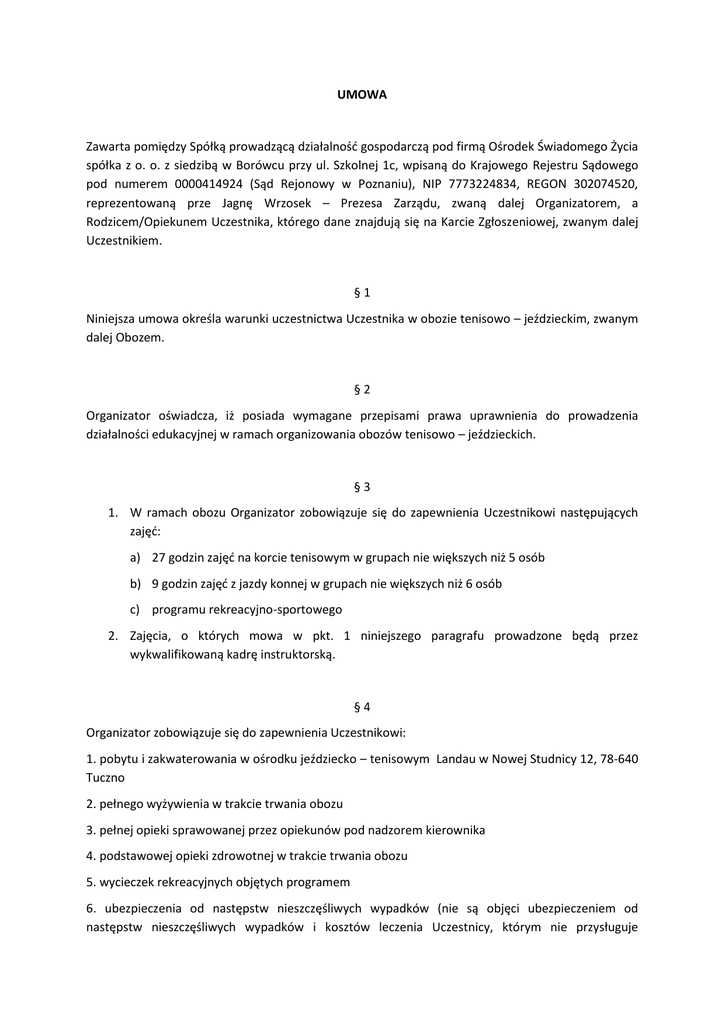 UMOWA Zawarta pomiędzy Spółką prowadzącą działalność gospodarczą pod firmą Ośrodek Świadomego Życia spółka z o. o. z siedzibą w Borówcu przy ul. Szkolnej 1c, wpisaną do Krajowego Rejestru Sądowego pod numerem 0000414924 (Sąd Rejonowy w Poznaniu), NIP 7773224834, REGON 302074520, reprezentowaną prze Jagnę Wrzosek – Prezesa Zarządu, zwaną dalej Organizatorem, a Rodzicem/Opiekunem Uczestnika, którego dane znajdują się na Karcie Zgłoszeniowej, zwanym dalej Uczestnikiem. §1 Niniejsza umowa określa warunki uczestnictwa Uczestnika w obozie tenisowo – jeździeckim, zwanym dalej Obozem. §2 Organizator oświadcza, iż posiada wymagane przepisami prawa uprawnienia do prowadzenia działalności edukacyjnej w ramach organizowania obozów tenisowo – jeździeckich. §3 1. W ramach obozu Organizator zobowiązuje się do zapewnienia Uczestnikowi następujących zajęć: a) 27 godzin zajęć na korcie tenisowym w grupach nie większych niż 5 osób b) 9 godzin zajęć z jazdy konnej w grupach nie większych niż 6 osób c) programu rekreacyjno-sportowego 2. Zajęcia, o których mowa w pkt. 1 niniejszego paragrafu prowadzone będą przez wykwalifikowaną kadrę instruktorską. §4 Organizator zobowiązuje się do zapewnienia Uczestnikowi: 1. pobytu i zakwaterowania w ośrodku jeździecko – tenisowym Landau w Nowej Studnicy 12, 78-640 Tuczno 2. pełnego wyżywienia w trakcie trwania obozu 3. pełnej opieki sprawowanej przez opiekunów pod nadzorem kierownika 4. podstawowej opieki zdrowotnej w trakcie trwania obozu 5. wycieczek rekreacyjnych objętych programem 6. ubezpieczenia od następstw nieszczęśliwych wypadków (nie są objęci ubezpieczeniem od następstw nieszczęśliwych wypadków i kosztów leczenia Uczestnicy, którym nie przysługuje uprawnienie do korzystania z bezpłatnych świadczeń opieki medycznej na terenie Polski; w takich wypadkach Uczestnik sam na własną odpowiedzialność wykupuje polisę ubezpieczeniową od następstw nieszczęśliwych wypadków i kosztów leczenia na terenie Polski). §5 Organizator przekazuje Rodzicowi/Opiekunowi Uczestnika Regulamin Obozu oraz Kartę Zgłoszenia Uczestnika Obozu, na której znajduje się: a) oświadczenie lekarskie o braku przeciwwskazań do uczestnictwa w obozie b) informacja o stanie zdrowia Uczestnika. §6 Rodzic/Opiekun jest zobowiązany przekazać Organizatorowi czytelnie wypełnione i podpisane dokumenty, o których mowa w paragrafie 6, najpóźniej na 3 tygodnie przed rozpoczęciem obozu. §7 1. Rodzic/Opiekun Uczestnika zobowiązany jest do uiszczenia na rzecz Organizatora pierwszej raty w wysokości 390 pln lub całej opłaty za obóz niezwłocznie po potwierdzeniu, o którym mowa w § 8, przelewem na rachunek bankowy : Ośrodek Świadomego Życia, ul. Szkolna 1c, 62-023 Borówiec, prowadzony przez PKO BP w Bydgoszczy pod numerem: 04 1020 1475 0000 8102 0224 2543 Kolejność wpłat decyduje o rezerwacji miejsc 2. W przypadku dokonywania płatności ratami druga rata (1000 pln) powinna zostać uiszczona najpóźniej na 21 dni przed rozpoczęciem obozu, tj. do 27 lipca 2015 r. 3. Niedokonanie płatności drugiej raty w terminie wskazanym w pkt. 2 niniejszego paragrafu oznacza rezygnację z uczestnictwa w obozie. Postanowienia paragrafu 12 stosuje się odpowiednio. 4. Cena turnusu wynosi 1390 pln. Na przelewie bankowym proszę podać imię i nazwisko Uczestnika. §8 Przed dokonaniem opłaty Rodzic/Opiekun Uczestnika zobowiązany jest potwierdzić czy Organizator dysponuje wolnymi miejscami na obozie. Pozytywna odpowiedź Organizatora stanowi warunek konieczny wejścia niniejszej umowy w życie. §9 1. Po dokonaniu wpłaty Rodzic/Opiekun Uczestnika zobowiązany jest przesłać Organizatorowi kopie potwierdzenia dokonania opłaty e-mailem: [email protected] lub pocztą: Jagna Wrzosek, Nowa Studnica 12, 78-640 Tuczno 2. Na wniosek Rodzica/Opiekuna Uczestnika złożony w terminie 7 dni od daty dokonania zapłaty i po przedstawieniu dowodu zapłaty, Organizator zobowiązany jest wystawić rachunek potwierdzający dokonanie zapłaty. 3. Zapłata pierwszej raty lub całej kwoty równoznaczna jest z zaakceptowaniem przez Uczestnika postanowień niniejszej Umowy oraz Regulaminu Obozu i warunków uczestnictwa w obozie. § 10 W przypadku odwołania obozu z winy Organizatora, jest on zobowiązany do zwrotu na rzecz Rodzica/Opiekuna Uczestnika należności w pełnej wysokości dokonanej przez niego opłaty, w terminie 7 dni od daty zaistnienia przyczyny odwołania obozu. § 11 W przypadku gdy Uczestnik z przyczyn nie leżących po stronie Organizatora nie brał udziału we wszystkich lub niektórych zajęciach prowadzonych w ramach obozu lub w części lub całości obozu, Organizator nie jest zobowiązany do zwrotu całości lub części opłaty dokonanej tytułem opłaty za obóz. § 12 1. Do dnia rozpoczęcia obozu Rodzic/Opiekun może odstąpić od niniejszej umowy w drodze oświadczenia złożonego Organizatorowi. 2. Oświadczenie, o którym mowa w pkt. 1 wymaga formy pisemnej pod rygorem nieważności. 3. W przypadku złożenia oświadczenia o odstąpieniu od umowy nie później niż na 30 dni przed terminem rozpoczęcia obozu Organizator zobowiązuje się do zwrotu całej uiszczonej opłaty, pomniejszonej o kwotę 100,00 pln z tytułu kosztów administracyjnych. 4. W przypadku, gdy Uczestnik nie uiści pełnej opłaty na 21 dni przed rozpoczęciem obozu lub złoży oświadczenie, o którym mowa w pkt. 1, pomiędzy 30 a 21 dniem przed rozpoczęciem obozu Organizator zobowiązuje się do zwrotu jedynie nadwyżki uiszczonej przez Uczestnika opłaty ponad wysokość pierwszej raty. 5. W przypadku złożenia oświadczenia o odstąpieniu od umowy na 21 dni przed rozpoczęciem obozu lub po tej dacie lub w przypadku, gdy Uczestnik nie uiści pełnej opłaty po tej dacie, Organizator nie jest zobowiązany do zwrotu uiszczonej przez Uczestnika opłaty za obóz. § 13 Rodzic/Opiekun Uczestnika ponosi odpowiedzialno