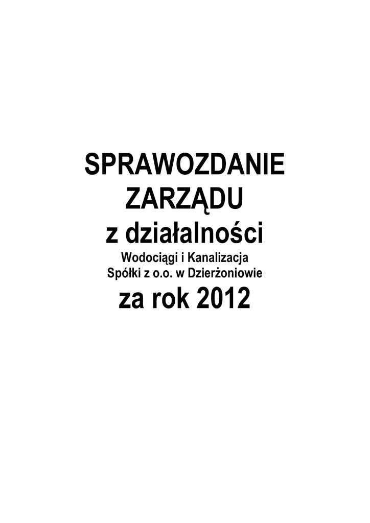 SPRAWOZDANIE ZARZĄDU z działalności Wodociągi i Kanalizacja Spółki z o.o. w Dzierżoniowie za rok 2012 Sprawozdanie Zarządu za 2012 rok SPIS TREŚCI 1. Charakterystyka Spółki ( str. nr 3-9). 2. Zdarzenia istotnie wpływające na działalność Spółki jakie wystąpiły w roku 2012, a także do dnia zatwierdzenia Sprawozdania Finansowego ( str. nr 9-13). 3. Ważniejsze osiągnięcia w dziedzinie badań i rozwoju ( str. nr 13-15). 4. Przewidywany rozwój Spółki ( str. nr 15-18). 5. Aktualna i przewidywana sytuacja finansowa Spółki ( str. nr 18-19). 6. Istotne czynniki ryzyka i zagrożenia ( str. nr 19). 7. Informacje dodatkowe ( str. nr 20-23). 8. Posiadane przez jednostkę oddziały ( zakłady), (str. 23). 9. Stosowanie zasad ładunku korporacyjnego w przypadku jednostek, których papiery wartościowe zostały dopuszczone do obrotu na jednym z rynków regulowanych Europejskiego Obszaru Gospodarczego (str. nr 23). 10. Nabycie udziałów własnych, cena nabycia oraz cena sprzedaży w przypadku ich zbycia(str. nr 23). 11. Instrumenty finansowe (str. nr 23). 12. Wskaźniki finansowe i niefinansowe (str. nr 23-24). Wodociągi i Kanalizacja Spółka z o.o. Dzierżoniów Strona/ Stron: 2/24 Sprawozdanie Zarządu za 2012 rok 1. Charakterystyka Spółki. 1.1 Informacje podstawowe. Spółka Wodociągi i Kanalizacja w Dzierżoniowie powstała w wyniku przekształcenia Rejonowego Przedsiębiorstwa Wodociągów i Kanalizacji w 1997 roku. Siedziba Spółki mieści się w Dzierżoniowie przy ulicy Kilińskiego 25 A. Spółka WiK jest zarejestrowana w Krajowym Rejestrze Sądowym Wrocław – Fabryczna pod numerem 0000064082 jako spółka z ograniczoną odpowiedzialnością. Podstawowym przedmiotem działania jest zbiorowe zaopatrzenie w wodę i zbiorowe odprowadzanie ścieków. Ponadto Spółka świadczy usługi m.in. w zakresie: - wykonywania instalacji wodno-kanalizacyjnych, - wykonywania robót ogólnobudowlanych, - badań laboratoryjnych, - wynajmu sprzętu specjalistycznego i środków transportowych. Obszar działania Spółki obejmuje: Gminę Miejską Dzierżoniów, Gminę Bielawa, Gminę Pieszyce, Gminę Piławę Górna, Miasto i Gminę Niemcza, Gminę Dzierżoniów oraz część Gminy Świdnica. Spółka nie posiada żadnego wyodrębnionego oddziału (zakładu). Właścicielem wszystkich udziałów dotychczas była Gmina Miejska Dzierżoniów, którą na Zgromadzeniu Wspólników reprezentował Burmistrz Miasta Dzierżoniów. Dnia 29 grudnia 2011 roku odbyło się Nadzwyczajne Zgromadzenie Wspólników na którym w zamian za wniesienie środków finansowych do Spółki (realizacja projektu „Uporządkowanie gospodarki wodno-ściekowej na terenie gmin powiatu dzierżoniowskiego – etap I” z udziałem Środków z Funduszu Spójność) w podwyższonym kapitale zakładowym, nowe udziały w Spółce objęła Gmina Dzierżoniów. Wpis do Krajowego Rejestru Sądowego nastąpił 4 stycznia 2012 roku. Gmina Miejska Dzierżoniów posiadała 81.581 udziałów tj. 97,9 %, natomiast Gmina Dzierżoniów posiadała 1.738 udziałów tj. 2,1 %. Dnia 29 sierpnia odbyło się Nadzwyczajne Zgromadzenie Wspólników na którym w zamian za wniesienie środków finansowych do Spółki (również realizacja projektu „Uporządkowanie gospodarki wodno-ściekowej na terenie gmin powiatu dzierżoniowskiego – etap I” z udziałem Środków z Funduszu Spójność) w podwyższonym kapitale zakładowym udziały w Spółce objęły: Gmina Miejska Dzierżoniów 1.922 udziały, Gmina Dzierżoniów 362 udziały oraz nowy Wspólnik Gmina Bielawa 166 udziałów. Dnia 06 grudnia 2012 roku podczas Nadzwyczajnego Zgromadzenia Wspólników udziały w podwyższonym kapitale zakładowym w ilości 760 objęła Gmina Pieszyce zostając nowym Wspólnikiem Spółki WiK. Na przedmiotowym Zgromadzeniu nowe udziały objęły również : Gmina Dzierżoniów w ilości 162 udziałów oraz Gmina Bielawa w ilości 305 udziałów. Rejestracja podwyższonego kapitału zakładowego wraz z nowymi Wspólnikami Gminami Bielawa i Pieszyce nastąpiła 10 stycznia 2013 roku. Obecnie Lista Wspólników przedstawia się następująco: Wodociągi i Kanalizacja Spółka z o.o. Dzierżoniów Strona/ Stron: 3/24 Sprawozdanie Zarządu za 2012 rok 1. GMINA MIEJSKA DZIERŻONIÓW posiada udziały – 83.503 (słownie: osiemdziesiąt trzy tysiące pięćset trzy) o łącznej wartości nominalnej 41.751.500,00 zł słownie: czterdzieści jeden milionów siedemset pięćdziesiąt jeden tysięcy pięćset złotych). 2. GMINA DZIERŻONIÓW posiada udziały – 2.262 (słownie: dwa tysiące dwieście sześćdziesiąt dwa) o łącznej wartości nominalnej 1.131.000,00 zł słownie: (słownie: jeden milion sto trzydzieści jeden tysięcy). 3. GMINA BIELAWA posiada udziały – 471 (słownie: czterysta siedemdziesiąt jeden) o łącznej wartości nominalnej 235.500,00 zł (słownie: dwieście trzydzieści pięć tysięcy pięćset złotych). 4. GMINA PIESZYCE posiada udziały – 760 (słownie: siedemset sześćdziesiąt) o łącznej wartości nominalnej 380.000,00 zł (słownie: trzysta osiemdziesiąt tysięcy złotych). Spółka nie posiada udziałów w innych spółkach prawa handlowego w kraju, jak i zagranicą, nie jest także wspólnikiem żadnych jednostek współzależnych. 1.2 Kapitały Spółki. Kapitał własny Spółki na 31.12.2012 rok wynosi 56.826.108,94 zł tworzą go : - kapitał podstawowy w wysokości 41.659.500,00 zł - kapitał zapasowy w wysokości 10.928.057,50 zł - kapitał rezerwowy w wysokości 3.098.233,77 zł - zysk netto w wysokości 1.140.317,67 zł Dnia 29 grudnia 2011 roku odbyło się Zgromadzenie Wspólników, na którym został podwyższony kapitał zakładowy o kwotę 869.000,00 zł. Sam wpis w Krajowym Rejestrze Sądowym nastąpił 4 stycznia 2012 roku. Kwota podwyższenia została przekazana na czas oczekiwania na rejestracje w KRS, na kapitał rezerwowy. To podwyższenie zostało ujęte w Sprawozdaniu finansowym na 