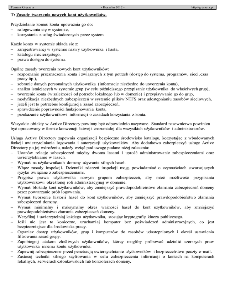 Tomasz Greszata - Koszalin 2012 - http://greszata.pl T: Zasady tworzenia nowych kont użytkowników. Przydzielanie komuś konta upoważnia go do: zalogowania się w systemie, korzystania z usług świadczonych przez system. Każde konto w systemie składa się z: zarejestrowanej w systemie nazwy użytkownika i hasła, katalogu macierzystego, prawa dostępu do systemu. Ogólne zasady tworzenia nowych kont użytkowników: rozpoznanie przeznaczenia konta i związanych z tym potrzeb (dostęp do systemu, programów, sieci, czas pracy itp.), zebranie danych personalnych użytkownika (informacje niezbędne do utworzenia konta), analiza istniejących w systemie grup (w celu późniejszego przypisanie użytkownika do właściwych grup), tworzenie konta (w zależności od potrzeb: lokalnego lub w domenie) i przypisywanie go do grup, modyfikacja niezbędnych zabezpieczeń w systemie plików NTFS oraz udostępnianiu zasobów sieciowych, jeżeli jest to potrzebne konfiguracja zasad zabezpieczeń, sprawdzenie poprawności funkcjonowania konta, przekazanie użytkownikowi informacji o zasadach korzystania z konta. Wszystkie obiekty w Active Directory powinny być odpowiednio nazywane. Standard nazewnictwa powinien być opracowany w formie konwencji łatwej i zrozumiałej dla wszystkich użytkowników i administratorów. Usługa Active Directory zapewnia organizacji bezpieczne środowisko katalogu, korzystając z wbudowanych funkcji uwierzytelniania logowania i autoryzacji użytkowników. Aby dodatkowo zabezpieczyć usługę Active Directory po jej wdrożeniu, należy wziąć pod uwagę podane niżej zalecenia: Ustanów relację zabezpieczeń między dwoma lasami i uprość administrowanie zabezpieczeniami oraz uwierzytelnianie w lasach. Wymuś na użytkownikach domeny używanie silnych haseł. Włącz zasady inspekcji. Dzienniki zdarzeń inspekcji mogą powiadamiać o czynnościach stwarzających ryzyko związane z zabezpieczeniami. Przypisz prawa użytkownika nowym grupom zabezpieczeń, aby mieć możliwość przypisania użytkownikowi określonej roli administracyjnej w domenie. Wymuś blokadę kont użytkowników, aby zmniejszyć prawdopodobieństwo złamania zabezpieczeń domeny przez powtarzanie prób logowania. Wymuś tworzenie historii haseł do kont użytkowników, aby zmniejszyć prawdopodobieństwo złamania zabezpieczeń domeny. Wymuś minimalny i maksymalny okres ważności haseł do kont użytkowników, aby zmniejszyć prawdopodobieństwo złamania zabezpieczeń domeny. Weryfikuj i uwierzytelniaj każdego użytkownika, stosując kryptografię klucza publicznego. Jeśli nie jest to konieczne, uruchamiaj komputer bez poświadczeń administracyjnych, co jest bezpieczniejsze dla środowiska pracy. Ogranicz dostęp użytkowników, grup i komputerów do zasobów udostępnionych i określ ustawienia filtrowania zasad grupy. Zapobiegnij atakom złośliwych użytkowników, którzy mogliby próbować udzielić szerszych praw użytkownika innemu kontu użytkownika. Zapewnij zabezpieczone przed penetracją uwierzytelnianie użytkowników i bezpieczeństwo poczty e-mail. Zastosuj techniki silnego szyfrowania w celu zabezpieczenia informacji o kontach na komputerach lokalnych, serwerach członkowskich lub kontrolerach domeny.