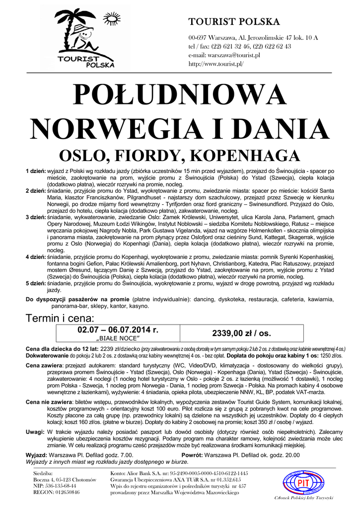 TOURIST POLSKA 00-697 Warszawa, Al. Jerozolimskie 47 lok. 10 A tel / fax: (22) 621 32 46, (22) 622 62 43 e-mail: [email protected] http://www.tourist.pl/ POŁUDNIOWA NORWEGIA I DANIA OSLO, FIORDY, KOPENHAGA 1 dzień: wyjazd z Polski wg rozkładu jazdy (zbiórka uczestników 15 min przed wyjazdem), przejazd do Świnoujścia - spacer po mieście, zaokrętowanie na prom, wyjście promu z Świnoujścia (Polska) do Ystad (Szwecja), ciepła kolacja (dodatkowo płatna), wieczór rozrywki na promie, nocleg. 2 dzień: śniadanie, przyjście promu do Ystad, wyokrętowanie z promu, zwiedzanie miasta: spacer po mieście: kościół Santa Maria, klasztor Franciszkanów, Pilgrandhuset - najstarszy dom szachulcowy, przejazd przez Szwecję w kierunku Norwegii, po drodze mijamy fiord wewnętrzny - Tyrifjorden oraz fiord graniczny – Swinesundfiord. Przyjazd do Oslo, przejazd do hotelu, ciepła kolacja (dodatkowo płatna), zakwaterowanie, nocleg. 3 dzień: śniadanie, wykwaterowanie, zwiedzanie Oslo: Zamek Królewski, Uniwersytet, ulica Karola Jana, Parlament, gmach Opery Narodowej, Muzeum Łodzi Wikingów, Instytut Noblowski – siedziba Komitetu Noblowskiego, Ratusz – miejsce wręczania pokojowej Nagrody Nobla, Park Gustawa Vigelanda, wjazd na wzgórze Holmenkollen - skocznia olimpijska i panorama miasta, zaokrętowanie na prom płynący przez Oslofjord oraz cieśniny Sund, Kattegat, Skagerrak, wyjście promu z Oslo (Norwegia) do Kopenhagi (Dania), ciepła kolacja (dodatkowo płatna), wieczór rozrywki na promie, nocleg. 4 dzień: śniadanie, przyjście promu do Kopenhagi, wyokrętowanie z promu, zwiedzanie miasta: pomnik Syrenki Kopenhaskiej, fontanna bogini Gefion, Pałac Królewski Amalienborg, port Nyhavn, Christianborg, Katedra, Plac Ratuszowy, przejazd mostem Øresund, łączącym Danię z Szwecją, przyjazd do Ystad, zaokrętowanie na prom, wyjście promu z Ystad (Szwecja) do Świnoujścia (Polska), ciepła kolacja (dodatkowo płatna), wieczór rozrywki na promie, nocleg. 5 dzień: śniadanie, przyjście promu do Świnoujścia, wyokrętowanie z promu, wyjazd w drogę powrotną, przyjazd wg rozkładu jazdy. Do dyspozycji pasażerów na promie (płatne indywidualnie): dancing, dyskoteka, restauracja, cafeteria, kawiarnia, panorama-bar, sklepy, kantor, kasyno. Termin i cena: 02.07 – 06.07.2014 r. „BIAŁE NOCE” 2339,00 zł / os. Cena dla dziecka do 12 lat: 2239 zł/dziecko (przy zakwaterowaniu z osobą dorosłą w tym samym pokoju 2 lub 2 os. z dostawką oraz kabinie wewnętrznej 4 os.) Dokwaterowanie do pokoju 2 lub 2 os. z dostawką oraz kabiny wewnętrznej 4 os. - bez opłat. Dopłata do pokoju oraz kabiny 1 os: 1250 zł/os. Cena zawiera: przejazd autokarem: standard turystyczny (WC, Video/DVD, klimatyzacja - dostosowany do wielkości grupy), przeprawa promem Świnoujście - Ystad (Szwecja), Oslo (Norwegia) - Kopenhaga (Dania), Ystad (Szwecja) - Świnoujście, zakwaterowanie: 4 noclegi (1 nocleg hotel turystyczny w Oslo - pokoje 2 os. z łazienką (możliwość 1 dostawki), 1 nocleg prom Polska - Szwecja, 1 nocleg prom Norwegia - Dania, 1 nocleg prom Szwecja - Polska. Na promach kabiny 4 osobowe wewnętrzne z łazienkami), wyżywienie: 4 śniadania, opieka pilota, ubezpieczenie NNW, KL, BP, podatek VAT-marża. Cena nie zawiera: biletów wstępu, przewodników lokalnych, wypożyczenia zestawów Tourist Guide System, komunikacji lokalnej, kosztów programowych - orientacyjny koszt 100 euro. Pilot rozlicza się z grupą z pobranych kwot na cele programowe. Koszty płacone za całą grupę (np. przewodnicy lokalni) są dzielone na wszystkich jej uczestników. Dopłaty do 4 ciepłych kolacji; koszt 160 zł/os. (płatne w biurze). Dopłaty do kabiny 2 osobowej na promie; koszt 350 zł / osobę / wyjazd. Uwagi: W trakcie wyjazdu należy posiadać paszport lub dowód osobisty (dotyczy również osób niepełnoletnich). Zalecamy wykupienie ubezpieczenia kosztów rezygnacji. Podany program ma charakter ramowy, kolejność zwiedzania może ulec zmianie. W celu realizacji programu cześć przejazdów może być realizowana środkami komunikacji miejskiej. Wyjazd: Warszawa Pl. Defilad godz. 7.00. Powrót: Warszawa Pl. Defilad ok. godz. 20.00 Wyjazdy z innych miast wg rozkładu jazdy dostępnego w biurze. Siedziba: Boczna 4, 05-123 Chotomów NIP: 536-135-68-44 REGON: 012650846 Konto: Alior Bank S.A. nr: 95-2490-0005-0000-4510-6122-1445 Gwarancja Ubezpieczeniowa AXA TUiR S.A. nr 01.352.615 Wpis do rejestru organizatorów i pośredników turystyki nr 457 prowadzony przez Marszałka Województwa Mazowieckiego Cz ł onek Polskiej Izby Turystyki