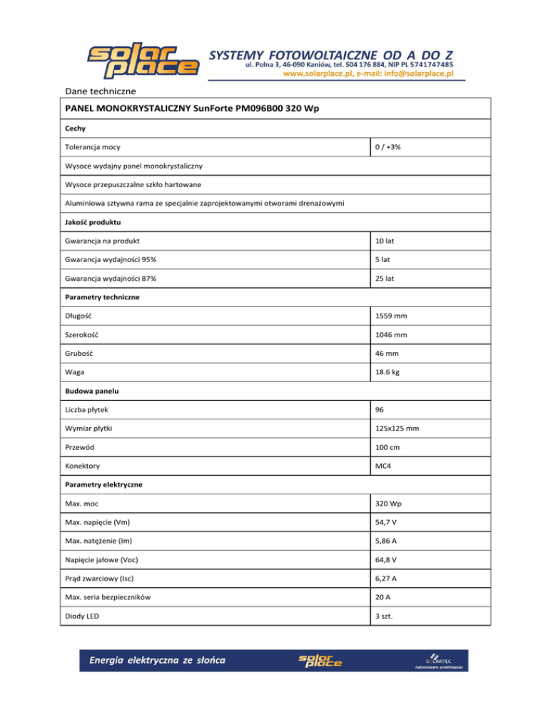 Dane techniczne PANEL MONOKRYSTALICZNY SunForte PM096B00 320 Wp Cechy Tolerancja mocy 0 / +3% Wysoce wydajny panel monokrystaliczny Wysoce przepuszczalne szkło hartowane Aluminiowa sztywna rama ze specjalnie zaprojektowanymi otworami drenażowymi Jakość produktu Gwarancja na produkt 10 lat Gwarancja wydajności 95% 5 lat Gwarancja wydajności 87% 25 lat Parametry techniczne Długość 1559 mm Szerokość 1046 mm Grubość 46 mm Waga 18.6 kg Budowa panelu Liczba płytek 96 Wymiar płytki 125x125 mm Przewód 100 cm Konektory MC4 Parametry elektryczne Max. moc 320 Wp Max. napięcie (Vm) 54,7 V Max. natężenie (Im) 5,86 A Napięcie jałowe (Voc) 64,8 V Prąd zwarciowy (Isc) 6,27 A Max. seria bezpieczników 20 A Diody LED 3 szt. Sprawność 19.6 % Max. napięcie systemu 1000 VDC Współczynnik temperaturowy Pm -0,38% /°C Współczynnik temperaturowy Pm Voc -0,27% /°C Współczynnik temperaturowy Pm Isc 0,06% /°C Temperatura nominalna ogniwa pv 45 ± 2 °C Tolerancja mocy 0 / +3% Warunki testowania paneli AM = 1,5; E = 1000W/m; T = 25°C