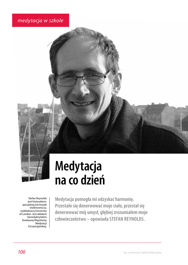 medytacja w szkole Medytacja na co dzień Stefan Reynolds jest historykiem, specjalistą od mistyki średniowiecza, wykładowcą University of London. Jest oblatem benedyktyńskim Światowej Wspólnoty Medytacji Chrześcijańskiej. 106 Medytacja pomogła mi odzyskać harmonię. Przestało się denerwować moje ciało, przestał się denerwować mój umysł, głębiej zrozumiałem moje człowieczeństwo – opowiada Stefan Reynolds. fot. z archiwum Stefana Raynoldsa medytacja w szkole Piotr Żak: – Czy każdy może medytować? Stefan Reynolds: – Tak! Medytować mogą i kilkuletnie dzieci, i wiekowi staruszkowie. We wspólnocie medytacji chrześcijańskiej od kilku lat przywiązujemy dużą wagę do uczenia dzieci medytacji. To dla nich w pewien sposób naturalny stan, wystarczy popatrzeć, jak potrafią skupić się na zabawie, skoncentrować na tu i teraz. Z czasem uczenie się medytacji przychodzi z coraz większym trudem. Kiedy na przykład człowiek wchodzi w okres dojrzewania, spotyka się z silną presją, aby osiągać dobre wyniki w szkole czy w sporcie. Mało kto uważa, że medytacja może mu w tym pomóc. Tymczasem ona uspokaja, pozwala oczyścić umysł, skoncentrować się. Czasami słyszę od moich znajomych, że trudno im medytować w domu, bo muszą pilnować dzieci, bo obowiązki, bo sto innych rzeczy. Mam jednak przyjaciół, którzy potrafią medytować z jednym okiem otwartym i czujnie obserwującym, co ich pociechy wyprawiają! Sam nie mam jeszcze dzieci, więc nie wiem, jak to naprawdę jest, ale mam nadzieję, że będę mógł się przekonać o tym na własnej skórze. Jak we Wspólnocie wygląda uczenie dzieci medytacji? – Opracowaliśmy specjalne programy. Wprowadziliśmy je w szkołach w Anglii i Irlandii. Ich najważniejszą częścią jest zapraszanie nauczycieli, aby sami nauczyli się medytacji, a potem przekazywali tę umiejętność swoim podopiecznym. Na razie głównym celem są szkoły podstawowe, ponieważ w nich nasze programy spotykają Psychologia w Szkole nr 1/2013 się z największym entuzjazmem. Ich ważnym punktem jest także nadanie nauce medytacji formy zabawy. Na przykład wspólnota zaleca, aby od początku mantrą było „Maranatha”. Dla dzieci to dziwne, nieznane i trochę śmieszne słowo, dlatego jak najszybsze nauczenie się go uważają za swego rodzaju wyzwanie. Co ważne, nie kojarzy się ono z żadną religią, więc mogą je powtarzać mali chrześcijanie, muzułmanie czy żydzi. Ciekawym wyzwaniem staje się też Medytacja uspokaja dzieci, poprawia ich sprawność myślenia. dla nich siedzenie przez kilka minut w ciszy i bezruchu. Przyjęliśmy zasadę, że dzieci medytują tyle minut, ile mają lat, więc z każdym rokiem mają dokładaną minutę. Okazało się, że bardzo czekają na wydłużenie tego czasu. Poza tym medytacja uspokaja dzieci, poprawia ich zdolność koncentracji, jasność umysłu, szybkość myślenia. Stają się też wyraźnie szczęśliwsze i bardziej przyjazne wobec siebie. Z naszych programów korzysta obecnie około 100 szkół w Anglii i około 30 w Irlandii, ale prawdziwym liderem jest Australia. Tam w diecezji Townsville od ponad dziesięciu lat uczniowie wszystkich szkół katolickich mają regularne, codzienne zajęcia z medytacji. Mówił Pan o tym, że medytacja ma pozytywny wpływ na uczniów. Czy Wspólnota prowadziła już jakieś badania w tym kierunku? 107 medytacja w szkole – W Anglii i Irlandii jeszcze nie było regularnych, szerzej zakrojonych badań, ponieważ idea uczenia medytacji w szkołach jest dosyć nowa. Natomiast w Australii robiono już takie badania, ale tam – jak wspomniałem – medytacja jest w szkołach od ponad dziesięciu lat. Jeden z moich przyjaciół pozbierał różne naukowe doniesienia na temat wpływu medytacji, porównał je i otrzymał wyniki, o których już wspominałem. Czy Pan też uczy medytacji? – Tak. Czasami proponuję ją moim studentom. Od czasu do czasu prowadzę też rekolekcje medytacyjne. Sposób prowadzenia wykładów na uniwersytecie jest inny niż sposób głoszenia nauk rekolekcyjnych. Czasami te metody krzyżują się, ponieważ moją wiedzę z zakresu średniowiecznej mistyki mogę wykorzystywać w rozważaniach rekolekcyjnych. Chodzi zwłaszcza o niektóre teksty średniowiecznych myślicieli, gdyż pomagają one moim słuchaczom lepiej zrozumieć, czym jest medytacja. Częściej jednak uczę medytacji, sięgając do dorobku ojca Johna Maina. Sam chętnie korzystam w mojej medytacji z jego myśli. Nie uważam się za najlepszego nauczyciela medytacji na świecie, ale staram się myśleć o tym, jak i czego uczę. Z jakimi trudnościami zmaga się Pan, gdy uczy innych medytacji? – Denerwuję się, gdy nie mam pomysłu, jak taką naukę poprowadzić. Niedawno w jednym z londyńskich kościołów miałem wygłosić coś w rodzaju wstępu do medyta- 108 cji i zupełnie nie wiedziałem, jak to zrobić. W ciągu dnia coraz bardziej się denerwowałem, aż w końcu doznałem czegoś w rodzaju olśnienia. Generalnie nauczanie medytacji jest innym doświadczeniem niż prowadzenie zajęć ze studentami. Do nich musisz być zawsze przygotowany, natomiast do uczenia medytacji czasami lepiej nie przygotowywać się specjalnie, tylko pozostawić rzeczy własnemu biegowi. Generalnie jednak staram się mieć choćby ogólne pojęcie o tym, co chcę powiedzieć moim słuchaczom. Ponieważ żyjemy w czasach, w których wierzymy przede wszystkim temu, co widzimy, zacząłem stosować prezentacje komputerowe, w których pokazuję średniowieczne Nauczanie medytacji to coś zupełnie innego niż zwykłe lekcje. manuskrypty mistyków, ich wizerunki, obrazy ilustrujące to, o czym mówię. Używam fotografii, reprodukcji dzieł sztuki, a czasami nawet fragmentów filmów animowanych. Dzięki temu moi słuchacze reagują znacznie żywiej na to, co mówię, lepiej się koncentrują, więcej zapamiętują. Co prawda medytacja chrześcijańska nie kor