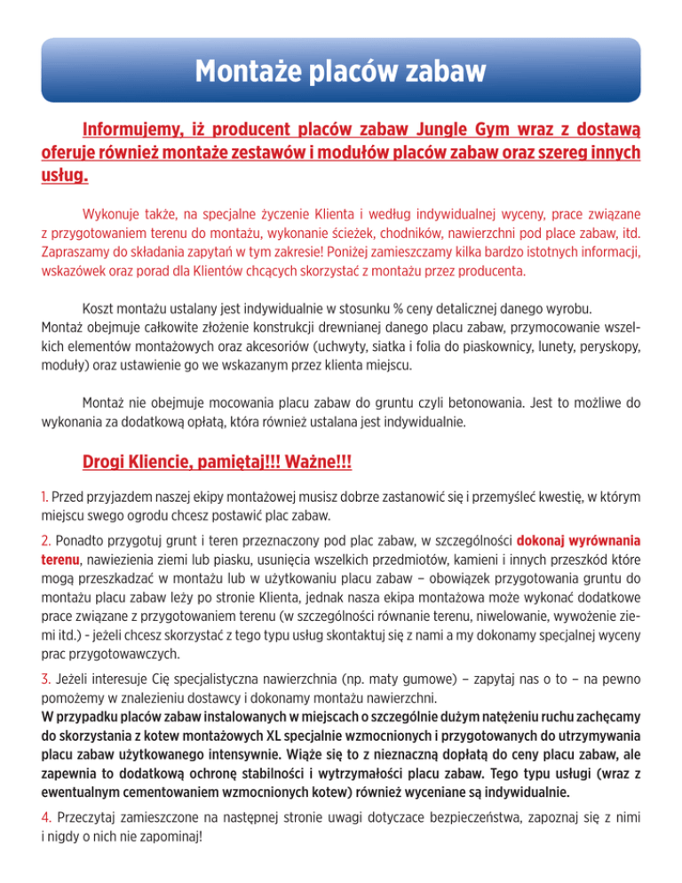Montaże placów zabaw Informujemy, iż producent placów zabaw Jungle Gym wraz z dostawą oferuje również montaże zestawów i modułów placów zabaw oraz szereg innych usług. Wykonuje także, na specjalne życzenie Klienta i według indywidualnej wyceny, prace związane z przygotowaniem terenu do montażu, wykonanie ścieżek, chodników, nawierzchni pod place zabaw, itd. Zapraszamy do składania zapytań w tym zakresie! Poniżej zamieszczamy kilka bardzo istotnych informacji, wskazówek oraz porad dla Klientów chcących skorzystać z montażu przez producenta. Koszt montażu ustalany jest indywidualnie w stosunku % ceny detalicznej danego wyrobu. Montaż obejmuje całkowite złożenie konstrukcji drewnianej danego placu zabaw, przymocowanie wszelkich elementów montażowych oraz akcesoriów (uchwyty, siatka i folia do piaskownicy, lunety, peryskopy, moduły) oraz ustawienie go we wskazanym przez klienta miejscu. Montaż nie obejmuje mocowania placu zabaw do gruntu czyli betonowania. Jest to możliwe do wykonania za dodatkową opłatą, która również ustalana jest indywidualnie. Drogi Kliencie, pamiętaj!!! Ważne!!! 1. Przed przyjazdem naszej ekipy montażowej musisz dobrze zastanowić się i przemyśleć kwestię, w którym miejscu swego ogrodu chcesz postawić plac zabaw. 2. Ponadto przygotuj grunt i teren przeznaczony pod plac zabaw, w szczególności dokonaj wyrównania terenu, nawiezienia ziemi lub piasku, usunięcia wszelkich przedmiotów, kamieni i innych przeszkód które mogą przeszkadzać w montażu lub w użytkowaniu placu zabaw – obowiązek przygotowania gruntu do montażu placu zabaw leży po stronie Klienta, jednak nasza ekipa montażowa może wykonać dodatkowe prace związane z przygotowaniem terenu (w szczególności równanie terenu, niwelowanie, wywożenie ziemi itd.) - jeżeli chcesz skorzystać z tego typu usług skontaktuj się z nami a my dokonamy specjalnej wyceny prac przygotowawczych. 3. Jeżeli interesuje Cię specjalistyczna nawierzchnia (np. maty gumowe) – zapytaj nas o to – na pewno pomożemy w znalezieniu dostawcy i dokonamy montażu nawierzchni. W przypadku placów zabaw instalowanych w miejscach o szczególnie dużym natężeniu ruchu zachęcamy do skorzystania z kotew montażowych XL specjalnie wzmocnionych i przygotowanych do utrzymywania placu zabaw użytkowanego intensywnie. Wiąże się to z nieznaczną dopłatą do ceny placu zabaw, ale zapewnia to dodatkową ochronę stabilności i wytrzymałości placu zabaw. Tego typu usługi (wraz z ewentualnym cementowaniem wzmocnionych kotew) również wyceniane są indywidualnie. 4. Przeczytaj zamieszczone na następnej stronie uwagi dotyczace bezpieczeństwa, zapoznaj się z nimi i nigdy o nich nie zapominaj! Montaże placów zabaw INSTRUKCJE DOTYCZĄCE BEZPIECZEŃSTWA - Przygotowanie terenu Przy przygotowywaniu terenu pod plac zabaw należy przestrzegać strefy bezpieczeństwa wynoszącej 200cm wokół poszczególnych elementów placu zabaw, przy czym w podanej strefie, wokół wszystkich składowych placu zabaw i z każdej ich strony nie mogą znajdować się żadne elementy przymocowane na stałe oraz nieprzymocowane a mogące stanowić przeszkodę w bezpiecznym użytkowaniu placu zabaw. Zaleca się, o ile to możliwe, umieszczanie placu zabaw w miejscach osłoniętych od słońca oraz wiatru. Zaleca się także niemocowanie zjeżdżalni w kierunku południowym, co może spowodować zbytnie jej nagrzanie i ryzyko oparzenia w kontakcie ze skórą. Zestaw placu zabaw należy umieścić na specjalnie do tego przygotowanej powierzchni, w ramach placu zabaw jak i w strefie bezpieczeństwa – powinna być to powierzchnia miękka, zalecane typy powierzchni: piaskowa, żwirowa (żwir drobnoziarnisty), usypana z rozdrobnionej kory drzew, trocin lub mulczu. Uwaga! Nie należy montować placu zabaw na powierzchni asfaltowej, kamienistej, betonowej, brukowej lub na twardo ubitej ziemi! Nie należy montować placu zabaw w pobliżu lub w kierunku ścieżek, chodników bądź często uczęszczanych przejść.