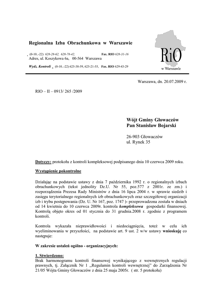 Regionalna Izba Obrachunkowa w Warszawie (0-10..-22) 628-28-62, 628-78-42, Fax. RIO 628-31-16 Adres, ul. Koszykowa 6a, 00-564 Warszawa Wydz. Kontroli (0-10..-22) 625-38-59, 625-21-55, Fax. RIO 629-43-29 Warszawa, dn. 20.07.2009 r. RIO – II – 0913/ 265 /2009 Wójt Gminy Głowaczów Pan Stanisław Bojarski 26-903 Głowaczów ul. Rynek 35 Dotyczy: protokołu z kontroli kompleksowej podpisanego dnia 10 czerwca 2009 roku. Wystąpienie pokontrolne Działając na podstawie ustawy z dnia 7 października 1992 r. o regionalnych izbach obrachunkowych (tekst jednolity Dz.U. Nr 55, poz.577 z 2001r. ze zm.) i rozporządzenia Prezesa Rady Ministrów z dnia 16 lipca 2004 r. w sprawie siedzib i zasięgu terytorialnego regionalnych izb obrachunkowych oraz szczegółowej organizacji izb i trybu postępowania (Dz. U. Nr 167, poz. 1747 )- przeprowadzona została w dniach od 14 kwietnia do 10 czerwca 2009r. kontrola kompleksowa gospodarki finansowej. Kontrolą objęto okres od 01 stycznia do 31 grudnia.2008 r. zgodnie z programem kontroli. Kontrola wykazała nieprawidłowości i niedociągnięcia, toteŜ w celu ich wyeliminowania w przyszłości, na podstawie art. 9 ust. 2 w/w ustawy wnioskuję co następuje: W zakresie ustaleń ogólno - organizacyjnych: 1. Stwierdzono: Brak harmonogramu kontroli finansowej wynikającego z wewnętrznych regulacji prawnych, tj. Załącznik Nr 1 ,,Regulamin kontroli wewnętrznej” do Zarządzenia Nr 21/05 Wójta Gminy Głowaczów z dnia 25 maja 2005r. ( str. 5 protokołu) 2 Wnioskuję: Przestrzegać własnych regulacji prawnych w zakresie kontroli wewnętrznej. 2. Stwierdzono: Nie przeprowadzono we wszystkich jednostkach organizacyjnych gminy kontroli w zakresie przestrzegania procedur oraz przeprowadzania wstępnej oceny celowości zaciągania zobowiązań finansowych i dokonywania wydatków ( str. 5 protokołu) Wnioskuję: Przeprowadzać kontrole przestrzegania przez podległe i nadzorowane jednostki organizacyjne realizacji procedur w zakresie celowości zaciągania zobowiązań finansowych i dokonywania wydatków stosownie do przepisów art. 187 ust. 2 ustawy z dnia 30 czerwca.2005r. o finansach publicznych (Dz. U. Nr 249, poz. 2104 z póź. zm.) 3.Stwierdzono: W wewnętrznych regulacjach prawnych dotyczących kontroli finansowej nie uwzględniono procedur kontroli zawartych w Komunikacie nr 13 Ministra Finansów z dnia 30 czerwca.2005r. w zakresie gromadzenia środków publicznych oraz gospodarowania mieniem i zamówień publicznych. ( str.5 protokołu) Wnioskuję: Określić w formie pisemnej procedury kontroli w zakresie gromadzenia środków publicznych oraz gospodarowania mieniem i zamówień publicznych stosownie do przepisów art. 47 ust. 3 ustawy z dnia 30 czerwca 2005r. o finansach publicznych (Dz. U. Nr 249, poz. 2104 z późn. zm.) z uwzględnieniem standardów kontroli finansowej zawartych w Komunikacie nr 13 Ministra Finansów z dnia 30 czerwca 2006r. w sprawie standardów kontroli finansowej w jednostkach sektora finansów publicznych (Dz. Urz. Min. Fin. Nr 7, poz. 58). W zakresie księgowości i sprawozdawczości: 4.Stwierdzono: Brak zestawień obrotów i sald dzienników częściowych Urzędu za poszczególne okresy sprawozdawcze – ( str. 6 protokołu) Wnioskuję: Przestrzegać art.14 ust.3 ustawy z dnia 29 września 1994r. o rachunkowości ( tj. Dz. U. z 2002r. Nr 76,poz. 694 z późn. zm.) 5. Stwierdzono: Wójt Gminy Głowaczów nie zawierał umów cywilno – prawnych z osobami dokonującymi ,,wpłat na wodociąg” w formie pisemnej co uniemoŜliwiało ustalenie czy wpłaty dokonywane przez mieszkańców gminy stanowią darowiznę czy teŜ opłatę za podłączenie do wodociągu oraz jej ewentualne rozliczenie i właściwe ujęcie w ewidencji księgowej – ( str. 6 protokołu) Wnioskuję: W celu zabezpieczenia interesu Gminy oraz realizacji zasad zawartych w rozdziale 2 ,,Jawność i przejrzystość finansów publicznych” – art.12 ustawy z dnia 30 czerwca 2005r.o finansach publicznych ( Dz. U. Nr 249, poz.2104 z późn. zm.), zawierać umowy cywilno – prawne z osobami dokonującymi ,,wpłat na wodociąg” w formie pisemnej. 3 6. Stwierdzono: W zakładowym planie kont jak równieŜ w ewidencji księgowej brak jest syntetycznych i analitycznych kont pozabilansowych księgowości podatkowej, tj.: - konta 990 – Rozrachunki z osobami trzecimi z tytułu ich odpowiedzialności za zobowiązania podatkowe podatnika”; - konta 991 – Rozrachunki z inkasentami z tytułu pobieranych przez nich podatków podlegających przypisaniu na kontach podatników – ( str.7 protokołu) Wnioskuję: Zaprowadzić pozabilansową ewidencję księgowości podatkowej stosownie do dyspozycji zawartej w §12 oraz §27 i §28 rozporządzenia Ministra Finansów z dnia 21 czerwca 2006r. w sprawie zasad rachunkowości i planu kont w zakresie ewidencji podatków, opłat i niepodatkowych naleŜności budŜetowych dla organów podatkowych jednostek samorządu terytorialnego (Dz. U. Nr 112, poz. 761.). Stosownie do dyspozycji zawartej w art.10 ust.2 ustawy z dnia 29 września 1994r. o rachunkowości ( tj. Dz. U. z 2002r. Nr 76, poz. 694 z późn. zm.) dostosować dokumentację opisującą przyjęte zasady rachunkowości do wymogów w/w rozporządzenia. 7. Stwierdzono: W wydrukach komputerowych dzienników budŜetu i Urzędu brak danych pozwalających na ustalenie osoby odpowiedzialnej za treść zapisu księgowego ( str.7 protokołu) Wnioskuję: Prowadząc księgi rachunkowe przy uŜyciu komputera przestrzegać art. 14 ust. 4 ustawy z dnia 29 września 1994 roku o rachunkowości (tekst jedn. Dz. U. z 2002 r. Nr 76, poz. 694, z późn. zm.) 8. Stwierdzono: W sprawozdaniu Rb-N o stanie naleŜności oraz wybranych aktywów finansowych za 2008r zaniŜono wartość naleŜności wykazanych w księgach rachunkowych na koncie 225 planu kont (analityka podatek VAT) w kwocie 88.204,64zł. ( str.9-10 protokołu) Wnioskuję: Przestrzegać §9 rozporządzenia Ministra Finansów z dnia 