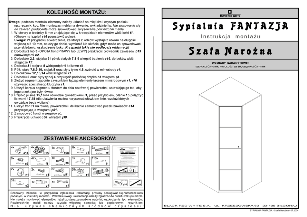 KOLEJNOÚà MONTAÝU: Uwaga: podczas monta¿u elementy nale¿y ukùadaã na miêkkim i czystym podùo¿u np.: rêcznik, koc. Nie montowaã mebla na dywanie, wykùadzinie itp. Nie stosowanie siê do zaleceñ producenta mo¿e spowodowaã zarysowanie powierzchni mebla. 1. W otwory o œrednicy 8 mm znajduj¹ce siê w krawêdziach elementów wbiã koùki f1. (Otwory na trzpieñ r16 pozostawiã wolne). Uwaga: W przypadku stwierdzenia, ¿e któryœ z koùków wystaje z otworu na dùugoœã wiêksz¹ ni¿ 10 mm, nale¿y go dobiã, wymieniã lub skróciã, gdy¿ mo¿e on spowodowaã, przy skùadaniu, uszkodzenie boku. Przypadki takie nie podlegaj¹ reklamacji! 2. Do boku 2 lub 3 (OPCJA front PRAWY lub LEWY) przykrêciã prowadniki zawiasów b13 eurowkrêtami e2. 3. Do boków 2,3, stojaka 5 i póùek staùych 7,8,9 wkrêciã trzpienie r16, do boków wbiã œlizgacze k1. 4. Do boku 3 i stojaka 5 wbiã podpórki koùkowe d1 . 5. Póùki staùe 7,8,9,10, stojak 5 oraz pùyty tylne 4,6, uzbroiã w mimoœrody r1. 6. Do cokoùów 12,13,14 wbiã œlizgacze k1. 7. Do boku 2 oraz pùyty tylnej 4 przykrêciã podpórkê dr¹¿ka n1 wkrêtem p1. 8. Zùo¿yã segment zgodnie z rysunkiem ù¹cz¹c elementy ù¹czem mimœrodowym r1, r16 u¿ywaj¹c specjalnego kluczyka z1. 9. Uùo¿yã korpus segmentu frontem do doùu na równej powierzchni, ustawiaj¹c go tak, aby jego przek¹tne byùy równe. 10. Przybiã pilœnie 15,16 na obwodzie gwoêdzikami l1, przed przybiciem, pilœnie 15 poù¹czyã listwami 17,18 (dla uùatwienia mo¿na narysowaã oùówkiem linie, wzdùu¿ których gwoêdzie bêd¹ wbijane). 11. Uùo¿yã front 1 na równej powierzchni i delikatnie zamocowaã puszki zawiasów a14 przykrêcaj¹c je wkrêtami p51 . 12. Zamocowaã front i wyregulowaã. 13. Przykrêciã uchwyt c68 wkrêtem j30. WYMIARY GABARYTOWE: SZEROKOÚÃ: 87,5 cm, WYSOKOÚÃ: 208 cm, G£ÆBOKOÚÃ: 87,5 cm ZESTAWIENIE AKCESORIÓW: 4x 4x a14 8x c68 b13 1x 47x x13 mm e2 2x 8x 1x x30 mm f1 n1 p1 x15 mm e1 TAŒMA ZABEZPIECZAJ¥CA Ta œma za bez pie czaj ¹ca j est el eme ntem ni ezb êd nym d la be zpi ecz neg o u¿y tko wa ni a zaku pio nyc h prze z P añs tw a meb li . Th is An ti-To ppl e de vice is esse ntia l fo r safe u se of th e furn iture yo u ha ve p urcha sed . Da s Siche run gsb an d ist ein un entb ehr lich es Ele me nt zu r sich ere n Ben utzun g de r von Ihn en e in gek auften Möb el. Uw aga: Ta œm ê n a le¿ y za m o co w aã z go d n ie z za le ce n ia m i n in ie jsz ej in st ru k cji. Ta œm a za b ez p ie cz aj¹ c a nie m o ¿e b yã s to so w an a ja ko za m ie nn ik e le m e nt ów s ta n da r d ow o d o ù¹c za n yc h d o m eb li. No te: T h e d ev ice h a s to b e fi xe d in a cc o rd a n ce w ith t he s e in str u ct io ns . T h e an t i-t op p le d e vic e ca n n ot b e u se d a s a su p ple m e n t fo r an y o th e r ac ce s so ri es cu s to m a rily s u pp lie d w ith f ur n itu r e. Hi nw eis : D as Ba n d la u t G e b ra u ch s an w eis u ng fixi er e n. D as Si ch er u n gs b an d d a rf n ich t zu a n d er e n Z we c ke n b e nu tz t we r de n . Es d a rf n ich t a ls Ers a tzt e il d e r an d e re n , zu d e n M öb e ln b e ige f üg t en E lem en t e die n e n. r1 Do mo nta¿u po trzebn e s¹: Yo u ne ed for fi ttin g-u p: Zur Montag e we rden Si e bra uche n: AKC ESOR IA : ACC ESSORIES: ZUBEH R : 38x BLA CK RED W H I TE S. A. UL . K RZ E S Z OW S KA 63 , 2 3- 40 0 B I£ G OR AJ w w w.br w s a.co m .pl BL AC K RED l1 k1 38x p51 7x47 mm 110x j30 8x x13 mm d1 8x M4x22 mm 2x 2x x17 mm 1x n26 x 16 mm 1x r16 p 38 I NF ORM AC JA! Sz an ow ny K li en cie, w p rz ypa dk u z gùa sza nia re kla ma cji, pr osim y po sùug iwa ã siê n um e re m kod u po da nym w ins tru kc ji m on ta¿ u. Wsze lkie uw ag i i r ekla m acje n ale ¿y z gùa sza ã d o p un ktu z aku pu m eb la. I NF ORM AT IO N! D ea r clien t, in c ase o f co m pla inin g, ple ase u se the co de n um be r give n in the a sse mb ly in str uc tion . An y c om m en ts an d c om pla int s sh ou ld be re po rt ed at th e f ur nitu re p ur cha se o utle t. H INWE IS! Se hr g ee hr te Kun de n, im F alle ein er Re kla ma tio n, ge be n Sie b itte die in de r Mo n tag ee inle itu ng er wä hn te C od e- Num m e r a n. M it a llen die sb ezü glic he n F r ag en un d Rek lam at ion en we nd en Sie sich b itte an ih re n Ve rkä uf er. 1/ 4 32x s2 1x y1 1x x16 mm z1 1x p38 TAÚ M A Z ABE ZP IEC ZA J¥ C A 0 8 .2 0 0 1 1x n26 Szanowny Kliencie, w przypadku zgùaszania reklamacji, prosimy posùugiwaã siê numerem kodu podanym w instrukcji monta¿u. Wszelkie uwagi i reklamacje nale¿y zgùaszaã do punktu zakupu mebla. Nie nale¿y montowaã elementów, je¿eli zostan¹ zauwa¿one wady lub uszkodzenia tych elementów. Powierzchniê mebli nale ¿y cz yœciã wilgotn¹ s zmatk¹ lub papierowy m rêcznik iem. N i e u ¿ y w a ã c h e m i c z n y c h œ r o d k ó w c z y s t o œ c i ! BLACK RED WHITE S.A. UL. KRZESZOWSKA 63 23-400 BI£GORAJ SYPIALNIA FANTAZJA - Szafa Naro¿na - 07.2004 9 f1 r1 6 s2 s2 16 f1 r1 p1 15 18 17 r1 s2 f1 f1 r16 f1 e2 e2 f1 r1 s2 s2 r1 p1 n1 s2 r1 b13 f1 r1 s2 r16 r16 3 d1 Wymiary 2020x446 2080x540 2080x540 1587x540 1587x300 385x540 856x856 856x856 856x856 300x300 300x300 468x60 814x60 798x60 2018x433 2018x330 1585x14 380x14 833x30 Kod LA1-001 LA1-105 LA1-106 LA1-107 LA1-108 LA1-109 LA1-304 LA1-305 LA1-306 LA1-307 LA1-308 LA1-403 LA1-404 LA1-405 LA1-902 LA1-903 lh-1585 lh-380 dr-833 16 4 s2 s2 r1 s2 2 8 r1 s2 r1 s2 r1 f1 f1 s2 r16 5 10 15 15 11 7 r16 r16 r1 r1 s2 r16 11 f1 f1 r16 f1 9 f1 r16 r16 f1 k1 f1 6 Symbol elementu 1 2 3 4 5 6 7 8 9 10 11 12 13 14 15 16 17 18 19 12 14 15 f1 s2 r16 r16 r16 5 7 f1 r16 r1 n1 d1 f1 r1 s2 3 19 13 f1 r1 s2 s2 r1 s2 r1 8 2 r1 14 r16 r16 12 13 f1 f1 e1 r16 k1 e1 SYPIALNIA FANTAZJA - Szafa Naro¿na - 07.2004 b13 p51 OPCJA: Front Prawy OPCJA: Front Lewy a14 1 1 5mm Uwaga: Przewierciã tylko górne otwory, Regulacja frontów SYPIALNIA FANTAZJA - Szafa Naro¿na - 07.2004