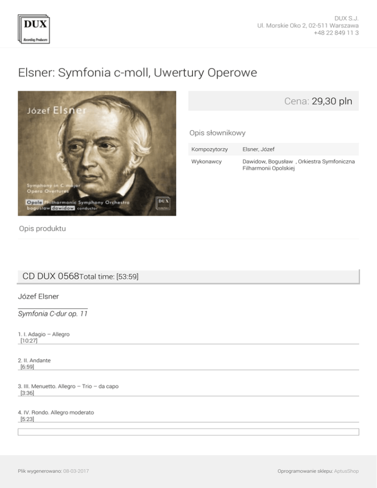 DUX S.J. Ul. Morskie Oko 2, 02-511 Warszawa +48 22 849 11 3 Elsner: Symfonia c-moll, Uwertury Operowe Cena: 29,30 pln Opis słownikowy Kompozytorzy Elsner, Józef ∎ Wykonawcy Dawidow, Bogusław ∎, Orkiestra Symfoniczna Filharmonii Opolskiej ∎ Opis produktu CD DUX 0568Total time: [53:59] Józef Elsner Symfonia C-dur op. 11 1. I. Adagio – Allegro [10:27] 2. II. Andante [6:59] 3. III. Menuetto. Allegro – Trio – da capo [3:36] 4. IV. Rondo. Allegro moderato [5:23] Plik wygenerowano: 08-03-2017 Oprogramowanie sklepu: AptusShop DUX S.J. Ul. Morskie Oko 2, 02-511 Warszawa +48 22 849 11 3 Józef Elsner Uwertura do opery Andromeda 5. Uwertura do opery „Andromeda” / Overture to the opera “Andromeda”. Adagio – Moderato poco agitato – Allegro assai [8:38] Józef Elsner Uwertura do opery Sułtan Wampun 6. Uwertura do opery „Sułtan Wampum”/ Overture to the opera “Sultan Vampum” [4:35] Józef Elsner Uwertura do opery Leszek Biały 7. Uwertura do opery „Leszek Biały” / Overture to the opera “Leszek the White”. (opr. / arr. Grzegorz Fitelberg) Adagio maestoso – Alla Polacca – Allegro [7:41] Józef Elsner Uwertura do opery Echo w lesie 8. Uwertura do opery „Echo w lesie” / Overture to the opera “The Echo in the Wood”. (opr. / arr. Jerzy Młodziejowski) Andantino – Allegro con brio [6:41] Wykonawcy: Orkiestra Symfoniczna Filharmonii Opolskiej Bogusław Dawidow /dyrygent/ Plik wygenerowano: 08-03-2017 Powered by TCPDF (www.tcpdf.org) Oprogramowanie sklepu: AptusShop