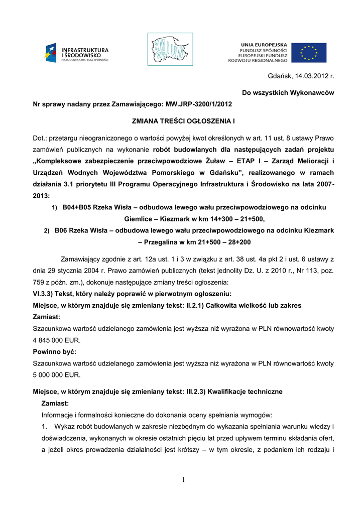 Gdańsk, 14.03.2012 r. Do wszystkich Wykonawców Nr sprawy nadany przez Zamawiającego: MW.JRP-3200/1/2012 ZMIANA TREŚCI OGŁOSZENIA I Dot.: przetargu nieograniczonego o wartości powyżej kwot określonych w art. 11 ust. 8 ustawy Prawo zamówień publicznych na wykonanie robót budowlanych dla następujących zadań projektu „Kompleksowe zabezpieczenie przeciwpowodziowe Żuław – ETAP I – Zarząd Melioracji i Urządzeń Wodnych Województwa Pomorskiego w Gdańsku”, realizowanego w ramach działania 3.1 priorytetu III Programu Operacyjnego Infrastruktura i Środowisko na lata 20072013: 1) B04+B05 Rzeka Wisła – odbudowa lewego wału przeciwpowodziowego na odcinku Giemlice – Kiezmark w km 14+300 – 21+500, 2) B06 Rzeka Wisła – odbudowa lewego wału przeciwpowodziowego na odcinku Kiezmark – Przegalina w km 21+500 – 28+200 Zamawiający zgodnie z art. 12a ust. 1 i 3 w związku z art. 38 ust. 4a pkt 2 i ust. 6 ustawy z dnia 29 stycznia 2004 r. Prawo zamówień publicznych (tekst jednolity Dz. U. z 2010 r., Nr 113, poz. 759 z późn. zm.), dokonuje następujące zmiany treści ogłoszenia: VI.3.3) Tekst, który należy poprawić w pierwotnym ogłoszeniu: Miejsce, w którym znajduje się zmieniany tekst: II.2.1) Całkowita wielkość lub zakres Zamiast: Szacunkowa wartość udzielanego zamówienia jest wyższa niż wyrażona w PLN równowartość kwoty 4 845 000 EUR. Powinno być: Szacunkowa wartość udzielanego zamówienia jest wyższa niż wyrażona w PLN równowartość kwoty 5 000 000 EUR. Miejsce, w którym znajduje się zmieniany tekst: III.2.3) Kwalifikacje techniczne Zamiast: Informacje i formalności konieczne do dokonania oceny spełniania wymogów: 1. Wykaz robót budowlanych w zakresie niezbędnym do wykazania spełniania warunku wiedzy i doświadczenia, wykonanych w okresie ostatnich pięciu lat przed upływem terminu składania ofert, a jeżeli okres prowadzenia działalności jest krótszy – w tym okresie, z podaniem ich rodzaju i 1 wartości, daty i miejsca wykonania oraz załączeniem dokumentu potwierdzającego, że roboty zostały wykonane zgodnie z zasadami sztuki budowlanej i prawidłowo ukończone. Wykonanie minimum: Wykonawca powinien wykazać się wykonaniem jednej lub kilku robót budowlanych polegających na budowie, przebudowie lub remoncie wałów przeciwpowodziowych, w tym wykonanie jednej lub kilku przesłon przeciwfiltracyjnych metodą WIPS w ilości ogółem nie mniejszej niż 10 000 m2, o sumarycznej wartości robót co najmniej 15 mln zł brutto. W przypadku Wykonawców rozliczających się w walutach innych niż PLN, Zamawiający dokona przeliczenia badanych wartości w dokumentach wg średniego kursu wymiany waluty ustalonego przez Narodowy Bank Polski na dzień publikacji ogłoszenia o zamówieniu w Suplemencie do Dziennika Urzędowego Unii Europejskiej. 2. Wykaz narzędzi, wyposażenia zakładu i urządzeń technicznych dostępnych wykonawcy robót budowlanych w celu realizacji zamówienia wraz z informacją o podstawie dysponowania tymi zasobami. Wymagane jest wykazanie dysponowania n/w potencjałem technicznym: - kafar lub wiertnice z osprzętem do wykonywania przesłon – 1 szt - oprzyrządowanie umożliwiające rejestrację i monitoring wykonywanej przesłony przeciwfiltracyjnej – 1 szt - kompletne wyposażenie stacji wytwarzania zaczynu cementowo – bentonitowego – 1 szt - koparko – spycharka – 1 szt - samochód samowyładowczy – 1 szt. 3. oświadczenie na temat wielkości średniego rocznego zatrudnienia u wykonawcy usług lub robót budowlanych oraz liczebności personelu kierowniczego w okresie ostatnich trzech lat przed upływem terminu składania ofert albo wniosków o dopuszczenie do udziału w postępowaniu, a w przypadku gdy okres prowadzenia działalności jest krótszy – w tym okresie. Wymagane jest średnie roczne zatrudnienie przynajmniej 10 pracowników budowlanych w każdym roku oraz zatrudnienie przynajmniej 1 kierownika budowy z uprawnieniami w zakresie budowli hydrotechnicznych w każdym roku. 4. Wykaz osób, które będą wykonywać zamówienie lub będą uczestniczyć w wykonywaniu zamówienia, wraz z informacjami na temat ich kwalifikacji zawodowych, doświadczenia i wykształcenia niezbędnych dla wykonania zamówienia, a także zakresu wykonywanych przez nie czynności. Wykazanie dysponowania następującymi osobami: kierownik budowy – powinien posiadać uprawnienia budowlane do sprawowania samodzielnych funkcji technicznych w budownictwie w zakresie budowli hydrotechnicznych, w rozumieniu przepisów ustawy z dnia 7 lipca 1994 r. Prawo budowlane (tekst jednolity Dz. U. z 2010 r., Nr 243, poz. 1623 z późn. zm.) oraz co najmniej 4 letnią praktykę zawodową. 5. Oświadczenie, że osoby, które będą uczestniczyć w wykonaniu zamówienia posiadają wymagane uprawnienia określone w pkt 4. 6. Ocena spełniania warunków udziału w postępowaniu oraz wykazanie braku podstaw do wykluczenia z postępowania o udzielenie zamówienia wykonawcy w okolicznościach, o których 2 mowa w rt. 24 ust. 1 i ust 2 pkt 1 ustawy dokonywane będą na podstawie dokumentów wymienionych wyżej, według formuły: spełnia / nie spełnia. Powinno być: Informacje i formalności konieczne do dokonania oceny spełniania wymogów: 1. Wykaz robót budowlanych w zakresie niezbędnym do wykazania spełniania warunku wiedzy i doświadczenia, wykonanych w okresie ostatnich pięciu lat przed upływem terminu składania ofert, a jeżeli okres prowadzenia działalności jest krótszy – w tym okresie, z podaniem ich rodzaju i wartości, daty i miejsca wykonania oraz załączeniem dokumentu potwierdzającego, że roboty zostały wykonane zgodnie z zasadami sztuki budowlanej i prawidłowo ukończone. Wykonanie minimum: Wykonawca powinien wykazać się wykonaniem jednej lub kilku robót budowlanych polegających na budowie, przebudowie lub remoncie wałów przeciwpowodziowych, w tym wykonaniem jednej lub kilku przesłon przeci