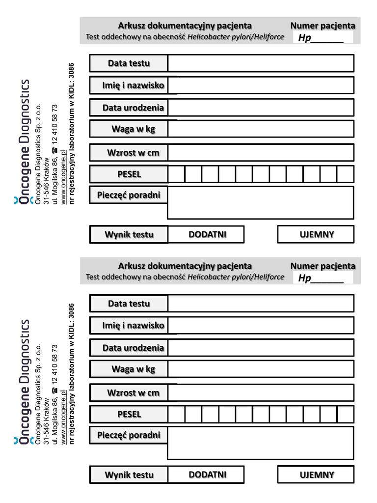 Oncogene Diagnostics Sp. z o.o. 31-546 Kraków ul. Mogilska 86,  12 410 58 73 www.oncogene.pl nr rejestracyjny laboratorium w KIDL: 3086 Arkusz dokumentacyjny pacjenta Numer pacjenta Test oddechowy na obecność Helicobacter pylori/Heliforce Hp______ Data testu Imię i nazwisko Data urodzenia Waga w kg Wzrost w cm PESEL Pieczęć poradni Oncogene Diagnostics Sp. z o.o. 31-546 Kraków ul. Mogilska 86,  12 410 58 73 www.oncogene.pl nr rejestracyjny laboratorium w KIDL: 3086 Wynik testu DODATNI UJEMNY Arkusz dokumentacyjny pacjenta Numer pacjenta Test oddechowy na obecność Helicobacter pylori/Heliforce Hp______ Data testu Imię i nazwisko Data urodzenia Waga w kg Wzrost w cm PESEL Pieczęć poradni Wynik testu DODATNI UJEMNY