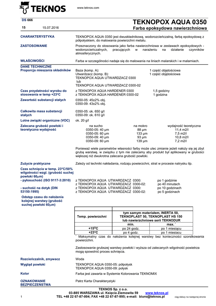 www.teknos.com DS 666 15 TEKNOPOX AQUA 0350 15.07.2016 Farba epoksydowa nawierzchniowa CHARAKTERYSTYKA TEKNOPOX AQUA 0350 jest dwuskładnikową, wodorozcieńczalną, farbą epoksydową z półpołyskiem, do malowania powierzchni metalu. ZASTOSOWANIE Przeznaczony do stosowania jako farba nawierzchniowa w zestawach epoksydowych wodorozcieńczalnych, pracujących w narażeniu na działanie czynników atmosferycznych. WŁAŚCIWOŚCI Farba w szczególności nadaje się do malowania na liniach malarskich i w malarniach. DANE TECHNICZNE Proporcja mieszania składników Baza (komp. A): Utwardzacz (komp. B): TEKNOPOX AQUA UTWARDZACZ 0300 lub TEKNOPOX AQUA UTWARDZACZ 0300-02 Czas przydatności wyrobu do stosowania w temp +23oC z TEKNOPOX AQUA HARDENER 0300 z TEKNOPOX AQUA HARDENER 0300-02 Zawartość substancji stałych 0350-05: 45±2% obj. 0350-09: 43±2% obj. Całkowita masa substancji stałych 0350-05: ok. 650 g/l 0350-09: ok. 610 g/l Lotne związki organiczne (VOC) ok. 20 g/l Zalecana grubość powłoki i teoretyczna wydajność na sucho 0350-05: 40 µm 0350-05: 60 µm 0350-09: 40 µm 0350-09: 60 µm 1 część objętościowa 1 część objętościowa 1,5 godziny 1 godzina na mokro 88 µm 133 µm 93 µm 139 µm wydajność teoretyczna 11,4 m2/l 7,5 m2/l 10,8 m2/l 7,2 m2/l Ponieważ wiele parametrów własności farby może ulec zmianie jeżeli nałoży się jej zbyt grubą warstwę, w związku z tym nie zalecamy aby produkt był aplikowany w grubości większej niż dwukrotna zalecana grubość powłoki. Zużycie praktyczne Zależy od techniki nakładania, rodzaju powierzchni, strat w procesie natrysku itp. 23oC/50% Czas schnięcia w temp. wilgotności wzgl. (grubość suchej powłoki 60µm) - pyłosuchość (ISO 9117-3:2010) z TEKNOPOX AQUA z TEKNOPOX AQUA - suchość na dotyk (DIN z TEKNOPOX AQUA 53150:1995) z TEKNOPOX AQUA UTWARDZACZ UTWARDZACZ UTWARDZACZ UTWARDZACZ 0300: 0300-02: 0300: 0300-02: po 1 godzinie po 40 minutach po 10 godzinach po 5 godzinach Odstęp czasu do nałożenia kolejnej warstwy (grubość suchej powłoki 60µm) tym samym materiałem, INERTA 50, TEKNOPLAST 50, TEKNOPLAST HS 150 lub nawierzchniowe serii TEKNODUR min. max. * +15OC po 24 godz. po 1 miesiącu +23oC po 4 godz. po 1 miesiacu * Maksymalny czas do nałożenia kolejnej warstwy bez konieczności szorstkowania powierzchni. Temp. powierzchni Zastosowanie grubszej warstwy powłoki i wyższa od zalecanych wilgotność powietrza mogą spowolnić proces schnięcia. Rozcieńczalnik, zmywacz Woda Wygląd powłoki TEKNOPOX AQUA 0350-05: półpołysk TEKNOPOX AQUA 0350-09: połysk Kolor Farba jest zawarta w Systemie Kolorowania TEKNOMIX OZNAKOWANIE BEZPIECZEŃSTWA Patrz Karta Charakterystyki 1 TEKNOS Sp. z o.o. www.teknos.pl 03-885 WARSZAWA ul. Księcia Ziemowita 59 TEL +48 22 67-87-004; FAX +48 22 67-87-995; e-mail: [email protected] ciąg dalszy na następnej stronie TEKNOPOX AQUA 0350 SPOSÓB STOSOWANIA Przygotowanie podłoża DS 666 - 15 strona 2 Usunąć z podłoża wszelkie zanieczyszczenia, które mogą niekorzystnie wpływać na proces przygotowania podłoża i malowania. Usunąć również rozpuszczalne w wodzie sole stosując odpowiednie metody. Powierzchnię należy oczyścić zależnie od rodzaju podłoża, jak niżej: Aluminium: Powierzchnię oczyścić środkiem czyszczącym do powierzchni ocynkowanych RENSA STEEL. Powierzchnie, które będą eksploatowane w warunkach atmosferycznych, podobnie jak podłoża cynkowe, należy także zszorstkować przez lekkie omiecenie ścierniwem lub piaskowanie (AlSaS). Powierzchnie malowane: Wszelkie zanieczyszczenia, które mogą niekorzystnie wpływać na nakładanie farby (np. tłuszcze i sole), usunąć. Powierzchnia musi być czysta i sucha. Stare, pomalowane powierzchnie, które przekroczyły maksymalny odstęp czasu do nałożenia kolejnej warstwy należy zszorstkować. Uszkodzone fragmenty pomalowanej powierzchni należy przygotować do ponownego malowania zgodnie z wymaganiami stawianymi przez rodzaj podłoża i sposób renowacji. Czas i miejsce przygotowywania powinny być dobrane tak, aby powierzchnia przed malowaniem nie była brudna i wilgotna. Przygotowanie wyrobu Należy przygotować tylko taką ilość farby, którą zużyje się w czasie krótszym niż czas przydatności wyrobu do stosowania. Przed malowaniem składniki farby zmieszać w prawidłowej proporcji ze sobą, dokładnie, w całej objętości naczynia. Niedokładne wymieszanie lub nieprawidłowy stosunek składników są przyczyną nieprawidłowego utwardzania i pogarszania się własności powłok. UWAGA! Mieszaniny składników nie można używać do malowania po upływie terminu czasu przydatności do stosowania. Warunki podczas nakładania Powierzchnia do malowania musi być sucha. Temperatura otaczającego powietrza, malowanej powierzchni i farby powinna być wyższa niż +15°C, a wilgotność względna powietrza poniżej 70% zarówno podczas nanoszenia jak i w okresie schnięcia wyrobu. Dodatkowo temperatura malowanej powierzchni i farby musi być przynajmniej o 3 °C wyższa od punktu rosy otaczającego powietrza. W czasie nanoszenia natryskiem wilgotność względna powietrza powinna być wyższa niż 30% dla uniknięcia zbyt szybkiego schnięcia materiału. Nakładanie Farbę przed użyciem dokładnie wymieszać. Farbę zaleca się nanosić natryskiem bezpowietrznym, natryskiem hydrodynamicznym z asystą powietrzną lub natryskiem konwencjonalnym. Farba pozwala na otrzymanie zakładanej grubości warstwy przy jednokrotnym malowaniu. Średnica dyszy do natrysku bezpowietrznego 0.011 - 0.015”. Natryskiwać równomiernie do osiągnięcia wymaganej grubości warstwy. Szczególnie starannie należy malować krawędzie, załamania konstrukcji i spawy. Małe powierzchnie mogą być malowane za pomocą pędzla, w tym przypadku zaleca się nałożenie dodatkowej warstwy farby aby osiągnąć zalecaną grubość wymalowania. INFORMACJE DODATKOWE Informacje dotyczące przechowywania umieszczone s