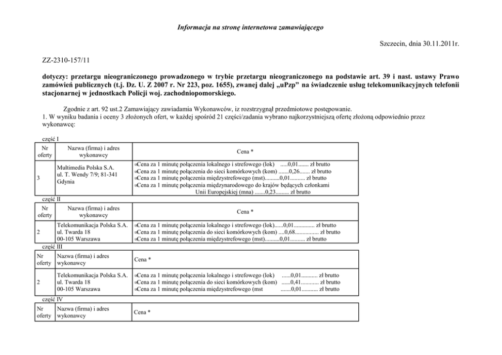 Informacja na stronę internetowa zamawiającego Szczecin, dnia 30.11.2011r. ZZ-2310-157/11 dotyczy: przetargu nieograniczonego prowadzonego w trybie przetargu nieograniczonego na podstawie art. 39 i nast. ustawy Prawo zamówień publicznych (t.j. Dz. U. Z 2007 r. Nr 223, poz. 1655), zwanej dalej „uPzp” na świadczenie usług telekomunikacyjnych telefonii stacjonarnej w jednostkach Policji woj. zachodniopomorskiego. Zgodnie z art. 92 ust.2 Zamawiający zawiadamia Wykonawców, iz rozstrzygnął przedmiotowe postępowanie. 1. W wyniku badania i oceny 3 złożonych ofert, w każdej spośród 21 części/zadania wybrano najkorzystniejszą ofertę złożoną odpowiednio przez wykonawcę: część I Nr oferty Nazwa (firma) i adres wykonawcy Multimedia Polska S.A. ul. T. Wendy 7/9; 81-341 Gdynia 3 Cena * •Cena za 1 minutę połączenia lokalnego i strefowego (lok) .....0,01....... zł brutto •Cena za 1 minutę połączenia do sieci komórkowych (kom) .......0,26....... zł brutto •Cena za 1 minutę połączenia międzystrefowego (mst)..........0,01.......... zł brutto •Cena za 1 minutę połączenia międzynarodowego do krajów będących członkami Unii Europejskiej (mna) .......0,23......... zł brutto część II Nr oferty 2 Nazwa (firma) i adres wykonawcy Telekomunikacja Polska S.A. ul. Twarda 18 00-105 Warszawa część III Nr Nazwa (firma) i adres oferty wykonawcy 2 Telekomunikacja Polska S.A. ul. Twarda 18 00-105 Warszawa Cena * •Cena za 1 minutę połączenia lokalnego i strefowego (lok)......0,01.............. zł brutto •Cena za 1 minutę połączenia do sieci komórkowych (kom) ....0,68................ zł brutto •Cena za 1 minutę połączenia międzystrefowego (mst)..........0,01.......... zł brutto Cena * •Cena za 1 minutę połączenia lokalnego i strefowego (lok) ......0,01........... zł brutto •Cena za 1 minutę połączenia do sieci komórkowych (kom) ......0,41............ zł brutto •Cena za 1 minutę połączenia międzystrefowego (mst .......0,01........... zł brutto część IV Nr Nazwa (firma) i adres oferty wykonawcy Cena * 3 Multimedia Polska S.A. ul. T. Wendy 7/9 81-341 Gdynia część V Nr Nazwa (firma) i adres oferty wykonawcy 3 Multimedia Polska S.A. ul. T. Wendy 7/9 81-341 Gdynia część VI Nr Nazwa (firma) i adres oferty wykonawcy 2 Nazwa (firma) i adres wykonawcy Telekomunikacja Polska S.A. ul. Twarda 18 00-105 Warszawa część X Nr Nazwa (firma) i adres oferty wykonawcy 3 Cena * •Cena za 1 minutę połączenia lokalnego i strefowego (lok) ......0,49........... zł brutto •Cena za 1 minutę połączenia do sieci komórkowych (kom) ......0,01............ zł brutto •Cena za 1 minutę połączenia międzystrefowego (mst .......0,49........... zł brutto Cena * Cena * Cena * Telekomunikacja Polska S.A. •Cena za 1 minutę połączenia lokalnego i strefowego (lok) ..0,01............... zł brutto ul. Twarda 18 •Cena za 1 minutę połączenia do sieci komórkowych (kom) ..0,32................ zł brutto 00-105 Warszawa •Cena za 1 minutę połączenia międzystrefowego (mst ...0,21............... zł brutto część IX Nr oferty 2 .......0,49........... zł brutto Telekomunikacja Polska S.A. •Cena za 1 minutę połączenia lokalnego i strefowego (lok) ...0,01.............. zł brutto ul. Twarda 18 •Cena za 1 minutę połączenia do sieci komórkowych (kom) ...0,33............... zł brutto 00-105 Warszawa •Cena za 1 minutę połączenia międzystrefowego (mst ....0,25.............. zł brutto część VIII Nr Nazwa (firma) i adres oferty wykonawcy 2 Cena za 1 minutę połączenia międzystrefowego (mst Telekomunikacja Polska S.A. •Cena za 1 minutę połączenia lokalnego i strefowego (lok) ...0,01.............. zł brutto ul. Twarda 18 •Cena za 1 minutę połączenia do sieci komórkowych (kom) ....0,38.............. zł brutto 00-105 Warszawa •Cena za 1 minutę połączenia międzystrefowego (mst ....0,21.............. zł brutto część VII Nr Nazwa (firma) i adres oferty wykonawcy 2 •Cena za 1 minutę połączenia lokalnego i strefowego (lok) ......0,49........... zł brutto •Cena za 1 minutę połączenia do sieci komórkowych (kom) ......0,01............ zł brutto Multimedia Polska S.A. ul. T. Wendy 7/9 81-341 Gdynia Cena * •Cena za 1 minutę połączenia lokalnego i strefowego (lok) ...0,01.............. zł brutto •Cena za 1 minutę połączenia do sieci komórkowych (kom) ....0,31.............. zł brutto •Cena za 1 minutę połączenia międzystrefowego (mst ....0,22.............. zł brutto Cena * •Cena za 1 minutę połączenia lokalnego i strefowego (lok) ..0,46............... zł brutto •Cena za 1 minutę połączenia do sieci komórkowych (kom) ...0,01............... zł brutto •Cena za 1 minutę połączenia międzystrefowego (mst ....0,46.............. zł brutto część XI Nr Nazwa (firma) i adres oferty wykonawcy 3 Multimedia Polska S.A. ul. T. Wendy 7/9 81-341 Gdynia część XII Nr Nazwa (firma) i adres oferty wykonawcy 3 Multimedia Polska S.A. ul. T. Wendy 7/9 81-341 Gdynia część XIII Nr Nazwa (firma) i adres oferty wykonawcy 3 Multimedia Polska S.A. ul. T. Wendy 7/9 81-341 Gdynia część XIV Nr Nazwa (firma) i adres oferty wykonawcy 2 Multimedia Polska S.A. ul. T. Wendy 7/9 81-341 Gdynia część XVI Nr Nazwa (firma) i adres oferty wykonawcy 3 •Cena za 1 minutę połączenia lokalnego i strefowego (lok) ....0,54............. zł brutto •Cena za 1 minutę połączenia do sieci komórkowych (kom) ....0,01.............. zł brutto •Cena za 1 minutę połączenia międzystrefowego (mst .....0,54............. zł brutto Cena * •Cena za 1 minutę połączenia lokalnego i strefowego (lok) ..0,57............... zł brutto •Cena za 1 minutę połączenia do sieci komórkowych (kom) ...0,01............... zł brutto •Cena za 1 minutę połączenia międzystrefowego (mst ....0,57.............. zł brutto Cena * •Cena za 1 minutę połączenia lokalnego i strefowego (lo