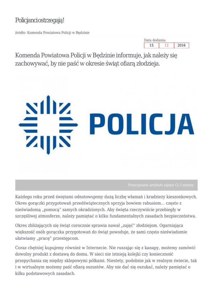 Policjanciostrzegają! źródło: Komenda Powiatowa Policji w Będzinie Data dodania: 15 12 2016 Komenda Powiatowa Policji w Będzinie informuje, jak należy się zachowywać, by nie paść w okresie świąt ofiarą złodzieja. Przeczytanie artykułu zajmie Ci 3 minuty Każdego roku przed świętami odnotowujemy dużą liczbę włamań i kradzieży kieszonkowych. Okres gorączki przygotowań przedświątecznych sprzyja bowiem rabusiom... często z nieświadomą „pomocą” samych okradzionych. Aby święta rzeczywiście przebiegły w szczęśliwej atmosferze, należy pamiętać o kilku fundamentalnych zasadach bezpieczeństwa. Okres zbliżających się świąt corocznie sprawia nawał „zajęć” złodziejom. Ogarniająca większość osób gorączka przygotowań do świąt powoduje, że sami często nieświadomie ułatwiamy „pracę” przestępcom. Coraz chętniej kupujemy również w Internecie. Nie ruszając się z kanapy, możemy zamówić dowolny produkt z dostawą do domu. W sieci nie istnieją kolejki czy konieczność przepychania się między sklepowymi półkami. Niestety, podobnie jak w realnym świecie, tak i w wirtualnym możemy paść ofiarą oszustów. Aby nie dać się oszukać, należy pamiętać o kilku podstawowych zasadach. Pośpiech i rozkojarzenie, to czynniki sprzyjające rabusiom. Złodzieje zbierają prawdziwe żniwo w supermarketach, na targowiskach, w autobusach komunikacji miejskiej i wszędzie tam, gdzie panuje tłok. Często sztucznie wywołany przez nich samych. Bądźmy więc ostrożni i zwracajmy uwagę na to, co dzieje się wokół nas. Aby zapobiec kradzieży, powinniśmy odpowiednio zabezpieczyć swoje rzeczy. Oto kilka podstawowych rad utrudniających życie złodziejom: 1. Pieniądze najlepiej schować do wewnętrznej kieszeni. Jeżeli wkładamy portfel, czy telefon komórkowy do torby lub plecaka to pamiętajmy, aby je zamykać i nosić przed sobą. Złodzieje najczęściej wybierają swoją ofiarę, którą obserwują przez pewien czas. Patrzą, gdzie chowa pieniądze. Podchodzą blisko i dotykając sprawdzają czy będzie reagować podczas kradzieży. Jeśli mamy na sobie grubą kurtkę, płaszcz czy kożuch, ich zadanie jest ułatwione. Nie należy również pozostawiać torebek w wózkach sklepowych bez nadzoru nawet na chwilę. 2. Podczas korzystania z bankomatów również możemy paść ofiarą złodziei i oszustów. Nieraz zatrzymywaliśmy przestępców, którzy montowali specjalne nakładki ze skanerami na klawiatury i czytniki kart magnetycznych albo minikamery do przechwycenia numeru PIN. Jeśli mamy jakiekolwiek podejrzenia, należy podzielić się nimi z Policją lub pobliskim bankiem. 3. Nigdy nie należy zapisywać numeru PIN i przechowywać go razem z kartą bankomatową. Jeśli mamy kłopoty z jego zapamiętaniem, możemy zapisać go np. w „komórce”, w ciągu cyfr numeru telefonu pod hasłem do określonej osoby. 4. Łupem złodziei kieszonkowych padają nie tylko portfele czy telefony komórkowe. Z trudem zdobyte miejsce na parkingu supermarketu, szybko zamknięte auto, wrzucone bezwiednie do kieszeni kluczyki i już biegniemy po koszyk. To najczęstszy scenariusz przedświątecznych zakupów. Wiele osób myśli, że ich auto jest bezpieczne, gdyż ma doskonałe zabezpieczenia. Niestety, jeśli złodziej upatrzy sobie interesujący go pojazd, to zdobycie kluczyków z zewnętrznej kieszeni kurtki czy marynarki dla kieszonkowca nie stanowi dużego wyzwania. A z oryginalnymi kluczykami najlepsze alarmy i immobilisery są bezwartościowe. 5. W podobny sposób mogą nam zostać skradzione klucze z domu, co w połączeniu ze zdobytym przez złodzieja adresem z naszych dokumentów, pozwala mu na szybkie przejęcie najcenniejszych przedmiotów z mieszkania. 6. Nawet krótkotrwałe opuszczenie samochodu może skończyć się kłopotami, jeśli na siedzeniach pozostawimy wartościowe przedmioty. Torebki, teczki, laptopy, portfele, biżuteria, telefony, nawigacje GPS czy inne gadżety elektroniczne są wypatrywane w samochodach przez włamywaczy. Nawet jeśli w pozostawionej torbie czy kurtce nie ma niczego wartościowego, złodziej o tym nie wie, licząc na cenny łup. Często rozbita szyba jest dużo więcej warta, niż skradziony ze środka przedmiot. Najlepiej zabierać rzeczy ze sobą, ponieważ wkładając je do bagażnika, możemy już być obserwowani. Mamy więc wpływ na to, czy po przyjściu na parking będziemy mieli do czego zapakować zakupy i czy nie będą one ostatnimi, z powodu „wyczyszczonego” przez złodziei konta... http://bedzin.slaska.policja.gov.pl/ka1/informacje/wiadomosci/189258,Nie-dajmy-sie-okrasc-przed-swietami.html Tagi: policjakradzieżporady D R U KUJ D RUKUJ DO PDF http://www.biip.slawkow.pl/print.php?pdf=true§ion=129&name=policjanci-ostrzegaja&con=1692&lang=us