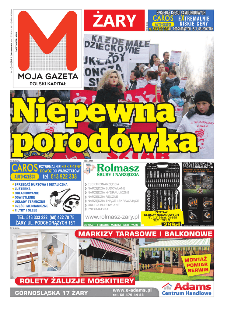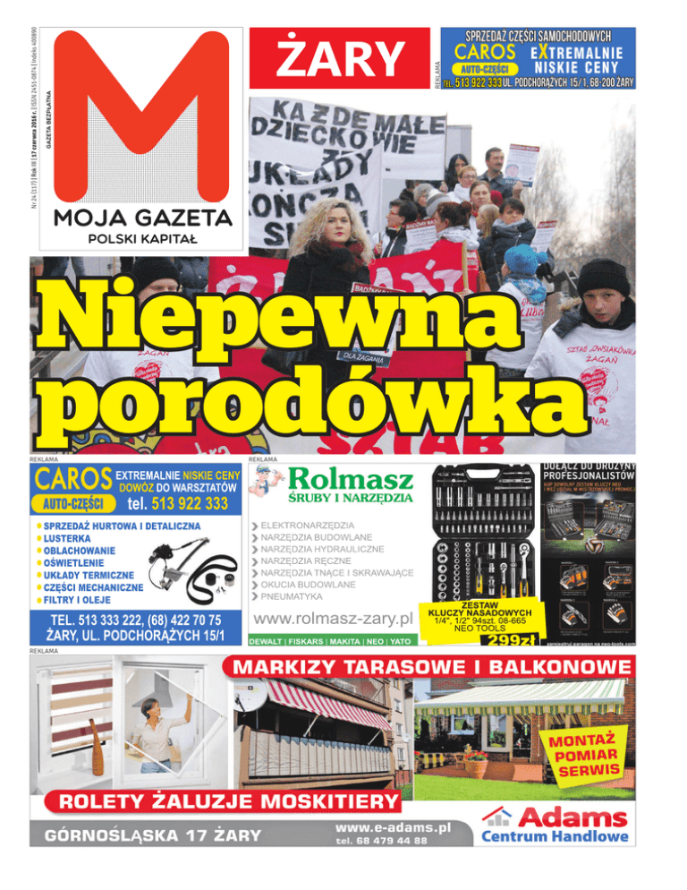 GAZETA BEZPŁATNA REKLAMA Nr 24 (117) | Rok III | 17 czerwca 2016 r. | ISSN 2451-0874 | Indeks 400890 M ŻARY MOJA GAZETA POLSKI KAPITAŁ Niepewna porodówka REKLAMA REKLAMA EXTREMALNIE NISKIE CENY DOWÓZ DO WARSZTATÓW tel. 513 922 333 SPRZEDAŻ HURTOWA I DETALICZNA LUSTERKA OBLACHOWANIE OŚWIETLENIE UKŁADY TERMICZNE CZĘŚCI MECHANICZNE FI FILTRY I OLEJE TEL. 513 333 222, (68) 422 70 75 ŻARY, UL. PODCHORĄŻYCH 15/1 REKLAMA ELEKTRONARZĘDZIA NARZĘDZIA BUDOWLANE NARZĘDZIA HYDRAULICZNE NARZĘDZIA RĘCZNE NARZĘDZIA TNĄCE I SKRAWAJĄCE OKUCIA BUDOWLANE PNEUM PNEUMATYKA www.rolmasz-zary.pl DEWALT | FISKARS | MAKITA | NEO | YATO ZESTAW KLUCZY NASADOWYCH 1/4", 1/2" 94szt. 08-665 NEO TOOLS 299zł zarejestruj paragon na neo-tools.com 2 OPINIE KOMENTARZE 17 czerwca 2016 Do działania natychmiast wkroczyli policjanci z grupy realizacyjnej Piątek 20° Aneta Berestecka Oficer Prasowy Komendy Powiatowej Policji w Żarach Esbecy wspomogą budżet 17 czerwca MojaGazeta SO ND PN WT ŚR CZ 23° 23° 24° 27° 29° 20° 13° 13° 12° 14° 16° 18° Kto zarobi więcej REGION Dwieście milionów złotych zaoszczędzi Skarb Państwa na zmniejszeniu emerytur wypłacanym byłym esbekom. Takiej decyzji nie podjął do tej pory żaden polityk. PiS chce, żeby byli esbecy dostawali emerytury na poziomie średnich świadczeń wypłacanych przez Zakład Ubezpieczeń Społecznych. To oznacza, że ludzie, którzy przez lata PRL-u prześladowali opozycjonistów nie będą korzystać ze specjalnych przywilejów. Do dzisiaj średnia esbecka emerytura jest kilka razy wyższa niż świadczenie wypłacane nauczycielowi czy robotnikowi. Paradoks polega na tym, że dawni kaci żyją na znacznie wyższym poziomie niż ich ofiary. Byli opozycjoniści, sekowani i prześladowani do 1989 roku często pobierają minimalne świadczenia, które nie wystarczają na godne życie. Tymczasem ich katom państwo płaci po kilka tysięcy miesięcznie, pozwalając przy tym na swobodne dorabianie bez niebezpieczeństwa utraty emerytury jak to jest w przypadku „zwykłych obywateli”. Przykładów takiej sytuacji nie trzeba szukać daleko. Były szef żarskiej bezpieki do niedawna obok emerytury, dostawał pensję bo nadal był czynny zawodowo. Tuż obok niego ofiary żyją na skraju ubóstwa. AG REGION Dwa tysiące złotych ma wynosić minimalna płaca już od stycznia 2017 roku. Nie jest to kwota porażająco wysoka, ale tysiące mieszkańców Żar i Żagania poczują, że ich portfele są cięższe. Zwiększeniem kwoty minimalnego wynagrodzenia zajął się rząd. Co prawda decyzja ta jest mocno krytykowana przez wielu pracodawców, których interesem jest płacić pracownikowi jak najmniej, to mało kto za- uważa, że wyższe wynagrodzenia w sposób prosty przekładają się na stan gospodarki i finansów publicznych. Z danych Eurostatu wynika, że aż blisko sześćdziesiąt procent osób zatrudnionych na umowę o pracę w naszym regionie jest wynagradzanych na minimalnym poziomie. Niskie płace nie tylko powodują, że ludzie ci są zmuszeni żyć skromnie, ale płacą mniejsze podatki i w mniejszym stopniu są konsumentami towarów i usług. A właśnie konsumpcja, czyli możliwość zrobienia większych zakupów najbardziej napędza gospodarkę. Większa płaca, to większe zakupy, wyższe podatki pośrednie i w końcu więcej miejsc pracy. Z decyzji rządzących nie są zadowoleni pracodawcy. Wielu z nich uważa, że dwa tysiące złotych brutto, to kwota zbyt wygórowana. Zapominają przy tym, że pieniądze dzisiaj wypłacone pracownikowi za jakiś czas do nich wrócą. W formie dodatkowych zleceń, większego utargu i wyższych obrotów. Z decyzji rządzących powinny być też zadowoleni samorządowcy. Wyższa płaca minimalna, to także wyższe kwoty podatku PiT płacone przez najmniej zarabiających. A przecież każdy samorząd ma w tym podatku swój udział. W efekcie podwyżka płac zwiększy budżet. AG Wyniki pomiarów powietrza w Żarach Miesiąc - dzień 9 czerwca 2016 r. 10 czerwca 2016 r. 11 czerwca 2016 r. 12 czerwca 2016 r. 13 czerwca 2016 r. 14 czerwca 2016 r. 15 czerwca 2016 r. Formaldehyd Pył PM-10 Pył PM-2,5 Formaldehyd Pył PM-10 Pył PM-2,5 Dwutlenek siarki (SO2) Tlenek azotu (NO) Dwutlenek azotu (NO2) Tlenek węgla (CO) brak wyników brak wyników brak wyników brak wyników brak wyników brak wyników brak wyników nie badano nie badano 13 µg/m3 16 µg/m3 15 µg/m3 13 µg/m3 10 µg/m3 brak wyników brak wyników brak wyników brak wyników brak wyników brak wyników brak wyników nie badano nie badano 6,7 µg/m3 7,2 µg/m3 7,9 µg/m3 11,8 µg/m3 8,8 µg/m3 nie badano nie badano nie badano nie badano nie badano nie badano nie badano nie badano nie badano nie badano nie badano nie badano nie badano nie badano nie badano nie badano 255 µg/m3 293 µg/m3 376 µg/m3 267 µg/m3 195 µg/m3 powoduje podrażnienia górnych dróg oddechowych oraz śluzówkek oczu, nosa i gardła. Przy wyższej koncentracji dochodzi ból głowy, duszności, nudności i łzawienia oczu. Badania przeprowadzone na szczurach wykazywały jego rakotwórcze działanie. Poziom dopuszczalny 4 μg/m3 powoduje zwiększenie zachorowalności na choroby układu oddechowego. Poziom dopuszczalny 40 μg/m3 powoduje podrażnienie naskórka i śluzówki, zapalenie górnych dróg oddechowych oraz wywołuje choroby alergiczne, astmę, nowotwory płuc, gardła i krtani. Poziom dopuszczalny 25 μg/m3 MojaGazeta NA PIERWSZYM PLANIE 3 17 czerwca 2016 REGION Gdzie będą się rodzić dzieci Niepewna przyszłość porodówki Dyrektor Gaik przyznaje, że nie zna odpowiedzi dlaczego w Żaganiu rodzi się więcej dzieci. Marek Femlak i Sławomir Gaik mają do 10 września przekazać szczegółowy raport i analizę ekonomiczną oddziałów: ginekologiczno-położniczego i noworodkowego do Ministerstwa Obrony Narodowej. Decyzja o dalszych losach żagańskiej porodówki zapadnie po tym terminie w Warszawie. fot. HG Dzieci w Żaganiu będą rodzić się 
