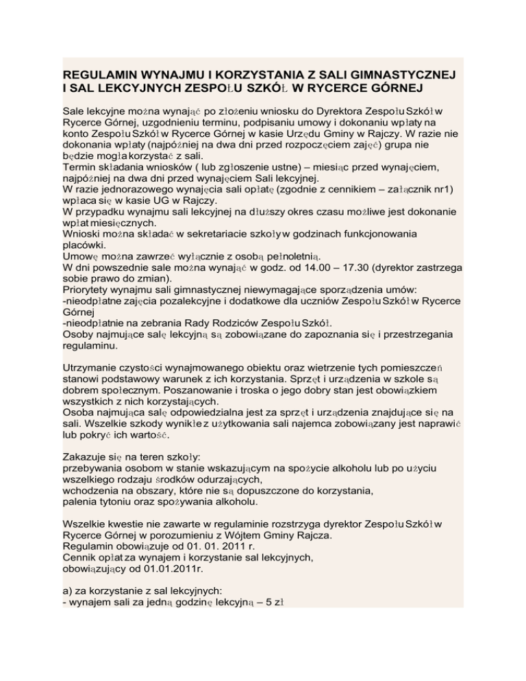 REGULAMIN WYNAJMU I KORZYSTANIA Z SALI GIMNASTYCZNEJ I SAL LEKCYJNYCH ZESPO ŁU SZKÓ Ł W RYCERCE GÓRNEJ Sale lekcyjne można wynająć po złożeniu wniosku do Dyrektora Zespołu Szkół w Rycerce Górnej, uzgodnieniu terminu, podpisaniu umowy i dokonaniu wpłaty na konto Zespołu Szkół w Rycerce Górnej w kasie Urzędu Gminy w Rajczy. W razie nie dokonania wpłaty (najpóźniej na dwa dni przed rozpocz ęciem zaj ęć) grupa nie będzie mogła korzystać z sali. Termin składania wniosków ( lub zgłoszenie ustne) – miesi ąc przed wynaj ęciem, najpóźniej na dwa dni przed wynaj ęciem Sali lekcyjnej. W razie jednorazowego wynajęcia sali opłatę (zgodnie z cennikiem – załącznik nr1) wpłaca się w kasie UG w Rajczy. W przypadku wynajmu sali lekcyjnej na dłuższy okres czasu mo żliwe jest dokonanie wpłat miesięcznych. Wnioski można składać w sekretariacie szkoły w godzinach funkcjonowania placówki. Umowę można zawrzeć wyłącznie z osobą pełnoletnią. W dni powszednie sale można wynająć w godz. od 14.00 – 17.30 (dyrektor zastrzega sobie prawo do zmian). Priorytety wynajmu sali gimnastycznej niewymagaj ące sporz ądzenia umów: -nieodpłatne zajęcia pozalekcyjne i dodatkowe dla uczniów Zespołu Szkół w Rycerce Górnej -nieodpłatnie na zebrania Rady Rodziców Zespołu Szkół. Osoby najmujące salę lekcyjną są zobowiązane do zapoznania si ę i przestrzegania regulaminu. Utrzymanie czystości wynajmowanego obiektu oraz wietrzenie tych pomieszcze ń stanowi podstawowy warunek z ich korzystania. Sprz ęt i urz ądzenia w szkole s ą dobrem społecznym. Poszanowanie i troska o jego dobry stan jest obowi ązkiem wszystkich z nich korzystających. Osoba najmująca salę odpowiedzialna jest za sprz ęt i urz ądzenia znajduj ące si ę na sali. Wszelkie szkody wynikłe z użytkowania sali najemca zobowi ązany jest naprawi ć lub pokryć ich wartość. Zakazuje się na teren szkoły: przebywania osobom w stanie wskazującym na spożycie alkoholu lub po u życiu wszelkiego rodzaju środków odurzaj ących, wchodzenia na obszary, które nie s ą dopuszczone do korzystania, palenia tytoniu oraz spożywania alkoholu. Wszelkie kwestie nie zawarte w regulaminie rozstrzyga dyrektor Zespołu Szkół w Rycerce Górnej w porozumieniu z Wójtem Gminy Rajcza. Regulamin obowiązuje od 01. 01. 2011 r. Cennik opłat za wynajem i korzystanie sal lekcyjnych, obowiązujący od 01.01.2011r. a) za korzystanie z sal lekcyjnych: - wynajem sali za jedną godzin ę lekcyjną – 5 zł
