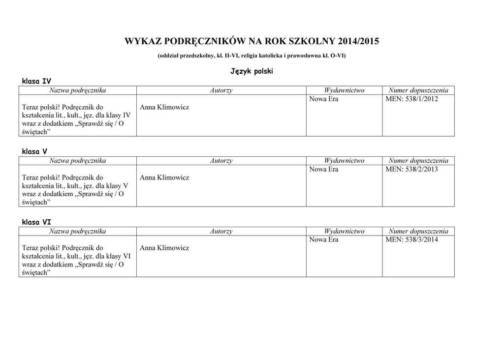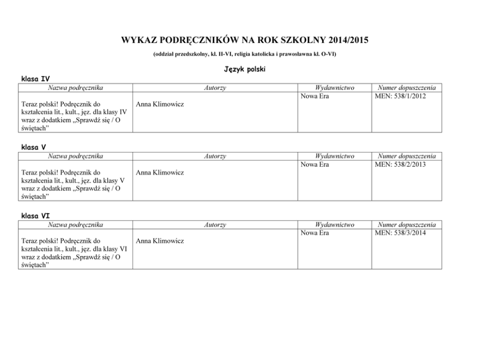 WYKAZ PODRĘCZNIKÓW NA ROK SZKOLNY 2014/2015 (oddział przedszkolny, kl. II-VI, religia katolicka i prawosławna kl. O-VI) Język polski klasa IV Nazwa podręcznika Teraz polski! Podręcznik do kształcenia lit., kult., jęz. dla klasy IV wraz z dodatkiem „Sprawdź się / O świętach” Autorzy Wydawnictwo Nowa Era Numer dopuszczenia MEN: 538/1/2012 Autorzy Wydawnictwo Nowa Era Numer dopuszczenia MEN: 538/2/2013 Autorzy Wydawnictwo Nowa Era Numer dopuszczenia MEN: 538/3/2014 Anna Klimowicz klasa V Nazwa podręcznika Teraz polski! Podręcznik do kształcenia lit., kult., jęz. dla klasy V wraz z dodatkiem „Sprawdź się / O świętach” Anna Klimowicz klasa VI Nazwa podręcznika Teraz polski! Podręcznik do kształcenia lit., kult., jęz. dla klasy VI wraz z dodatkiem „Sprawdź się / O świętach” Anna Klimowicz Język angielski klasa I Nazwa podręcznika New English Adventure Poziom 1 (podręcznik) zostanie zakupiony przez szkołę klasa II Nazwa podręcznika English Adventure 2 (nowa podstawa programowa – wydanie uzupełnione) klasa III Nazwa podręcznika English Adventure 3 (nowa podstawa programowa – wydanie uzupełnione) klasa IV Nazwa podręcznika Discover English 1 + ćwiczenia Autorzy Bessa Lochowski, Cristiana Bruni, Regina Raczyńska Autorzy Anne Worrall, Cristiana Bruni Autorzy Anne Worrall, Cristiana Bruni Autorzy Izabella Hearn, Jayne Wildman Wydawnictwo Pearson Wydawnictwo Pearson Wydawnictwo Pearson Wydawnictwo Pearson Numer dopuszczenia MEN: 680/1/2014 Numer dopuszczenia MEN: 67/3/2010/z1 Numer dopuszczenia MEN: 67/4/2010/z1 Numer dopuszczenia MEN: 402/2/2011 klasa V Nazwa podręcznika Discover English 2 + ćwiczenia Autorzy Izabella Hearn, Jayne Wildman Wydawnictwo Pearson Numer dopuszczenia MEN: 402/3/2011 klasa VI Nazwa podręcznika Look 3 (bez ćwiczeń) Autorzy Steve Elsworth, Jim Rose, Małgorzata Tetiurka Wydawnictwo Numer dopuszczenia Pearson MEN: 252/3/2010 Autorzy Małgorzata Dobrowolska, Marta Jucewicz, Piotr Zarzycki Wydawnictwo Gdańskie Wydawnictwo Oświatowe Numer dopuszczenia MEN: 340/1/2011 Autorzy Małgorzata Dobrowolska, Marta Jucewicz, Marcin Karpiński, Piotr Zarzycki Wydawnictwo Gdańskie Wydawnictwo Oświatowe Numer dopuszczenia MEN: 340/2/2013 Autorzy Małgorzata Dobrowolska, Marta Jucewicz, Marcin Karpiński, Piotr Zarzycki Wydawnictwo Gdańskie Wydawnictwo Oświatowe Numer dopuszczenia MEN: 340/3/2014 Matematyka klasa IV Nazwa podręcznika Matematyka 4 (podręcznik + zbiór zadań) (bez ćwiczeń) Nazwa serii: Matematyka z plusem klasa V Nazwa podręcznika Matematyka 5 (podręcznik+ zbiór zadań) (bez ćwiczeń) Nazwa serii: Matematyka z plusem klasa VI Nazwa podręcznika Matematyka 6 (nowa wersja) (podręcznik+ zbiór zadań) (bez ćwiczeń) Nazwa serii: Matematyka z plusem Zajęcia techniczne klasa IV Nazwa podręcznika Zajęcia techniczne cz. komunikacyjna. Podręcznik dla szkoły podstawowej klasa V i VI Nazwa podręcznika Zajęcia techniczne cz. techniczna. Podręcznik dla szkoły podstawowej Autorzy Urszula Białka, Jerzy Chrabąszcz Autorzy Urszula Białka, Jerzy Chrabąszcz Wydawnictwo OPERON Wydawnictwo OPERON Numer dopuszczenia MEN: 384/1/2011 Numer dopuszczenia MEN: 384/2/2012 Przyroda klasa IV Nazwa podręcznika Autorzy Tajemnice przyrody - podręcznik Maria Marko-Worłowska, Feliks Szlajfer, Joanna Stawarz Tajemnice przyrody – ćwiczenia cz. I i II Jolanta Golanko, Urszula Moździerz, Joanna Stawarz Wydawnictwo Nowa Era Numer dopuszczenia MEN: 399/1/2011 klasa V Nazwa podręcznika Autorzy Wydawnictwo Tajemnice przyrody - podręcznik Feliks Szlajfer, Janina Ślusarczyk, Ryszard Kozik Nowa Era Tajemnice przyrody – ćwiczenia cz. I Jolanta Golanko, Urszula Moździerz, Dominik Marszał Nowa Era Numer dopuszczenia MEN: 399/2/2013 Tajemnice przyrody – ćwiczenia cz. II Teresa Paczkowska, Joanna Stawarz, Dominik Marszał Nowa Era klasa VI Nazwa podręcznika Autorzy Wydawnictwo Tajemnice przyrody - podręcznik Joanna Stawarz, Feliks Szlajfer, Hanna Kowalczyk Nowa Era Tajemnice przyrody – ćwiczenia cz. I Dominik Marszał, Monika Mochnacz, Joanna Stawarz Nowa Era Tajemnice przyrody – ćwiczenia cz. II Dominik Marszał, Maria Marko-Worłowska, Joanna Stawarz, Małgorzata Mańska Nowa Era Numer dopuszczenia MEN: 399/3/2014 Historia i społeczeństwo klasa IV Nazwa podręcznika My i historia - podręcznik Autorzy Bogumiła Olszewska, Wiesława Surdyk-Ferstch Wydawnictwo Wydawnictwo Szkolne PWN Numer dopuszczenia MEN: 369/1/2011 klasa V Nazwa podręcznika My i historia - podręcznik Autorzy Bogumiła Olszewska, Wiesława Surdyk-Ferstch Wydawnictwo Wydawnictwo Szkolne PWN Numer dopuszczenia MEN: 369/2/2012 klasa VI Nazwa podręcznika My i historia - podręcznik Autorzy Wydawnictwo Bogumiła Olszewska, Wiesława Surdyk-Ferstch Wydawnictwo Szkolne PWN Numer dopuszczenia MEN: 369/3/2013 Plastyka klasa IV Nazwa podręcznika Plastyka. Lubię tworzyć. Klasa IV (bez ćwiczeń) Autorzy Wojciech Sygut, Marzena Kwiecień Wydawnictwo MAC Edukacja Numer dopuszczenia MEN: 397/1/2012 klasa V Nazwa podręcznika Plastyka. Lubię tworzyć. Klasa V (bez ćwiczeń) Autorzy Wojciech Sygut, Marzena Kwiecień Wydawnictwo MAC Edukacja Numer dopuszczenia MEN: 397/2/2013 klasa VI Nazwa podręcznika Plastyka 4-6 Autorzy Stanisław K. Storczyk, Barbara Neubart, Beata Mikulik Wydawnictwo WSiP Numer dopuszczenia MEN: 533/2012 Muzyka klasa IV Nazwa podręcznika Muzyczny świat (podręcznik + ćwiczenie) Autorzy Teresa Wójcik Wydawnictwo MAC Edukacja Numer dopuszczenia MEN: 495/1/2012 klasa V Nazwa podręcznika Muzyczny świat (podręcznik + ćwiczenie) Autorzy Teresa Wójcik Wydawnictwo MAC Edukacja Numer dopuszczenia MEN: 495/2/2013 klasa VI Nazwa podręcznika I gra muzyka. Podręcznik do muzyki dla klas 4-6 szkoły podstawowej Autorzy Monika Gromek, Grażyna Kilbach Wydawnictwo Nowa Era Numer dopuszczenia MEN: 569/2012 Zajęcia komputerowe klasa IV Nazwa podręcznika Zajęcia komputerowe z pomysłem. Podręcznik z ćwiczeniami. Klasa 4. Autorzy Wa