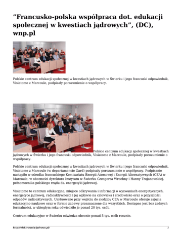 ”Francusko-polska współpraca dot. edukacji społecznej w kwestiach jądrowych”, (DC), wnp.pl Polskie centrum edukacji społecznej w kwestiach jądrowych w Świerku i jego francuski odpowiednik, Visiatome z Marcoule, podpisały porozumienie o współpracy. Polskie centrum edukacji społecznej w kwestiach jądrowych w Świerku i jego francuski odpowiednik, Visiatome z Marcoule, podpisały porozumienie o współpracy. Polskie centrum edukacji społecznej w kwestiach jądrowych w Świerku i jego francuski odpowiednik, Visiatome z Marcoule (w departamencie Gard) podpisały porozumienie o współpracy. Podpisanie nastąpiło w ośrodku francuskiego Komisariatu Energii Atomowej i Energii Alternatywnych (CEA) w Marcoule, w obecności dyrektora Instytutu w Świerku Grzegorza Wrochny i Hanny Trojanowskiej, pełnomocnika polskiego rządu ds. energetyki jądrowej. Visiatome to centrum edukacyjne, miejsce odkrywania i informacji o wyzwaniach energetycznych, energetyce jądrowej, radioaktywności i jej wpływie na człowieka i środowisko oraz o przyszłości odpadów radioaktywnych. Usytuowane przy wejściu do siedziby CEA w Marcoule oferuje zajęcia edukacyjno-naukowe oraz w formie zabawy przeznaczone dla wszystkich. Dostępne jest bez żadnych formalności, w ubiegłym roku odwiedziło je ponad 20 tys. osób. Centrum edukacyjne w Świerku odwiedza obecnie ponad 5 tys. osób rocznie. http://elektrownia-jadrowa.pl/ 1 Oba ośrodki pragną wymieniać doświadczenia i poznawać metody pracy w dziedzinie informacji społecznej i rozpowszechniania wiedzy naukowej. Edukacja i akceptacja przez społeczeństwo to w istocie ważne składowe polskiego programu energetyki jądrowej, a centrum w Świerku, rozwijając się we współpracy z Visiatome, zamierza przyjmować 100 tys. osób rocznie. http://elektrownia-jadrowa.pl/ 2