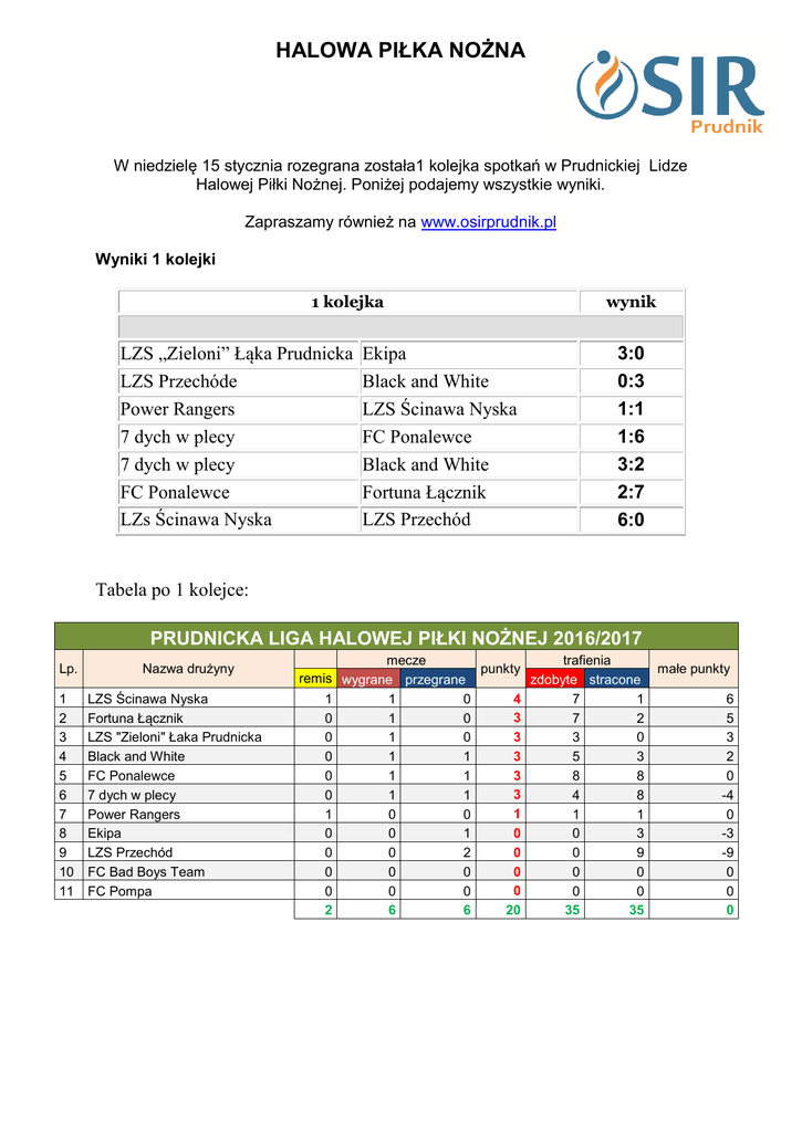 HALOWA PIŁKA NOŻNA W niedzielę 15 stycznia rozegrana została1 kolejka spotkań w Prudnickiej Lidze Halowej Piłki Nożnej. Poniżej podajemy wszystkie wyniki. Zapraszamy również na www.osirprudnik.pl Wyniki 1 kolejki 1 kolejka LZS „Zieloni” Łąka Prudnicka LZS Przechóde Power Rangers 7 dych w plecy 7 dych w plecy FC Ponalewce LZs Ścinawa Nyska Ekipa Black and White LZS Ścinawa Nyska FC Ponalewce Black and White Fortuna Łącznik LZS Przechód wynik 3:0 0:3 1:1 1:6 3:2 2:7 6:0 Tabela po 1 kolejce: PRUDNICKA LIGA HALOWEJ PIŁKI NOŻNEJ 2016/2017 Lp. 1 2 3 4 5 6 7 8 9 10 11 Nazwa drużyny LZS Ścinawa Nyska Fortuna Łącznik LZS "Zieloni" Łaka Prudnicka Black and White FC Ponalewce 7 dych w plecy Power Rangers Ekipa LZS Przechód FC Bad Boys Team FC Pompa mecze trafienia punkty małe punkty remis wygrane przegrane zdobyte stracone 4 1 1 0 7 1 6 3 0 1 0 7 2 5 3 0 1 0 3 0 3 3 0 1 1 5 3 2 3 0 1 1 8 8 0 3 0 1 1 4 8 -4 1 1 0 0 1 1 0 0 0 0 1 0 3 -3 0 0 0 2 0 9 -9 0 0 0 0 0 0 0 0 0 0 0 0 0 0 2 6 6 20 35 35 0