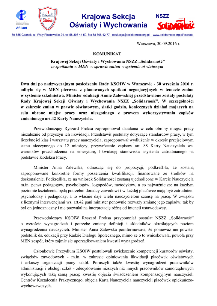 . Afiliant Krajowa Sekcja Oświaty i Wychowania 80-855 Gdańsk, ul. Wały Piastowskie 24, tel.58 308 44 59, fax 58 308 42 77 [email protected] NSZZ www.solidarnosc.org.pl/oswiata Warszawa, 30.09.2016 r. KOMUNIKAT Krajowej Sekcji Oświaty i Wychowania NSZZ „Solidarność” ze spotkania w MEN w sprawie zmian w systemie oświatowym Dwa dni po nadzwyczajnym posiedzeniu Rady KSOIW w Warszawie - 30 września 2016 r. odbyło się w MEN pierwsze z planowanych spotkań negocjacyjnych w temacie zmian w systemie szkolnictwa. Minister edukacji Annie Zalewskiej przedstawione zostały postulaty Rady Krajowej Sekcji Oświaty i Wychowania NSZZ „Solidarność”. W szczególności w zakresie zmian w prawie oświatowym, siatki godzin, koniecznych działań mających na celu obronę miejsc pracy oraz niezgodnego z prawem wykorzystywania zapisów zmienionego art.42 Karty Nauczyciela. Przewodniczący Ryszard Proksa zaproponował działania w celu obrony miejsc pracy niezależnie od przyczyn ich likwidacji. Przedstawił postulaty dotyczące standardów pracy, w tym liczebności klas i warsztatu pracy nauczyciela, zaproponował wydłużenie w okresie przejściowym stanu nieczynnego do 12 miesięcy, przywrócenie zapisów art. 88 Karty Nauczyciela ws. warunków przechodzenia na emeryturę, likwidację stanowiska asystenta zatrudnianego na podstawie Kodeksu Pracy. Minister Anna Zalewska, odnosząc się do propozycji, podkreśliła, że zostaną zaproponowane konkretne formy poszerzenia kwalifikacji, finansowane ze środków na doskonalenie. Podkreśliła, że na wniosek Solidarności zostaną ujednolicone w Karcie Nauczyciela m.in. pensa pedagogów, psychologów, logopedów, metodyków, a co najważniejsze na każdym poziomie kształcenia będą potrzebni doradcy zawodowi i w każdej placówce mają być zatrudnieni psycholodzy i pedagodzy, a to właśnie daje wielu nauczycielom szansę na pracę. W związku z licznymi interwencjami ws. art.42 pani minister ponownie rozważy zmianę jego zapisów, tak by był on jednoznaczny i nie pozwalał na interpretację różną od intencji ustawodawcy. Przewodniczący KSOiW Ryszard Proksa przypomniał postulat NSZZ „Solidarność” o wzroście wynagrodzeń i potrzebę zmiany definicji i składników określających poziom wynagrodzenia nauczycieli. Minister Anna Zalewska poinformowała, że ponieważ nie powstał podstolik ds. edukacji przy Radzie Dialogu Społecznego, mimo że o to wnioskowała, powoła przy MEN zespół, który zajmie się uporządkowaniem kwestii wynagrodzeń. Członkowie Prezydium KSOiW postulowali zwiększenie kompetencji kuratorów oświaty, związków zawodowych - m.in. w zakresie opiniowania likwidacji placówek oświatowych i arkuszy organizacji pracy szkół. Poruszyli także kwestię wynagrodzeń pracowników administracji i obsługi szkół - zdecydowanie niższych niż innych pracowników samorządowych wykonujących taką samą pracę; kwestię objęcia świadczeniem kompensacyjnym nauczycieli Centrów Kształcenia Praktycznego, objęcia Kartą Nauczyciela nauczycieli placówek opiekuńczowychowawczych. Minister Anna Zalewska podkreśliła, że wiele z przedstawionych propozycji wymaga dodatkowych środków finansowych, a to oznacza konieczność rozmów i zgody rządu RP. Dlatego kolejnym działaniem Prezydium, zgodnie z uchwałą Rady KSOiW z 28 09.2016 r., będą rozmowy z rządem i Radą Dialogu oraz Komisją Krajową. Krajową Sekcję Oświaty i Wychowania NSZZ „Solidarność” na spotkaniu reprezentowali: przewodniczący Ryszard Proksa, Henryk Ślusarski, Jolanta Kornel, Danuta Utrata, Lesław Ordon, Andrzej Piegutkowski. Ryszard Proksa przewodniczący KSOiW NSZZ „Solidarność”