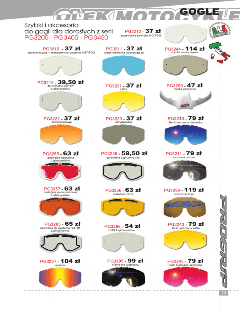 GOGLE Szybki i akcesoria do gogli dla doroslych z serii PG3200 - PG3400 - PG3450 PG3210 - 37 zł przeźroczysta - jednostronna powłoka ANTIFOG PG3215 - 39,50 do systemu roll-off Lightsensitive zł PG3212 - 37 zł dwustronna powłoka NO FOG PG3211 - 37 zł PG3244 - 114 PG3221 - 37 zł PG3250 - 47 zł zł PG3240 - 79 zł jasna niebieska wyostrzająca żółta szybka polaryzująca maska ochronna zł PG3222 - 37 zł PG3220 - 37 PG3255 - 63 zł PG3235 - 59,50 PG3257 - 63 zł PG3256 - 63 zł PG3296 - 119 zł PG3298 - 54 zł PG3243 - 79 zł PG3245 - 79 zł pomarańczowa podwójna czerwona Lightsensitive podwójna pomarańczowa Lightsensitive PG3265 - 65 zł podwójna do systemu roll-off Lightsensitive PG3297 - 104 rainbow zł przydymiana podwójna Lightsensitive podwójna żółta DUO Lightsensitive PG3295 - 99 flash lustrzana niebieska zł zł sferyczna lustrzana PG3241 - 79 lustrzana chrom zł sferyczna logo flash lustrzana żółta flash lustrzana czerwona 73