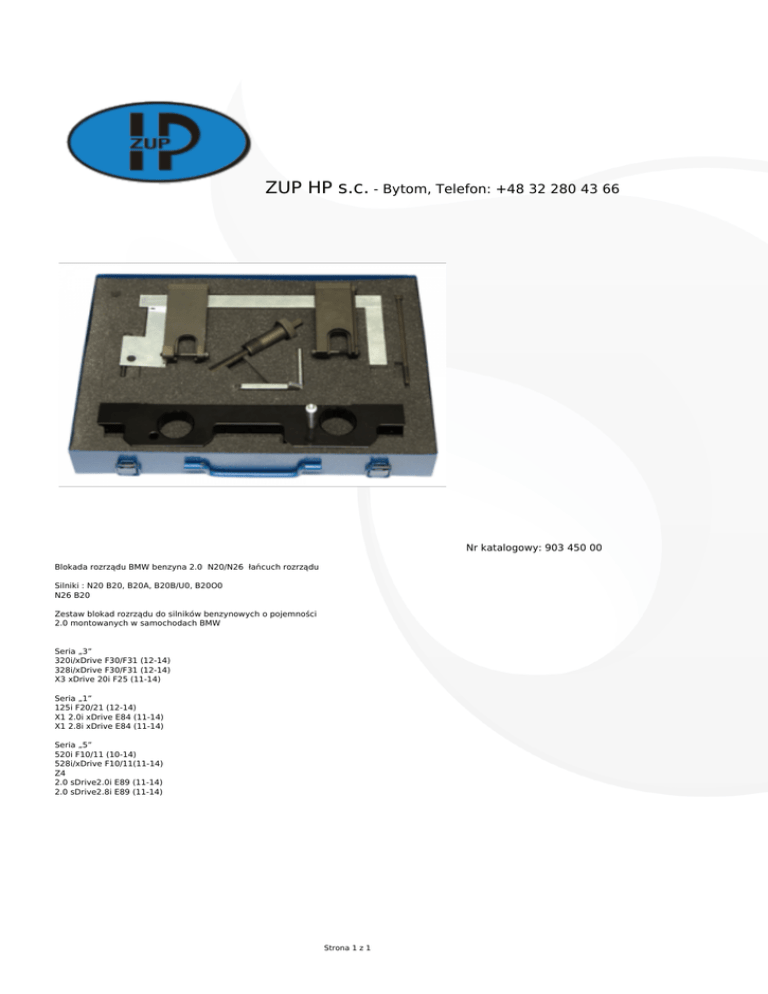 ZUP HP s.c. - Bytom, Telefon: +48 32 280 43 66 Nr katalogowy: 903 450 00 Blokada rozrządu BMW benzyna 2.0 N20/N26 łańcuch rozrządu Silniki : N20 B20, B20A, B20B/U0, B20O0 N26 B20 Zestaw blokad rozrządu do silników benzynowych o pojemności 2.0 montowanych w samochodach BMW Seria „3” 320i/xDrive F30/F31 (12-14) 328i/xDrive F30/F31 (12-14) X3 xDrive 20i F25 (11-14) Seria „1” 125i F20/21 (12-14) X1 2.0i xDrive E84 (11-14) X1 2.8i xDrive E84 (11-14) Seria „5” 520i F10/11 (10-14) 528i/xDrive F10/11(11-14) Z4 2.0 sDrive2.0i E89 (11-14) 2.0 sDrive2.8i E89 (11-14) Strona 1 z 1