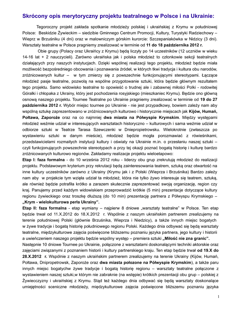 Skrócony opis merytoryczny projektu teatralnego w Polsce i na Ukrainie: Tegoroczny projekt zakłada spotkanie młodzieży polskiej i ukraińskiej z Krymu w południowej Polsce: Beskidzie Żywieckim – siedzibie Gminnego Centrum Promocji, Kultury, Turystyki Radziechowy – Wieprz w Brzuśniku (4 dni) oraz w malowniczym górskim kurorcie: Szczepaniakówka w Nidzicy (3 dni). Warsztaty teatralne w Polsce pragniemy zrealizować w terminie od 11 do 18 października 2012 r. Obie grupy (Polacy oraz Ukraińcy z Krymu) będą liczyły po 14 uczestników (12 uczniów w wieku 14-16 lat + 2 nauczycieli). Zarówno ukraińska jak i polska młodzież to członkowie sekcji teatralnych działających przy naszych instytucjach. Dzięki wspólnej realizacji tego projektu, młodzież będzie miała możliwość bezpośredniego obcowania i poznawania źródeł, w których tkwi tradycja i kultura obu narodów, zróżnicowanych kultur – w tym zmierzy się z powszechnie funkcjonującymi stereotypami. Łączące młodzież pasje teatralne, pozwolą na wspólne przygotowanie sztuki, która będzie głównym rezultatem tego projektu. Samo widowisko teatralne to opowieść o trudnej ale i zabawnej miłości Polki - rodowitej Góralki i chłopaka z Ukrainy, który jest pochodzenia rosyjskiego (mieszkaniec Krymu). Będzie ono główną osnową naszego projektu. Tournee Teatralne po Ukrainie pragniemy zrealizować w terminie od 19 do 27 października 2012 r. Wybór miejsc tournee po Ukrainie - nie jest przypadkowy, bowiem zależy nam aby wspólną sztukę zaprezentowano w zróżnicowanych kulturowo i historycznie miejscach jak Kijów, Humań, Połtawa, Zaporoże oraz na co najmniej dwa miasta na Półwyspie Krymskim. Między występami młodzież weźmie udział w interesujących warsztatach historyczno – kulturowych i sama weźmie udział w odbiorze sztuki w Teatrze Tarasa Szewczenki w Dniepropietrowsku. Wielokrotnie (zwłaszcza po wystawieniu sztuki w danym mieście), młodzież będzie mogła porozmawiać z rówieśnikami, przedstawicielami rozmaitych instytucji kultury i oświaty na Ukrainie m.in. o przesłaniu naszej sztuki – czyli funkcjonujących powszechnie stereotypach a przy tej okazji poznać bogatą historię i kulturę bardzo zróżnicowanych kulturowo regionów. Zakładamy realizacje projektu wieloetapowo: Etap I: faza formalna - do 10 września 2012 roku - liderzy obu grup zrekrutują młodzież do realizacji projektu. Podstawowym kryterium przy rekrutacji będą zainteresowania teatrem, sztuką oraz otwartość na inne kultury uczestników zarówno z Ukrainy (Krymu jak i z Polski (Wieprza i Brzuśnika) Bardzo zależy nam aby w projekcie tym wzięła udział ta młodzież, która nie tylko żywo interesuje się teatrem, sztuką, ale również będzie potrafiła krótko a zarazem skutecznie zaprezentować swoją organizację, region czy kraj. Panujemy przed każdym widowiskiem przeprowadzić krótkie (5 min) prezentacje dotyczące kultury regionu żywieckiego oraz troszkę dłuższą (do 10 min) prezentację partnera z Półwyspu Krymskiego – „Krym - wielokulturowa perła Ukrainy”. Etap II: faza formalna - etap wymiany – najpierw 8 dniowe „warsztaty teatralne” w Polsce. Ten etap będzie trwał od 11.X.2012 do 18.X.2012 r. Wspólnie z naszym ukraińskim partnerem zrealizujemy na terenie południowej Polski (głównie Brzuśnika, Wieprza i Niedzicy), a także innych miejsc bogatych w żywe tradycje i bogatą historię południowego regionu Polski. Każdego dnia odbywać się będą warsztaty teatralne, międzykulturowe zajęcia poświęcone bliższemu poznaniu języka partnera, jego kultury i historii a uwieńczeniem naszego projektu będzie wspólny występ – premiera sztuki „Miłość nie zna granic”. Następnie 10 dniowe Tournee po Ukrainie, połączone z warsztatami doskonalącymi techniki aktorskie oraz zajęciami związanymi z poznaniem historii i kultury partnerskiego kraju. Ten etap będzie trwał od 19.X do 28.X.2012 r. Wspólnie z naszym ukraińskim partnerem zrealizujemy na terenie Ukrainy (Kijów, Humań, Połtawa, Dnipropetrowsk, Zaporoże oraz dwa miasta połozone na Półwyspie Krymskim), a także paru innych miejsc bogatychw żywe tradycje i bogatą historię regionu – warsztaty teatralne połączone z wystawieniem naszej sztuki,w którym nie zabraknie (na wstępie) krótkich prezentacji obu grup – polskiej z Żywiecczyzny i ukraińskiej z Krymu. Stąd też każdego dnia odbywać się będą warsztaty doskonalące umiejętności sceniczne młodzieży, międzykulturowe zajęcia poświęcone bliższemu poznaniu języka 1 partnera, jego kultury i historii. Rezultatem tych działań będzie szereg użytecznych dla młodzieży umiejętności i nowe – tym razem międzynarodowe doświadczenia, zaś widocznym rezultatem będzie realizacja co najmniej pięciu wystawień sztuki: „Miłość nie zna granic” przed ukraińską publicznością. Etap III: faza formalna - etap po wymianie – rozliczenie finansowe oraz sporządzenie sprawozdania merytorycznego projektu. W tej fazie nastąpi też upowszechnienie rezultatów podjętych działań. Zakładamy realizację co najmniej dwóch konferencji prezentujących rezultaty (prezentacje filmu z projektu, prezentacje multimedialne) za porozumieniem z dyrektorami placówek oświatowych - na forum społeczności szkolnej, z której rekrutowana była młodzież biorąca udział w tym projekcie. SKRÓCONY HARMONOGRAM DZIAŁAŃ Z PODZIAŁEM NA DNI: 11.10.2012 Przyjazd NASZEGO partnera z Krymu do Polski (Kraków) warsztaty historyczno – kulturowe w Krakowie i Wadowicach. Wieczorek u polskich rodzin. •przyjazd młodzieży z Ukrainy do Krakowa. Tam tez nastąpi powitanie młodzieży z Krymu przez młodzież z Polski, która na tę okoliczność będzie w strojach regionalnych (Górali Żywieckich). •młodzież weźmie udział w warsztatach na temat historii i kultury regionu Małopolski (historia i kultura związana z Zamkiem 