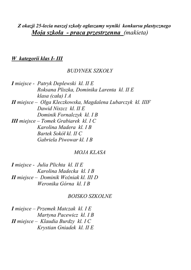 Z okazji 25-lecia naszej szkoły ogłaszamy wyniki konkursu plastycznego Moja szkoła - praca przestrzenna (makieta) W kategorii klas I- III BUDYNEK SZKOŁY I miejsce - Patryk Deplewski kl. II E Roksana Pliszka, Dominika Larenta kl. II E klasa (cała) I A II miejsce – Olga Kleczkowska, Magdalena Lubarczyk kl. IIIF Dawid Niszcz kl. II E Dominik Fornalczyk kl. I B III miejsce – Tomek Grabiarek kl. I C Karolina Madera kl. I B Bartek Sokół kl. II C Gabriela Piwowar kl. I B MOJA KLASA I miejsce - Julia Plichta kl. II E Karolina Madecka kl. I B II miejsce – Dominik Woźniak kl. III D Weronika Górna kl. I B BOISKO SZKOLNE I miejsce – Przemek Matczak kl. I E Martyna Pacewicz kl. I B II miejsce – Klaudia Burdzy kl. I C Krystian Gniadek kl. II E W kategorii klas IV I miejsce - Klaudia Berechowska i Agata Rojewska kl. IV C II miejsce – Iza Suchy i Mateusz Witczak kl. IV D III miejsce – Aleksandra Sprawka kl. IV D W kategorii klas V I miejsce – Marta Grela , Ewa Gierszewska i Kamila Wołoszyn kl. V E II miejsce – Karolina Komisarczyk kl. V B III miejsce - Adraian Obolik, Dawid Świadek, Maciej Rutyna kl. V E WyróŜnienie: Aleksandra Burdzik, Katarzyna Retkiewicz, Dominika Lach kl. V E W kategorii klas VI I miejsce – Justyna Kadzińska i Cecylia Gałgan kl. VI D Organizatorzy: Małgorzata Pantoł, Hanna Słomska