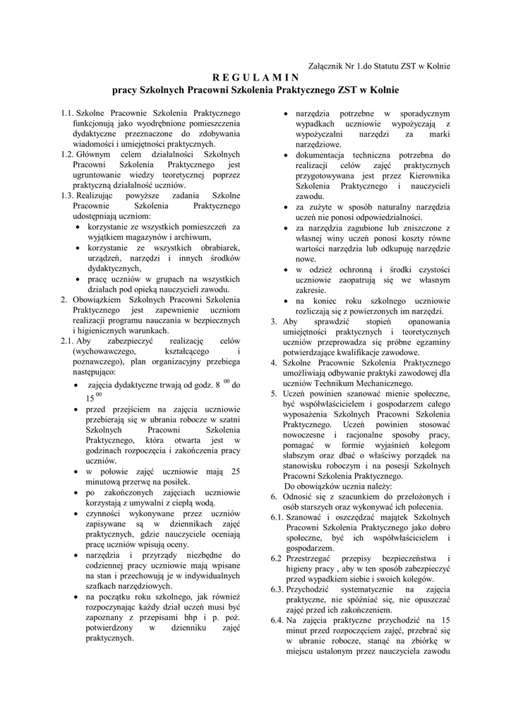 Załącznik Nr 1.do Statutu ZST w Kolnie REGULAMIN pracy Szkolnych Pracowni Szkolenia Praktycznego ZST w Kolnie 1.1. Szkolne Pracownie Szkolenia Praktycznego funkcjonują jako wyodrębnione pomieszczenia dydaktyczne przeznaczone do zdobywania wiadomości i umiejętności praktycznych. 1.2. Głównym celem działalności Szkolnych Pracowni Szkolenia Praktycznego jest ugruntowanie wiedzy teoretycznej poprzez praktyczną działalność uczniów. 1.3. Realizując powyższe zadania Szkolne Pracownie Szkolenia Praktycznego udostępniają uczniom:  korzystanie ze wszystkich pomieszczeń za wyjątkiem magazynów i archiwum,  korzystanie ze wszystkich obrabiarek, urządzeń, narzędzi i innych środków dydaktycznych,  pracę uczniów w grupach na wszystkich działach pod opieką nauczycieli zawodu. 2. Obowiązkiem Szkolnych Pracowni Szkolenia Praktycznego jest zapewnienie uczniom realizacji programu nauczania w bezpiecznych i higienicznych warunkach. 2.1. Aby zabezpieczyć realizację celów (wychowawczego, kształcącego i poznawczego), plan organizacyjny przebiega następująco:  zajęcia dydaktyczne trwają od godz. 8 00       00 do 15 przed przejściem na zajęcia uczniowie przebierają się w ubrania robocze w szatni Szkolnych Pracowni Szkolenia Praktycznego, która otwarta jest w godzinach rozpoczęcia i zakończenia pracy uczniów. w połowie zajęć uczniowie mają 25 minutową przerwę na posiłek. po zakończonych zajęciach uczniowie korzystają z umywalni z ciepłą wodą. czynności wykonywane przez uczniów zapisywane są w dziennikach zajęć praktycznych, gdzie nauczyciele oceniają pracę uczniów wpisują oceny. narzędzia i przyrządy niezbędne do codziennej pracy uczniowie mają wpisane na stan i przechowują je w indywidualnych szafkach narzędziowych. na początku roku szkolnego, jak również rozpoczynając każdy dział uczeń musi być zapoznany z przepisami bhp i p. poż. potwierdzony w dzienniku zajęć praktycznych.  narzędzia potrzebne w sporadycznym wypadkach uczniowie wypożyczają z wypożyczalni narzędzi za marki narzędziowe.  dokumentacja techniczna potrzebna do realizacji celów zajęć praktycznych przygotowywana jest przez Kierownika Szkolenia Praktycznego i nauczycieli zawodu.  za zużyte w sposób naturalny narzędzia uczeń nie ponosi odpowiedzialności.  za narzędzia zagubione lub zniszczone z własnej winy uczeń ponosi koszty równe wartości narzędzia lub odkupuję narzędzie nowe.  w odzież ochronną i środki czystości uczniowie zaopatrują się we własnym zakresie.  na koniec roku szkolnego uczniowie rozliczają się z powierzonych im narzędzi. 3. Aby sprawdzić stopień opanowania umiejętności praktycznych i teoretycznych uczniów przeprowadza się próbne egzaminy potwierdzające kwalifikacje zawodowe. 4. Szkolne Pracownie Szkolenia Praktycznego umożliwiają odbywanie praktyki zawodowej dla uczniów Technikum Mechanicznego. 5. Uczeń powinien szanować mienie społeczne, być współwłaścicielem i gospodarzem całego wyposażenia Szkolnych Pracowni Szkolenia Praktycznego. Uczeń powinien stosować nowoczesne i racjonalne sposoby pracy, pomagać w formie wyjaśnień kolegom słabszym oraz dbać o właściwy porządek na stanowisku roboczym i na posesji Szkolnych Pracowni Szkolenia Praktycznego. Do obowiązków ucznia należy: 6. Odnosić się z szacunkiem do przełożonych i osób starszych oraz wykonywać ich polecenia. 6.1. Szanować i oszczędzać majątek Szkolnych Pracowni Szkolenia Praktycznego jako dobro społeczne, być ich współwłaścicielem i gospodarzem. 6.2 Przestrzegać przepisy bezpieczeństwa i higieny pracy , aby w ten sposób zabezpieczyć przed wypadkiem siebie i swoich kolegów. 6.3. Przychodzić systematycznie na zajęcia praktyczne, nie spóźniać się, nie opuszczać zajęć przed ich zakończeniem. 6.4. Na zajęcia praktyczne przychodzić na 15 minut przed rozpoczęciem zajęć, przebrać się w ubranie robocze, stanąć na zbiórkę w miejscu ustalonym przez nauczyciela zawodu prowadzącego zajęcia w grupie. Na dzwonek o 00 godz. 8 .grupy powinny być ustawione, należy zachować ciszę, za co odpowiedzialnym jest dyżurny grupy. 6.5. Wysłuchać dokładnie instruktażu prowadząc jednocześnie notatki w zeszycie zajęć praktycznych. W przypadku wątpliwości o wyjaśnienie zwrócić się do nauczyciela prowadzącego zajęcia w grupie. 6.6. Po instruktażu i utrzymaniu pracy należy pobrać z wypożyczalni potrzebne narzędzia, sprawdzić imadło lub obrabiarkę, zorganizować w sposób przepisowy stanowisko robocze. 6.7. Otrzymaną pracę należy wykonać ściśle wg otrzymanej dokumentacji a jeżeli uczeń widzi możliwości polepszenia sposobu wykonania, zwraca się z wnioskiem do nauczyciela i za jego zgodą pracuje wg swego pomysłu. 6.8. Przy pracy na obrabiarkach należy pracować ściśle wg instrukcji i wskazówek nauczyciela, by nie ulec wypadkowi. 6.9. Przez cały czas pracy dbać o kulturę miejsca pracy zapewniając tym samym sprawniejsze i bezpieczniejsze wykonanie pracy. 6.10. Prowadzić dzienniczek zajęć praktycznych i dbać o jego prawidłowe i estetyczne prowadzenie. 6.11. W czasie pracy nie opuszczać stanowiska roboczego i nie przeszkadzać w pracy kolegom. Stanowisko robocze uczeń może opuścić tylko za zgodą nauczyciela. Odejście i przyjście meldować należy nauczycielowi. 6.12. Wyjście do miasta w czasie zajęć może nastąpić za zgodą nauczyciela po przebraniu się w ubranie wyjściowe. 6.13. Po skończonej pracy zdać narzędzia do wypożyczalni, sprzątnąć stanowisko robocze, umyć się, przebrać i opuścić Szkolne Pracownie Szkolenia Praktycznego. 6.14. Oszczędzać narzędzia i materiały. 7. N A G R O D Y I K A R Y 7.1. Uczniowie, którzy sumiennie spełniają swoje obowiązki i wykazują się wzorowym zachowaniem otrzymają pochwały i nagrody. 7.2. Uczniowie, którzy postępują niezgodnie z regulaminem pracy szkoły karani są upomnieniem, naganą, aż do 