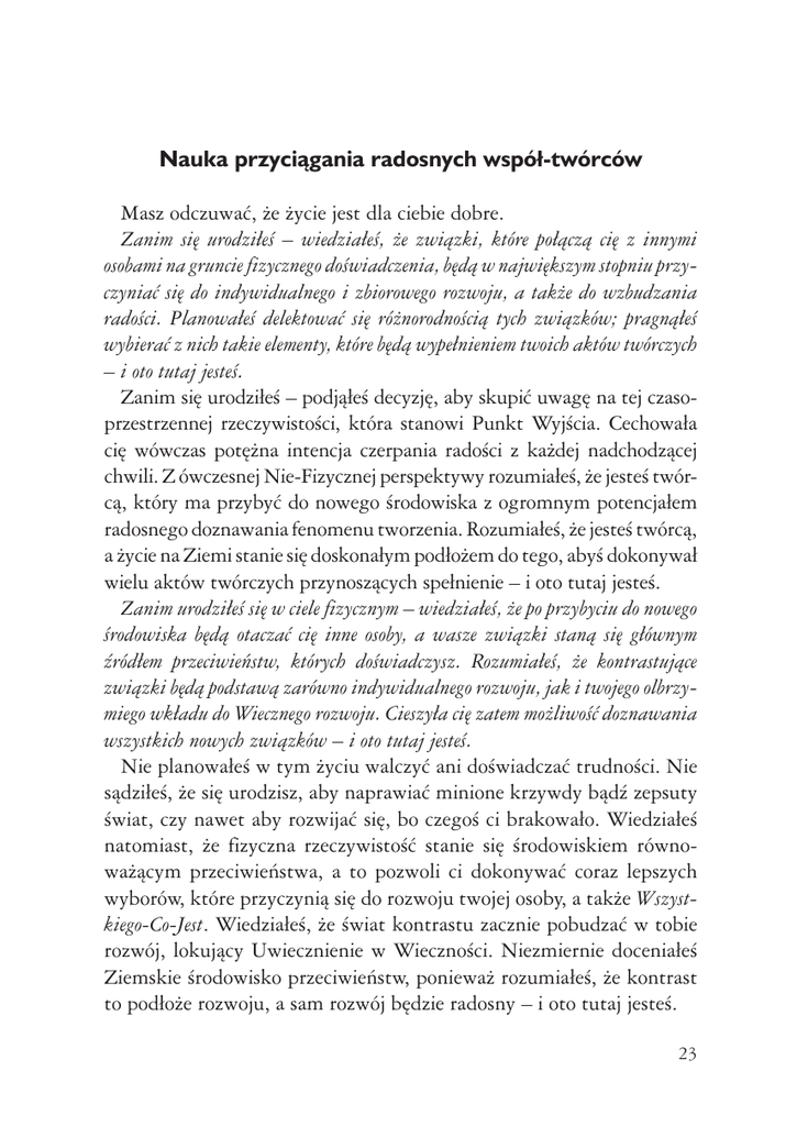 Nauka przyciągania radosnych współ-twórców Masz odczuwać, że życie jest dla ciebie dobre. Zanim się urodziłeś – wiedziałeś, że związki, które połączą cię z innymi osobami na gruncie fizycznego doświadczenia, będą w największym stopniu przyczyniać się do indywidualnego i zbiorowego rozwoju, a także do wzbudzania radości. Planowałeś delektować się różnorodnością tych związków; pragnąłeś wybierać z nich takie elementy, które będą wypełnieniem twoich aktów twórczych – i oto tutaj jesteś. Zanim się urodziłeś – podjąłeś decyzję, aby skupić uwagę na tej czasoprzestrzennej rzeczywistości, która stanowi Punkt Wyjścia. Cechowała cię wówczas potężna intencja czerpania radości z każdej nadchodzącej chwili. Z ówczesnej Nie-Fizycznej perspektywy rozumiałeś, że jesteś twórcą, który ma przybyć do nowego środowiska z ogromnym potencjałem radosnego doznawania fenomenu tworzenia. Rozumiałeś, że jesteś twórcą, a życie na Ziemi stanie się doskonałym podłożem do tego, abyś dokonywał wielu aktów twórczych przynoszących spełnienie – i oto tutaj jesteś. Zanim urodziłeś się w ciele fizycznym – wiedziałeś, że po przybyciu do nowego środowiska będą otaczać cię inne osoby, a wasze związki staną się głównym źródłem przeciwieństw, których doświadczysz. Rozumiałeś, że kontrastujące związki będą podstawą zarówno indywidualnego rozwoju, jak i twojego olbrzymiego wkładu do Wiecznego rozwoju. Cieszyła cię zatem możliwość doznawania wszystkich nowych związków – i oto tutaj jesteś. Nie planowałeś w tym życiu walczyć ani doświadczać trudności. Nie sądziłeś, że się urodzisz, aby naprawiać minione krzywdy bądź zepsuty świat, czy nawet aby rozwijać się, bo czegoś ci brakowało. Wiedziałeś natomiast, że fizyczna rzeczywistość stanie się środowiskiem równoważącym przeciwieństwa, a to pozwoli ci dokonywać coraz lepszych wyborów, które przyczynią się do rozwoju twojej osoby, a także Wszystkiego-Co-Jest. Wiedziałeś, że świat kontrastu zacznie pobudzać w tobie rozwój, lokujący Uwiecznienie w Wieczności. Niezmiernie doceniałeś Ziemskie środowisko przeciwieństw, ponieważ rozumiałeś, że kontrast to podłoże rozwoju, a sam rozwój będzie radosny – i oto tutaj jesteś. 23 Zanim urodziłeś się w ciele fizycznym – znałeś moc różnorodności, bowiem rozumiałeś, że każdy nowy wybór, pragnienie i idea narodzą się z przeciwieństw. Wiedziałeś, że kontrast będzie dla ciebie nie tylko najprawdziwszą podstawą rozwoju, lecz również fundamentem radosnego doświadczenia. A przede wszystkim wiedziałeś, że radosne doświadczenie stanie się ostateczną przyczyną wszelkich cząstek tego Istnienia. Wiedziałeś, że wszystko istnieje dla radosnych chwil, jakie będą nieustannie ogarniać twoją świadomość – i oto tutaj jesteś. Zanim się urodziłeś – rozumiałeś, że kontrast dostarczy ci różnorodności, z której zaczniesz wybierać. Wiedziałeś, że otaczające cię środowisko stanie się niczym rozpostarty przed tobą zestaw dań, z którego zaczniesz wybierać. Wiedziałeś, że w tym środowisku wszystko będzie ulegać przemianie z powodu twoich ciągle nowych decyzji – i oto tutaj jesteś. Zanim się urodziłeś – rozumiałeś, że każdy wybór wynika ze skupiania na czymś uwagi. Wiedziałeś, że niedługo skupisz Świadomość na ciele fizycznym i czasoprzestrzennej rzeczywistości. Wiedziałeś, że zaczniesz dokonywać wyborów z zestawu kontrastujących elementów, które cię otoczą, wnikając w twoją uwagę, skupienie bądź myśl – i oto tutaj jesteś. Zanim się urodziłeś – rozumiałeś, że środowisko Ziemi, tak jak wszystkie środowiska fizyczne i Nie-Fizyczne, opiera się na Wibracji, a rządzi nim Prawo Przyciągania, czyli Prawo, według którego to, co istnieje, przyciąga do siebie podobne. Wiedziałeś, że skupiając się na czymś, stworzysz określony związek – i oto tutaj jesteś. Zanim się urodziłeś – rozważałeś Ziemskie doświadczenie i nie prosiłeś o narodziny w środowisku identyczności ani zgodności, w którym całą różnorodność już rozpatrzono i wszystkie decyzje na temat sposobu życia już powzięto. Nie prosiłeś o to, gdyż jesteś potężnym twórcą, który miał się tutaj pojawić, aby osobiście podejmować decyzje i tworzyć radosne doznania. Wiedziałeś, że różnorodność stanie się najlepszym przyjacielem, a dostosowanie będzie przeciwieństwem na każdym poziomie. Całym sobą pragnąłeś odszukać punkty oparcia i jako istotny, potężny obserwator wniknąć w otaczający cię kontrast, aby wyodrębniać akty twórcze – i oto tutaj jesteś. Ludzie często zamartwiają się, a czasem są rozgniewani, z powodu utraty świadomości decyzji, które podejmowali przed narodzinami. Powinieneś jednak wiedzieć, że pojawiłeś się w ciele fizycznym z czymś, co 24 pozostało nienaruszone. Urodziłeś się z osobistym Systemem Kierowania, który na każdym kroku – przy każdej myśli – podczas wędrówki w obrębie czasoprzestrzennej rzeczywistości ma cię informować o tym, kiedy porzucasz zrozumie życia sprzed narodzin, a kiedy podążasz właściwym torem. Pragniemy, abyś stał się świadomy indywidualnego Systemu Kierowania, co pozwoli ci dokonywać aktów twórczych w synchronizacji z trwałością Nie-Fizycznej wiedzy. Pragniemy pomóc ci odnowić kontakt z tym, kim-ty-naprawdę-jesteś i zastąpić niekończący się ciąg fałszywych założeń – które błędnie wybrałeś podczas wędrówki w obrębie fizycznego obszaru – Uniwersalnymi regułami wynikającymi z Prawa. Pragniemy pomóc ci rozwiązać tajemnicę pozornie niemożliwych do utworzenia związków; pragniemy pomóc ci określić szczegółowo zasady dzielenia się tą planetą z miliardami innych jej mieszkańców. Pragniemy pomóc ci odkryć na 