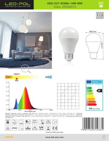 E27 ORO-E27-ROMA-14W-WW Index: ORO04014 LED LED 112 mm Ø60 mm 3000 K 2700 K 6500 K WW IJA 1.2 A++ A+ A B C D E 1.0 0.8 0.6 0.4 0.2 0.0 350 513 675 Wavelength(nm) 838 A+ 14 kWh/1000h 1000 Rozkład widmowy mocy w zakresie 180–800 nm • Spectral power distribution in the range 180–800 nm • Spektrale Strahlungsverteilung im Bereich 180–800 nm • La distribuzione dello spettro di potenza nella gamma 180–800 nm • Spektrální rozložení světla v rozmezí 180–800 nm • Krivka spektrálneho rozdelenia v rozpätí 180–800 nm • Спектральном диапазоне 180–800 нм E27 AC 220–240 V ~50 Hz IP20 20000 x 15000 h 40 °C –15 CRI Ra≥80 50 g Hg 0,0 mg Lampa do użytku domowego www.led-pol.com 1 E27 ORO-E27-ROMA-14W-WW Index: ORO04014 dane elektryczne • electrical data • elektrische daten • caratteristiche elettriche • elektrické parametry • elektrické vlastnosti • Электрические характеристики 15000 h 220–240 V Nominalny okres trwałości lampy • Nominal lifetime of lamp • Nennlebensdauer der Lampe • La vita nominale della lampada • Typová životnost světelného zdroje • Nominálna životnosť svetelného zdroja • Номинальный срок службы ламп 120 mA Liczba cykli włącz / wyłącz • Number of switching cycles • Zahl der Schaltzyklen • Il numero di cicli di accensione • Počet spínacích cyklů do poruchy • Počet spínacích cyklov • Количество циклов включения 20000 Moc • Power • Leistung • Potenza • Příkon • Výkonu • Мощность 14 W Napięcie • Voltage • Spannung • Tensione • Napětí • Napätie • Напряжение Pobór prądu przez lampę • Current consumption by lamp • Stromaufnahme der Lampe • Consumo di corrente della lampada • Spotřeba proudu lampy • Spotreba prúdu lampy • Ток потребления лампы Współczynnik mocy lampy (pf) • Lamp power factor (pf) • Elektrischer Leistungsfaktor der Lampe (pf) • Il fattore di potenza della lampada (pf) • Účiník světelného zdroje (pf) • Koeficient výkonu svetelného zdroja (pf) • Коэффициент мощности (pf) Możliwość przyciemniania • Dimmed • Dimmern Variatore • Stmívač • Reostat • Регулируемая яркость • trwaŁość lampy • lifetime of lamp • lebensdauer der lampe • durata della lampada • životnost lampy • životnosť lampy • Срок службы AC >0,5 NIE (NOT) wŁaściwości światŁa • properties of light • eigenschaften von licht • proprietà della luce • vlastnosti světla • vlastnosti svetla • Параметры светового излучения wymiary i waga • lamp dimensions and weight • abmessungen und gewicht • dimensioni e peso • rozměry a váha • rozmery a hmotnosť • Размеры и вес Długość całkowita • Total length • Gesamtlänge • Lunghezza totale • Celková délka • Celková dĺžka • Высота 112 mm Maksymalna średnica • Largest diameter • Größter durchmesser • Diametro massimo • Největší průměr • Najväčší priemer • Ширина 60 mm Waga • Weight • Gewicht • Peso • Váha • Hmotnosti • Вес Nominalny użyteczny strumień świetlny • Nominal useful luminous flux • Nomineller Nutzlichtstrom • Il flusso luminoso nominale utile • Typový užitečný světelný tok • Nominálny užitočný svetelný tok • Номинальная полезная потока 1251 lm Nominalny strumień świetlny • Nominal luminous flux • Nomineller Lichtstrom • Il flusso luminoso nominale • Typový světelný tok • Nominálny svetelný tok • Световая отдача [лм] 1251 lm Nominalny kąt promieniowania • Nominal beam angle • Nomineller Halbwertswinkel • L’angolo del fascio di luce nominale • Typový úhel poloviční svítivosti • Nominálny uhol svetelného zväzku • Номинальный угол освещения 200° Temperatura barwowa • Colour temperature • Farbtemperatur • La temperatura di colore • Teplota chromatičnosti • Teplota farby • Цветовая температура 3000 K Czas nagrzewania się lampy do 60% pełnego strumienia świetlnego • Warm-up time up to 60% of the full light output • Anlaufzeit bis zur Erreichung von 60% des vollen Lichtstroms • Il tempo di avvio fino al 60% della piena emissione luminosa • Zahřívací doba do 60% plného světelného výkonu • Čas na zahriatie do 60% z celkového svetelného výkonu • Продолжительность прогревания 60% светового излучения <1 s Czas startu • Starting time • Startzeit • Il tempo di innesco • Startovací doba • Čas na zapnutie • Время начала <0,5 s Współczynnik zachowania strumienia świetlnego na zakończenie nominalnego okresu trwałości (LLMF) • Lumen maintenance factor (LLMF) • Lampenlichtstromerhalt (LLMF) • Il fattore di mantenimento del flusso luminoso (LLMF) • Činitel stárnutí světelného zdroje (LLMF) • Koeficient zachovania svetelného toku (LLMF) • Коэффициент стабильности светового потока (LLMF) 0,7 Wskaźnik oddawania barw CRI [Ra] • Colour rendering [Ra] • Farbwiedergabe [Ra] • La resa del colore [Ra] • Podání barev [Ra] • Podanie farieb [Ra] • Цветопередача [Ra] ≥80 Jednolitość barwy [SDCM] • Colour consistency [SDCM] • Farbkonsistenz [SDCM] • La coerenza dei colori [SDCM] • Zachování barev [SDCM] • Farebná konzistencia [SDCM] • Цветность [SDCM]) ≤6 50 g wartości znamionowe • rated values • bemessungswert • valore dichiarato • jmenovitou hodnotou • menovitá hodnot • Номинальные значения Moc znamionowa • Rated power • Nennleistung • La potenza nominale • Jmenovitý v