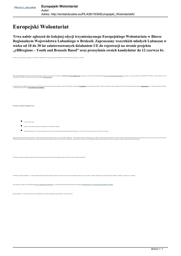 Europejski Wolontariat Autor: Adres: http://wrotalubuskie.eu/PL/426/1636/Europejski_Wolontariat/k/ Europejski Wolontariat Trwa nabór zgłoszeń do kolejnej edycji trzymiesięcznego Europejskiego Wolontariatu w Biurze Regionalnym Województwa Lubuskiego w Brukseli. Zapraszamy wszystkich młodych Lubuszan w wieku od 18 do 30 lat zainteresowanych działaniem UE do rejestracji na stronie projektu „yBBregions – Youth and Brussels Based” oraz przesyłania swoich kandydatur do 12 czerwca br. Wybrany w procesie rekrutacji wolontariusz od 1 września do 30 listopada 2015 r. będzie wspierać prace lubuskiego biura w Brukseli i poznawać instytucje UE „od kuchni”. Do 12 czerwca 2015 roku zapraszamy wszystkich młodych Lubuszan zainteresowanych odbyciem wolontariatu orazspełniających kryteria kwalifikowalności do rejestracji na stronie internetowej projektu yBBregionshttp://www.ybbregions.eu.org/index.php/pl/, zaznaczenia w stworzonym profilu opcji „INTEREST EVS WINTER 2” a także przesłanie CV i listu wyjaśniającego chęć udziału w tym działaniu na adres mailowy BRWL ([email protected]). Europejski Wolontariat „yBBregions” skierowany jest do wszystkich osób zainteresowanych codziennym funkcjonowaniem Unii Europejskiej, od kandydatów nie wymaga się wiedzy specjalistycznej, studiów w obszarze europeistyki, stosunków międzynarodowych, prawa itd. Najważniejszym kryterium jest duża motywacja oraz ze względu na specyfikę wolontariatu w międzynarodowym środowisku – dobra znajomość języka angielskiego. Do udziału w wolontariacie kwalifikują się osoby: w wieku od 18 do 30 lat; urodzone w Województwie Lubuskim i /lub mieszkające w Województwie Lubuskim; zatrudnione lub bezrobotne w tym osoby poszukujące pierwszej pracy i/lub będące uczniami lub studentami instytucji edukacyjnych, w tym uczelni wyższych mieszczących się w Województwie Lubuskim. Europejski Wolontariat (European Voluntary Service - EVS) jest jednym z dwóch działań realizowanych w ramach projektu “yBBregions – Youth and Brussels Based” współfinansowanego ze środków wspólnotowego program Młodzież w działaniu. Projekt realizują Województwo Lubuskie, włoska Abruzja, słowacki Kraj Presozwski oraz chorwacki region Dubrownik-Neretwa poprzez swoje biura regionalne w Brukseli. Celem projektu jest nieformalne uczenie, zdobywanie wiedzy i doświadczenia a także podnoszenie świadomości o Unii Europejskiej, funkcjonowaniu jej instytucji oraz wiedzy o inicjatywach i politykach wspólnotowych wśród ludzi młodych. W III edycji wolontariatu europejskiego wezmą udział cztery osoby po jednej z regionów: Województwa Lubuskiego, Kraju Preszowskiego, Abruzji oraz Dubrownika-Neretwy. Wolontariuszom projektu „yBBregions...” w ramach stypendium zapewnione zostanie wspólne zakwaterowanie, środki na wyżywienie, bilety komunikacji miejskiej oraz tzn. „kieszonkowe” zgodnie z tygodniowym ryczałtem EVS programu „Młodzież w działaniu”, a także przelot do i z Brukseli. Więcej informacji o projekcie na stronie yBBregions http://www.ybbregions.eu.org/index.php/pl/ oraz stronie Urzędu Marszałkowskiego Województwa Lubuskiego: http://lubuskie.pl/news/17155/16/Drugi-rok-program-Mlodziez-w-dzialaniu/ Projekt „yBBregions – Youth and Brussels Based” jest współfinansowany ze środków europejskiego programu Młodzież w działaniu 2007-2013. strona 1 / 1 Powered by TCPDF (www.tcpdf.org)